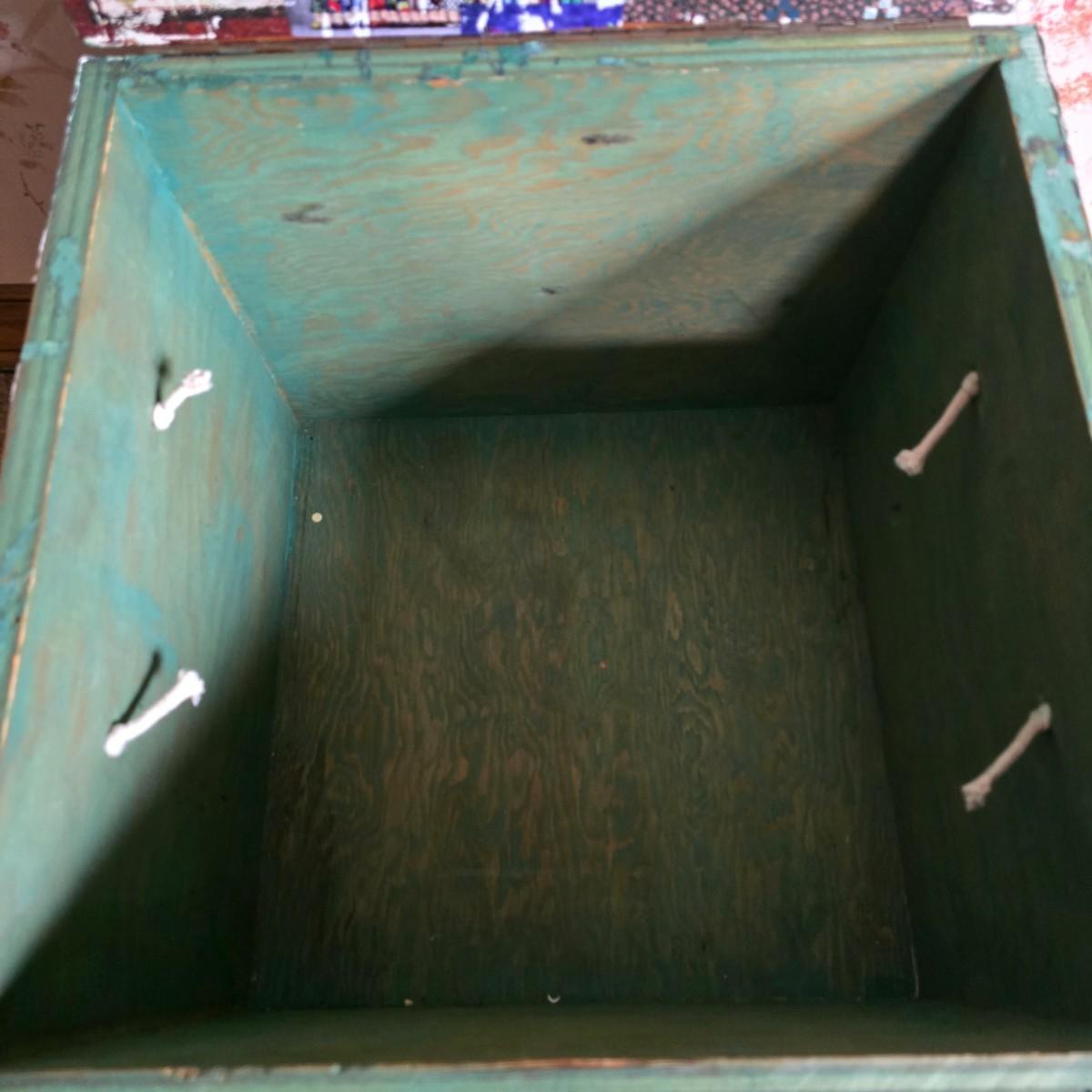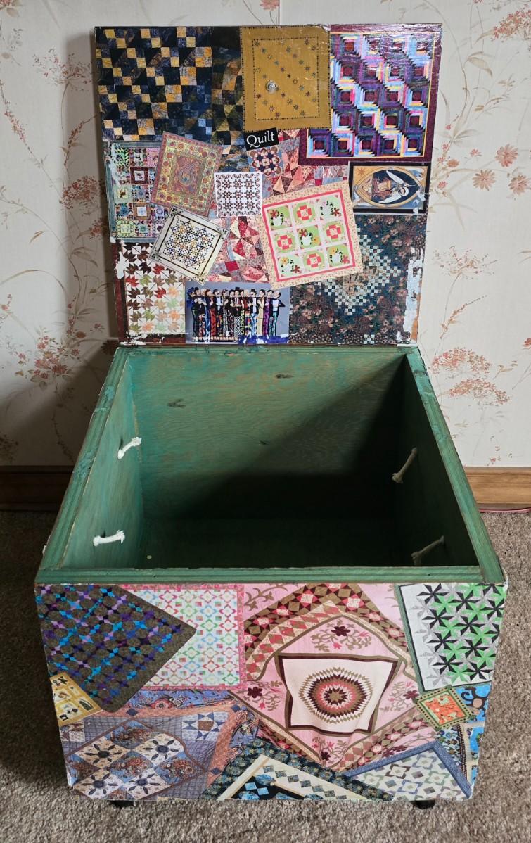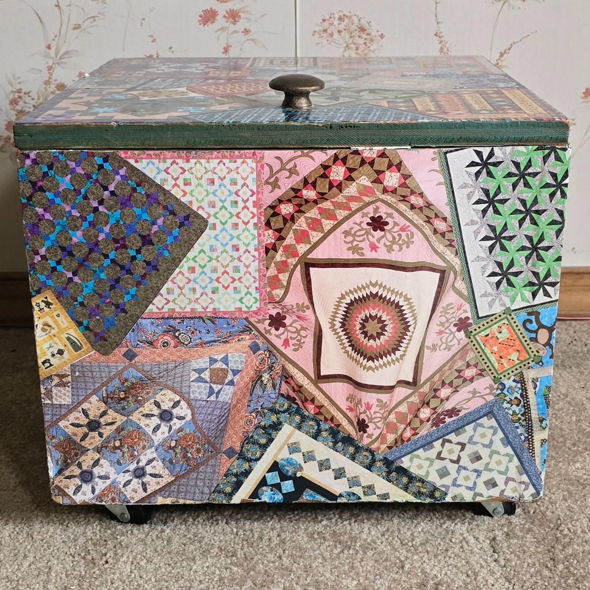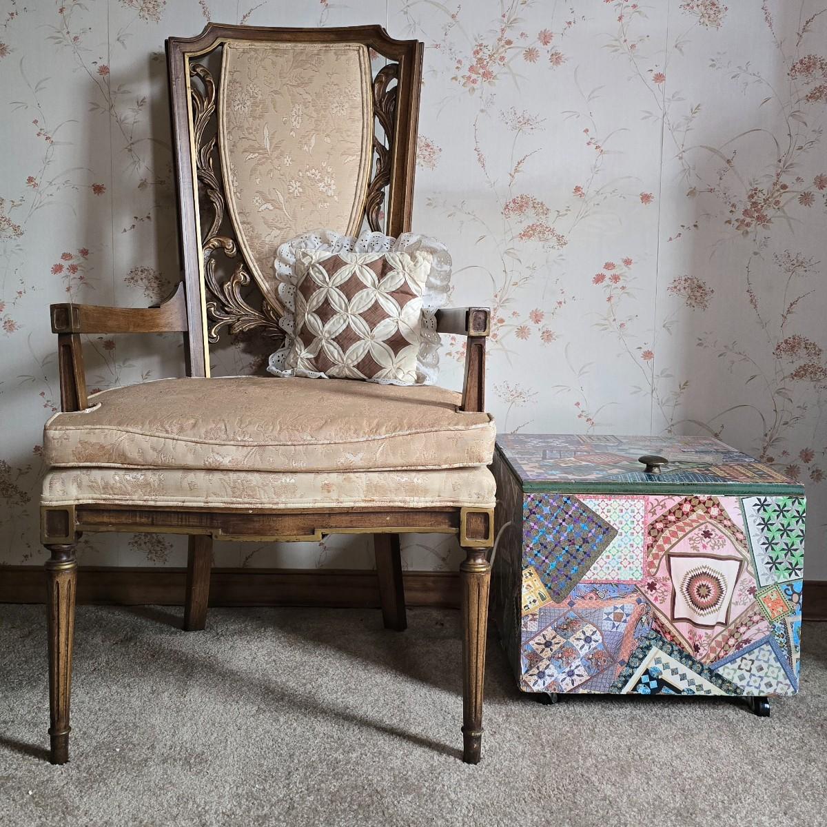 LOT 110L: Antique Armchair and Decoupaged Quilt Box on wheels