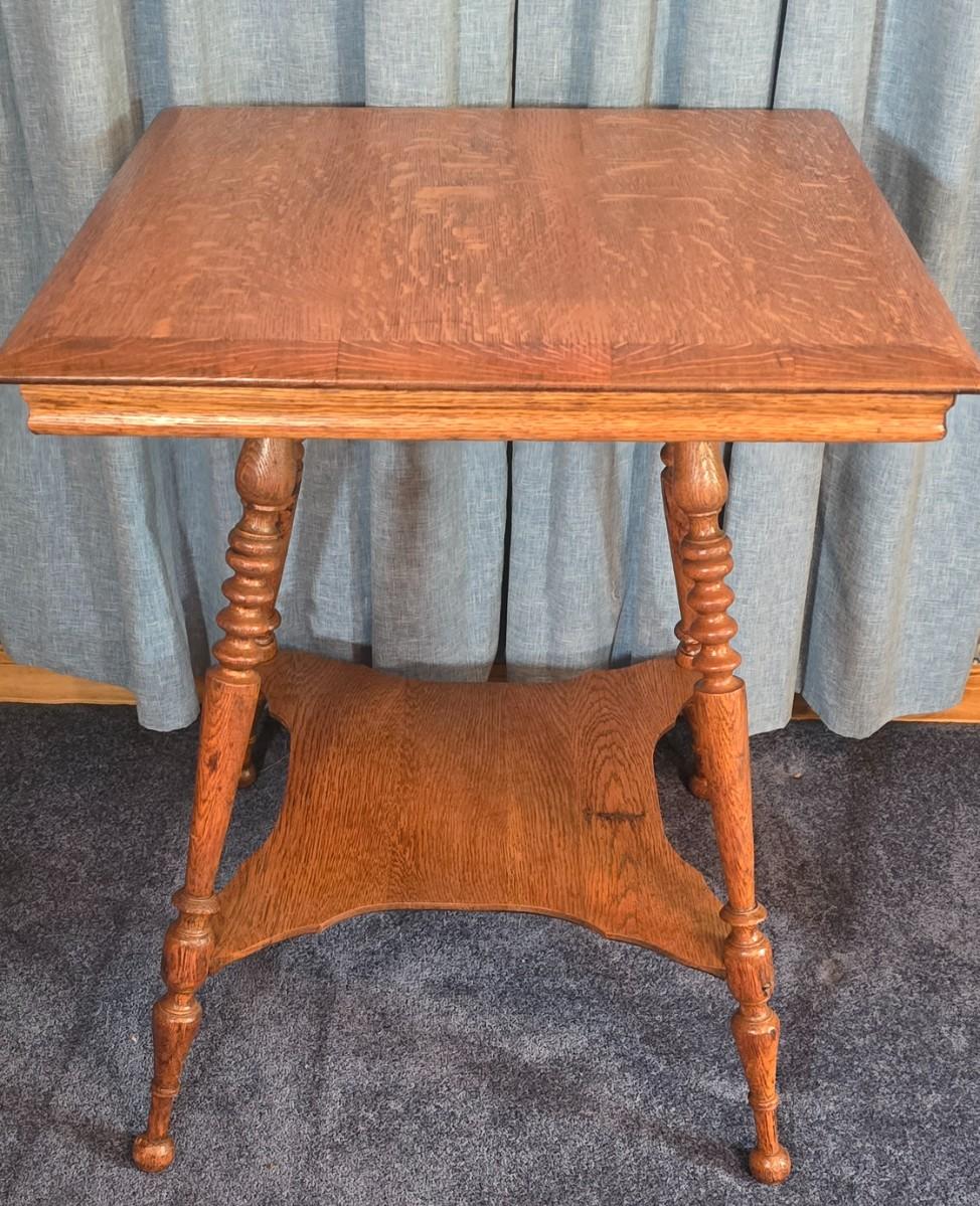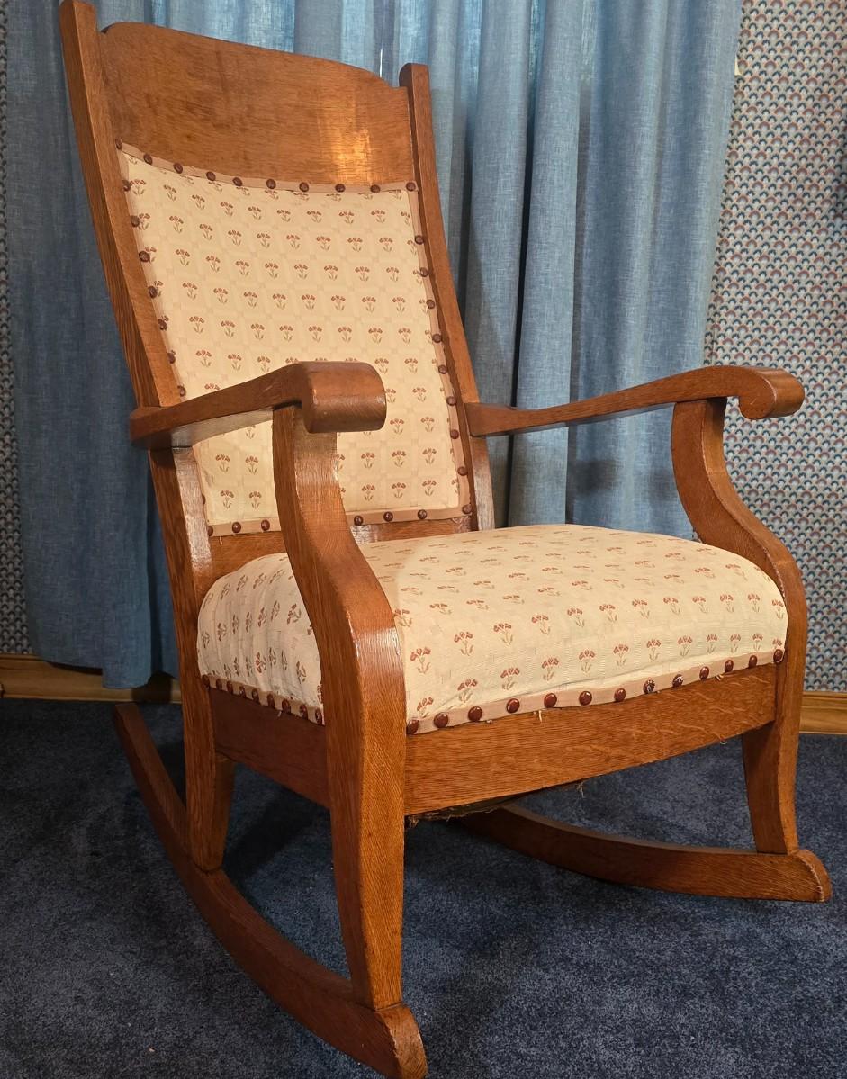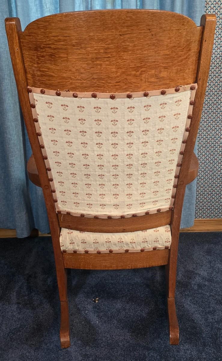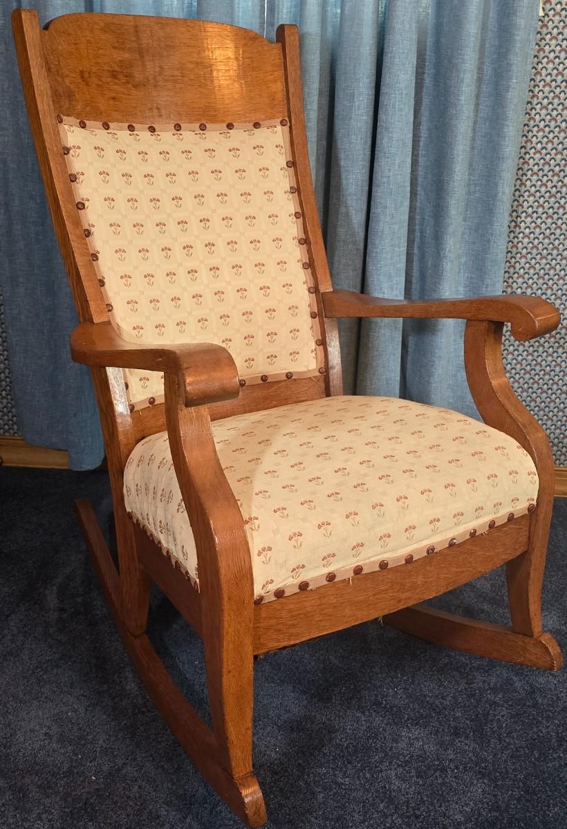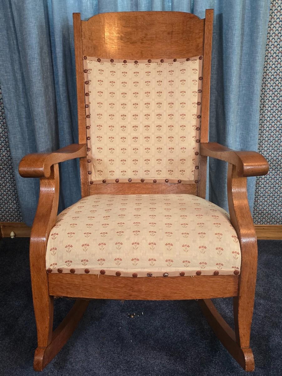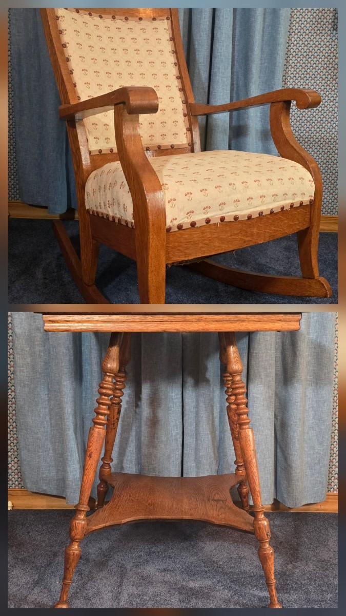 LOT 119Y: Restored Antique Oak Rocking Chair and Two Tier Oak Parlor Table
