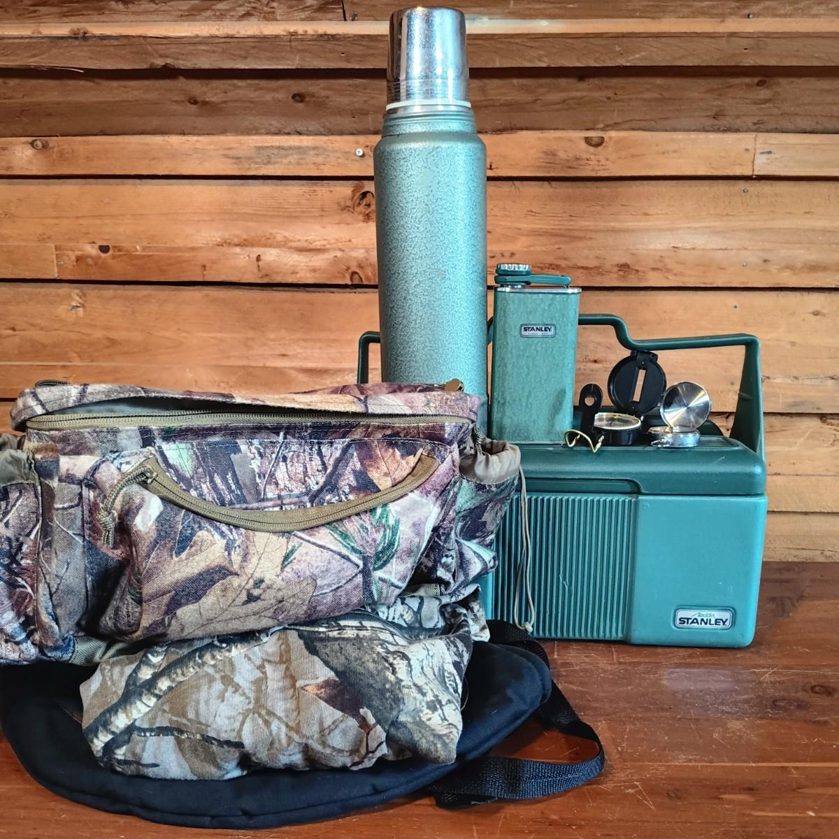 LOT 27: Vintage Stanley Thermos, Canteen and Lunch Box with Compasses Camo Pack & More