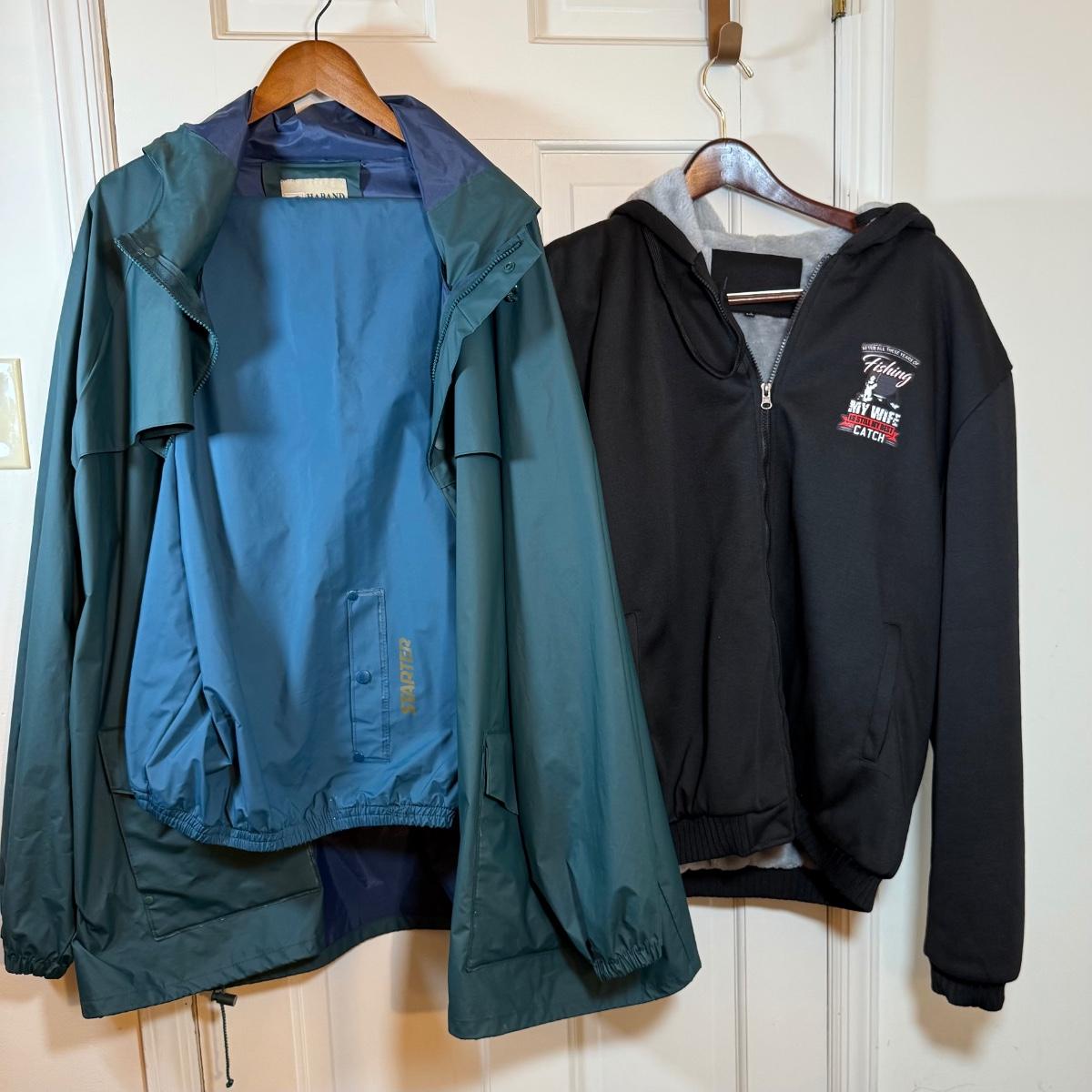 LOT 48: Haband Raincoat /Jacket and Starter Rain Paints and a Fishing Fleece Sweat Shirt Size 3XL