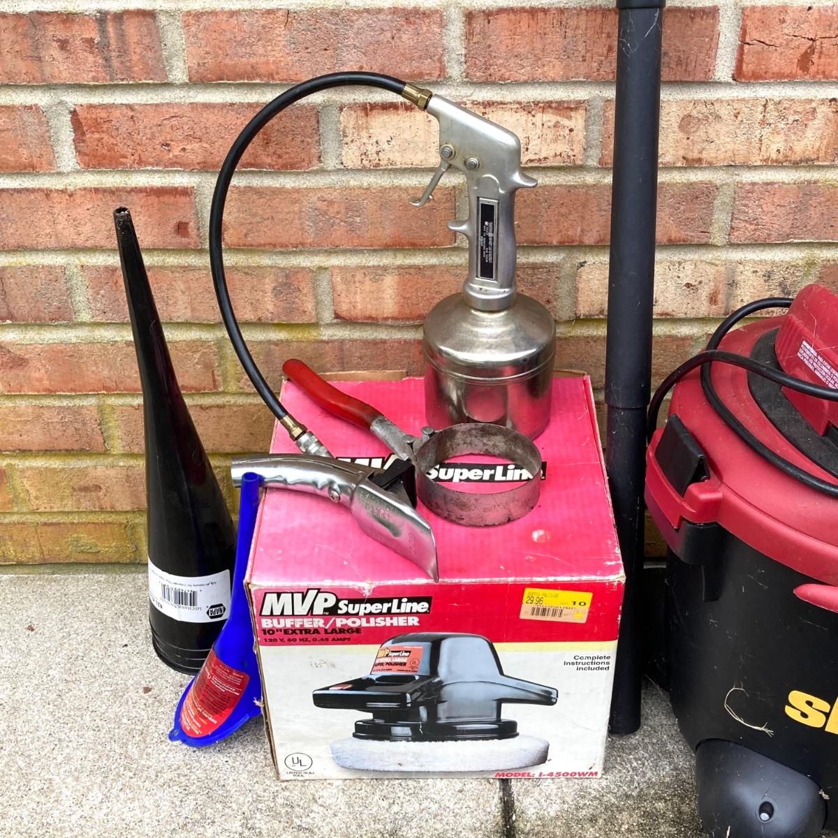 LOT 73: Shop Vac Model MAC12-200D, Buffer in Box and Oil Changing Tools
