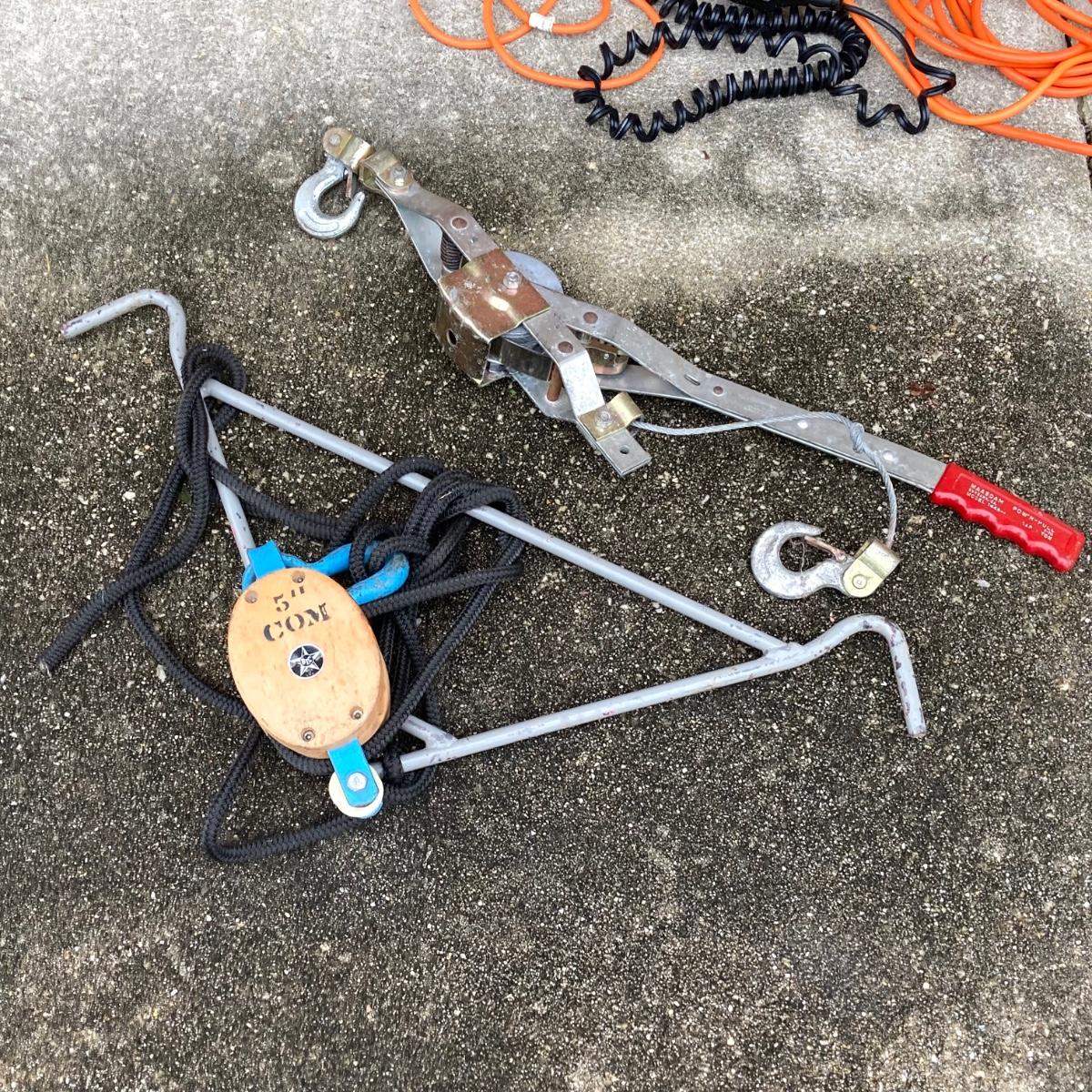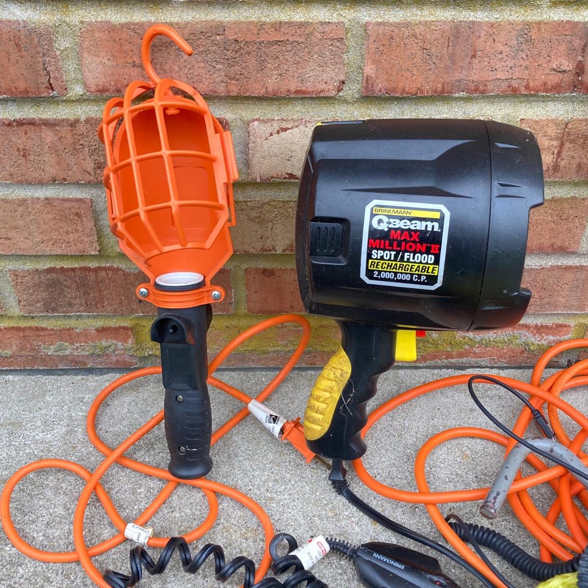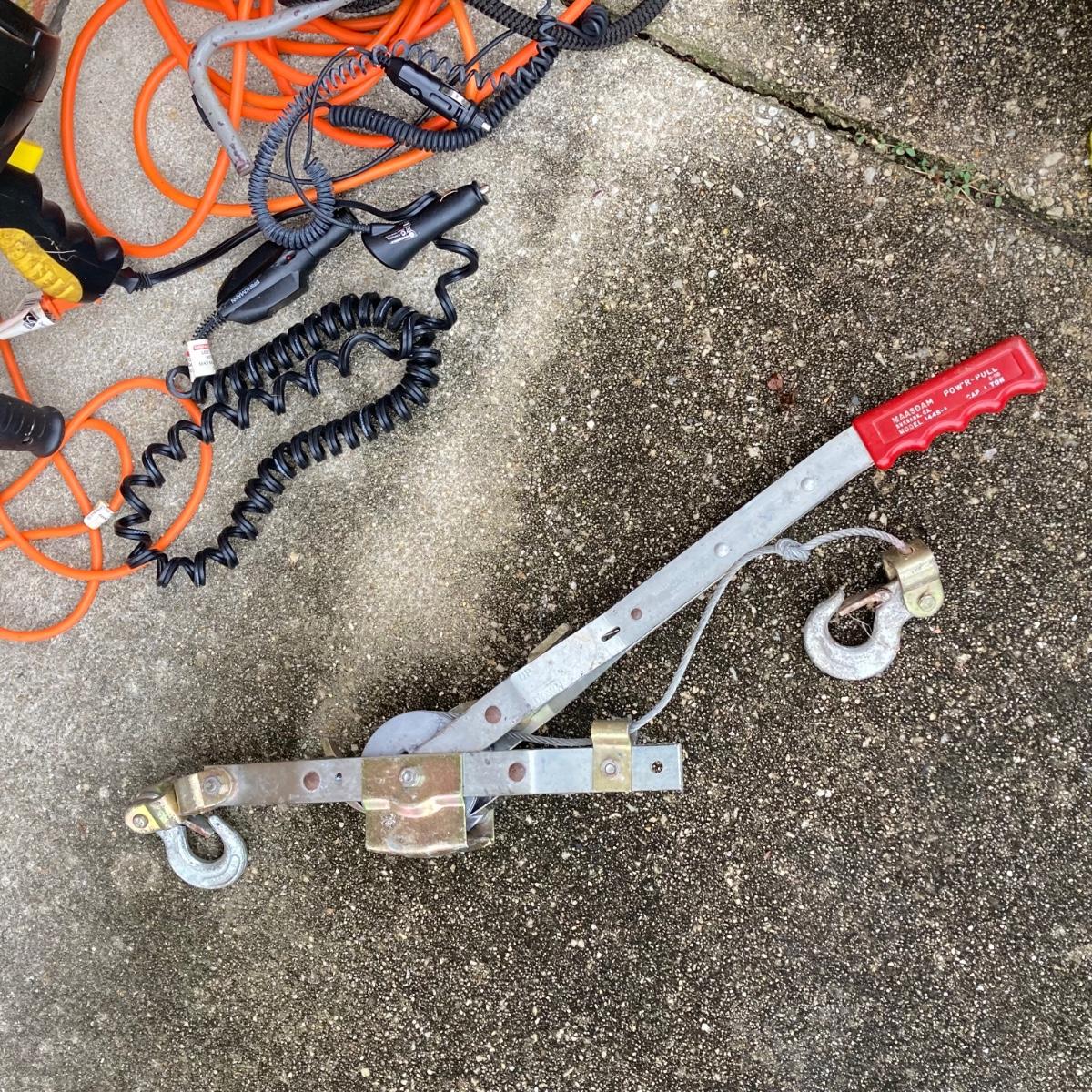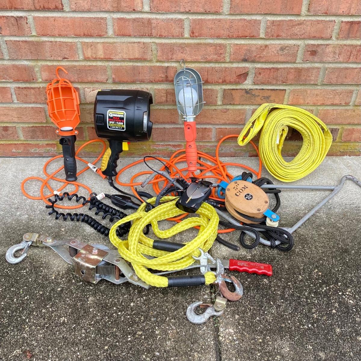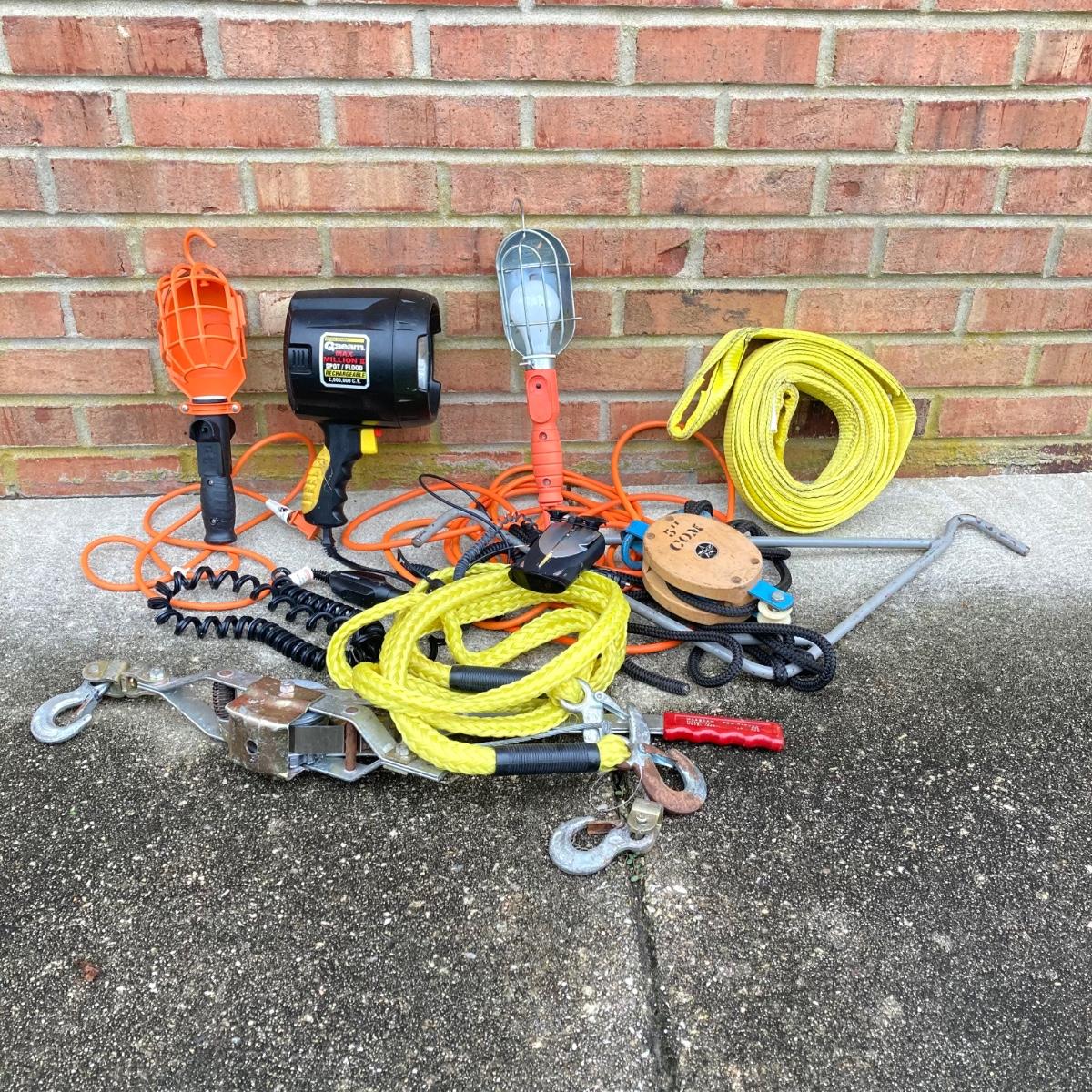 LOT 76: Hanging Shop Lights, Pulley, Spot Light, Winch, Tow Strap and More