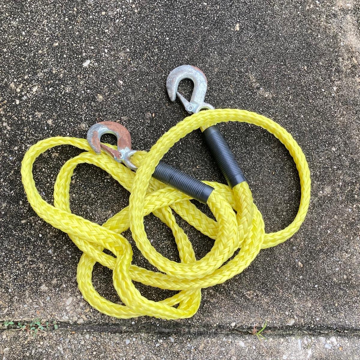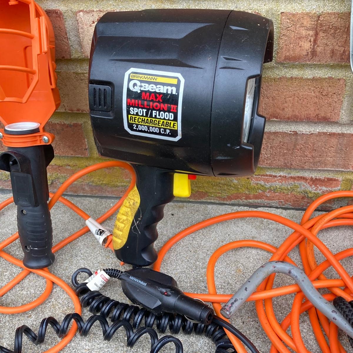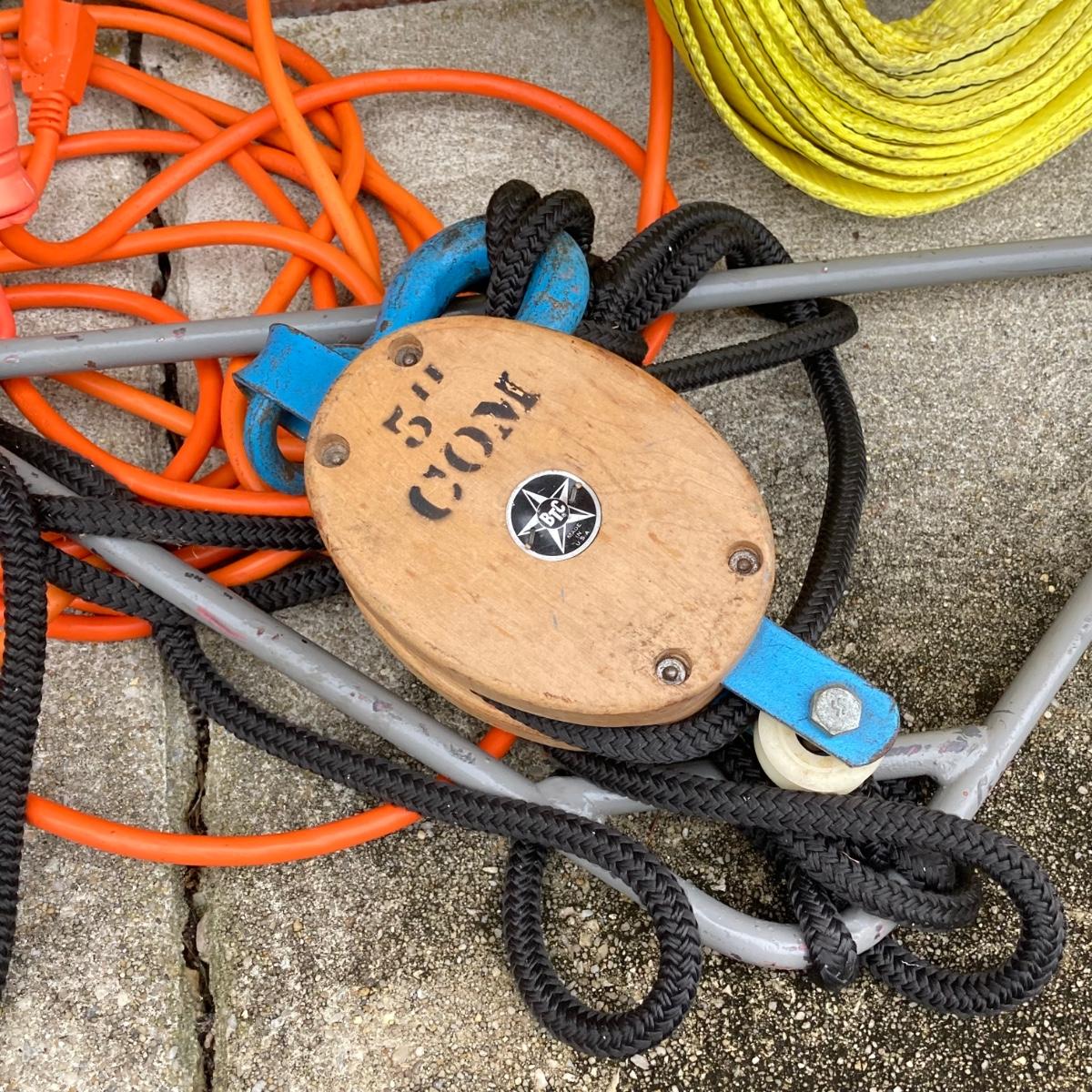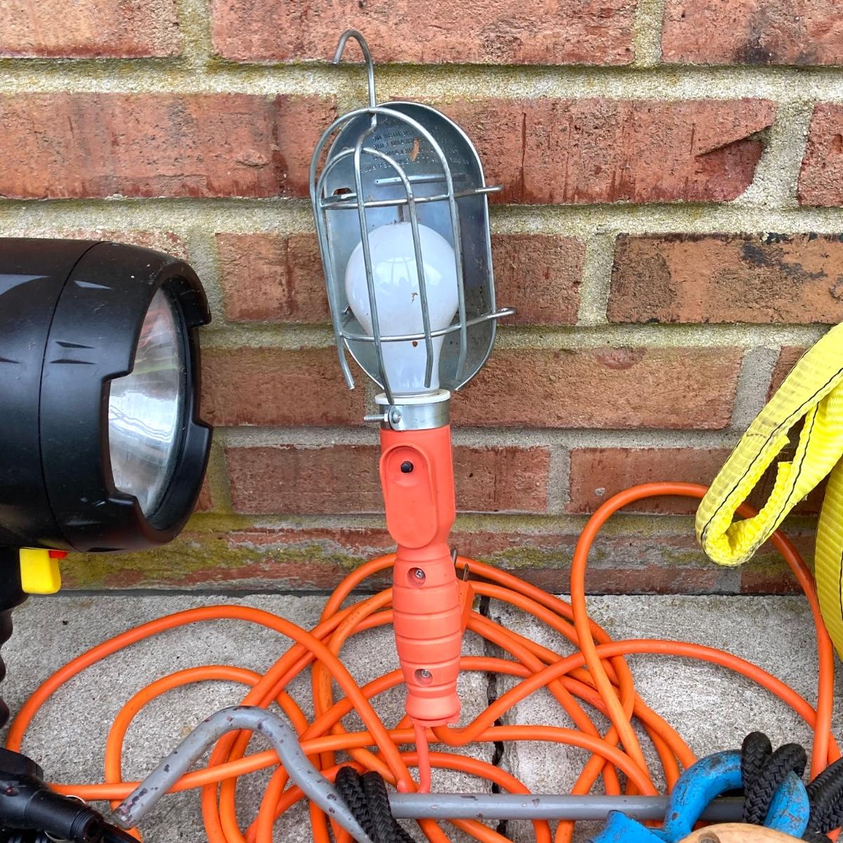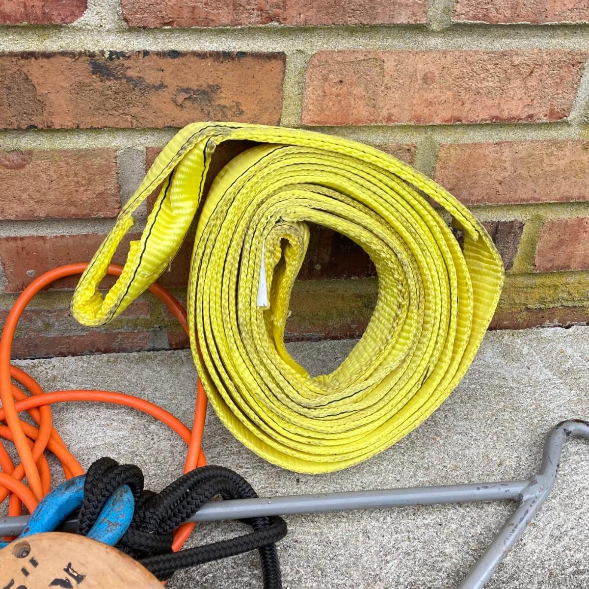 LOT 76: Hanging Shop Lights, Pulley, Spot Light, Winch, Tow Strap and More