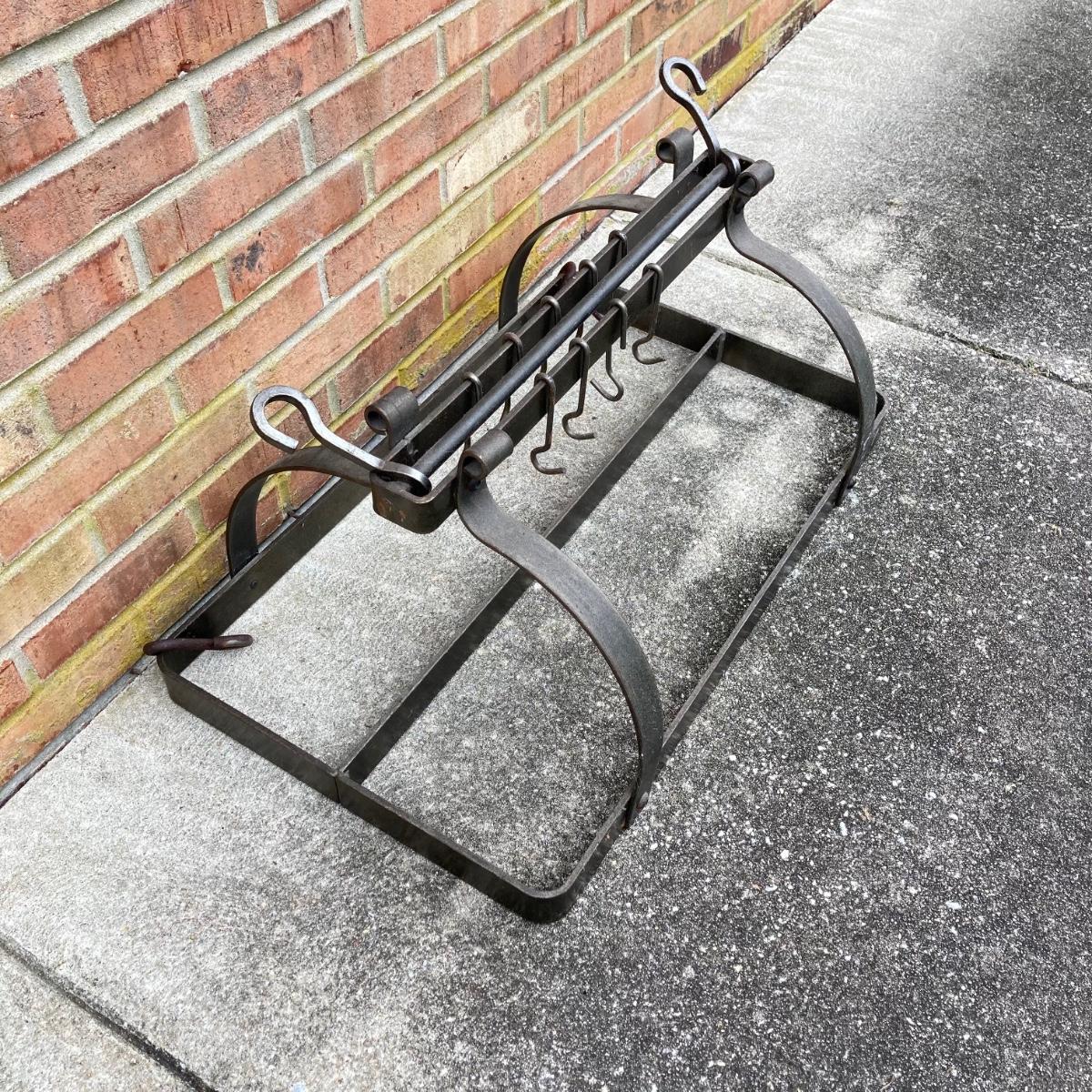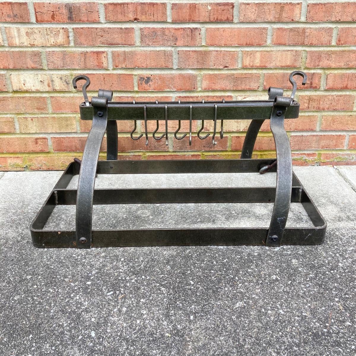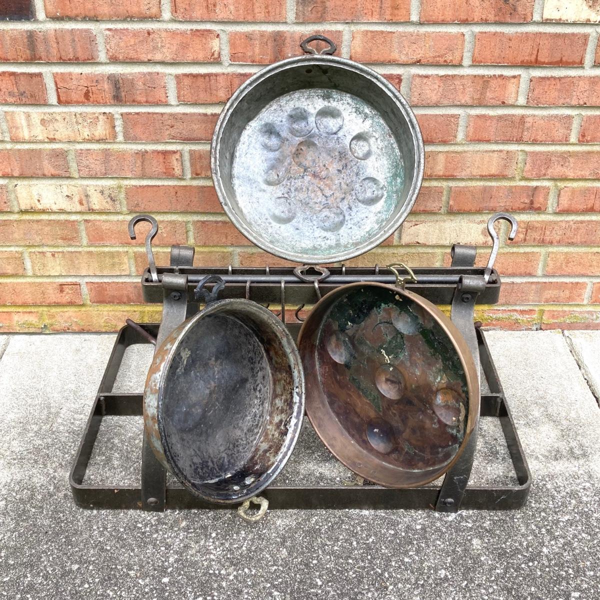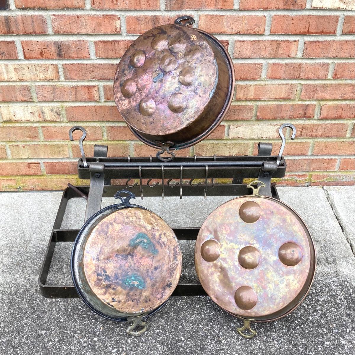 LOT 113: Heavy Duty Metal Hanging Kitchen Rack with Three Copper Bottom Pans