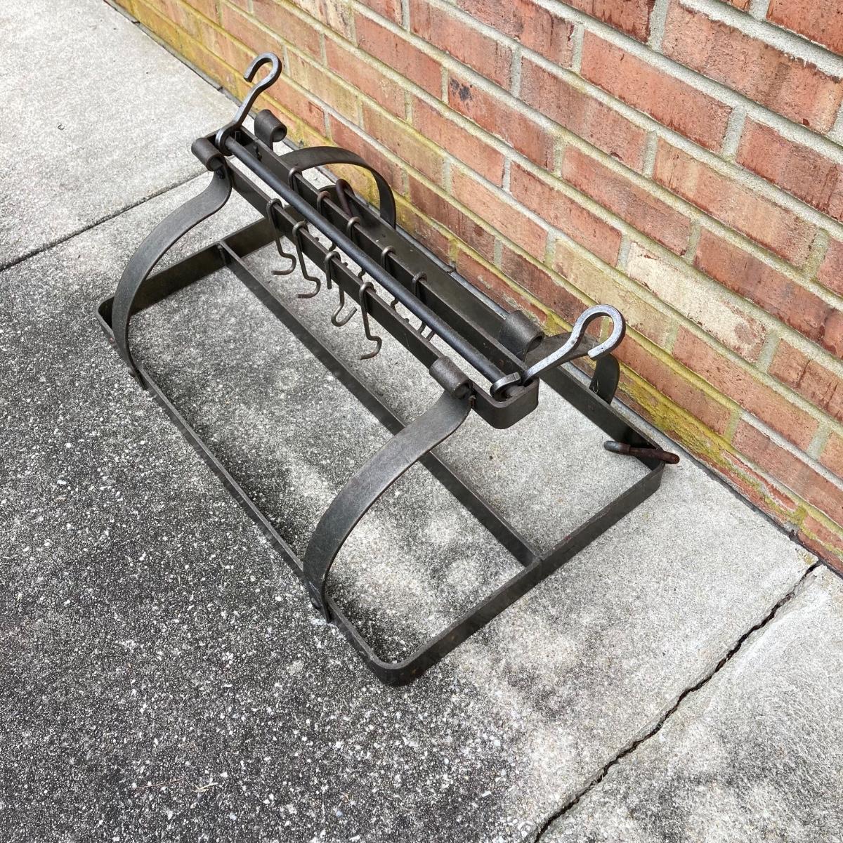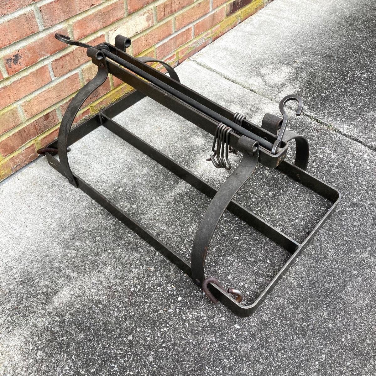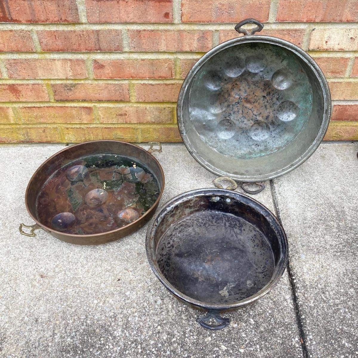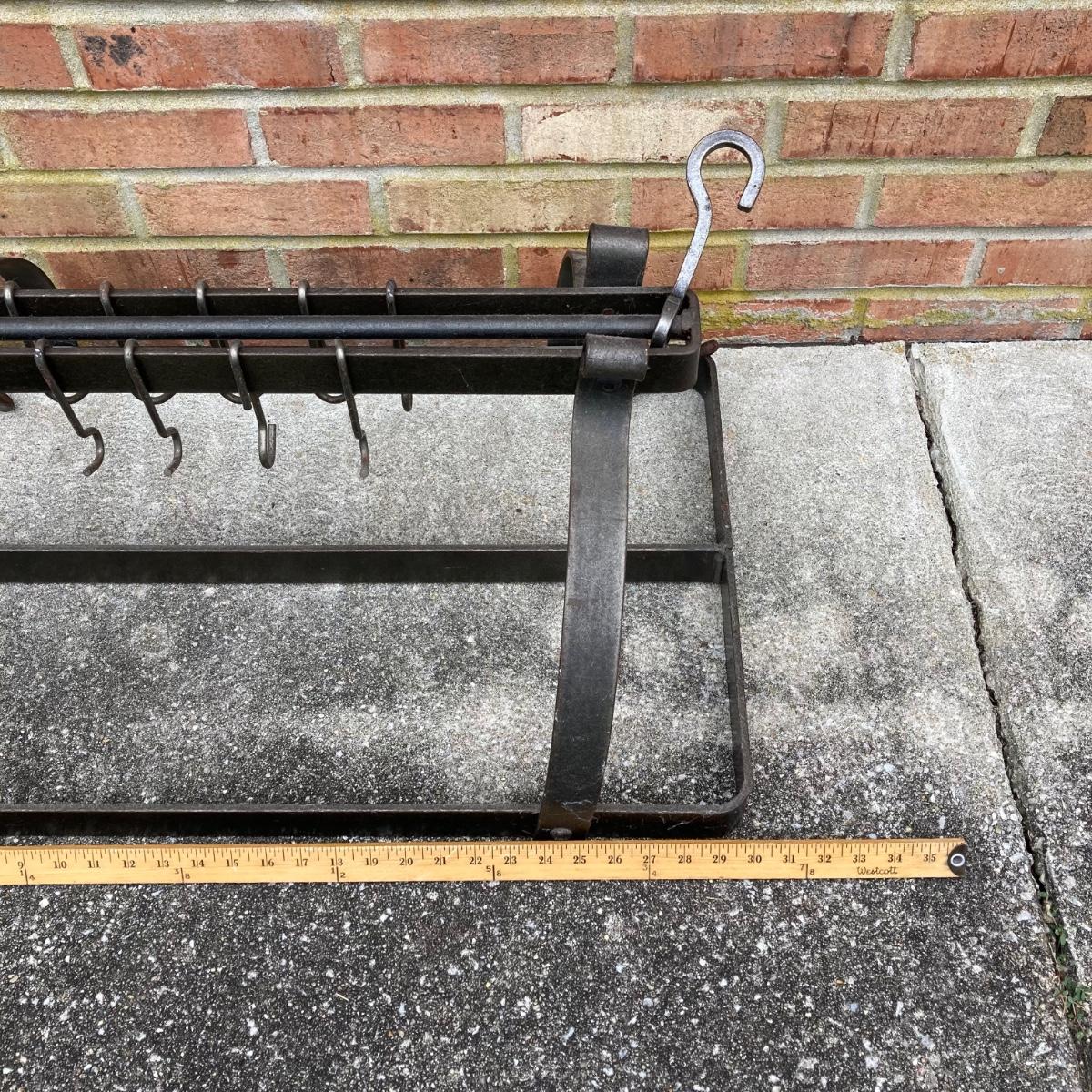 LOT 113: Heavy Duty Metal Hanging Kitchen Rack with Three Copper Bottom Pans