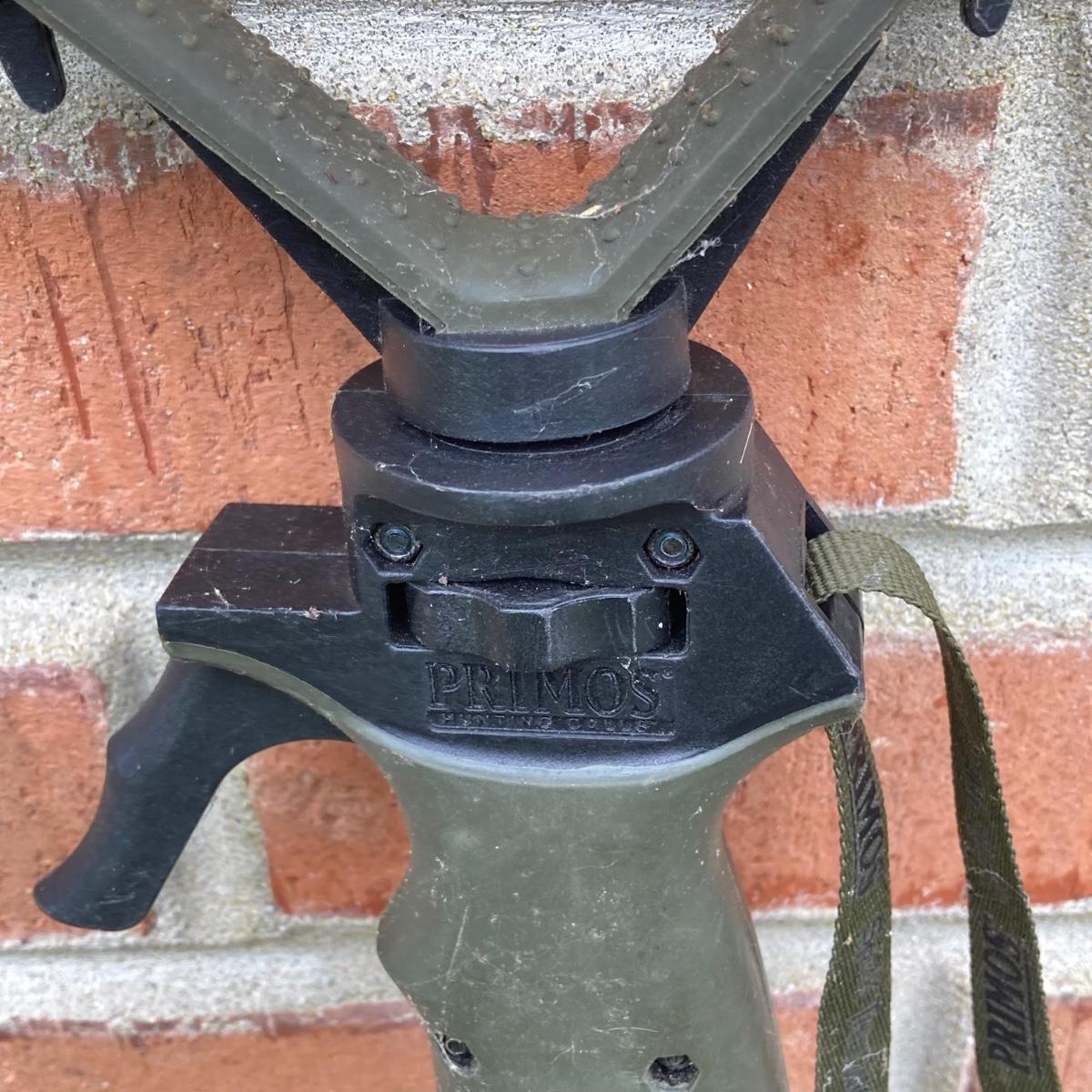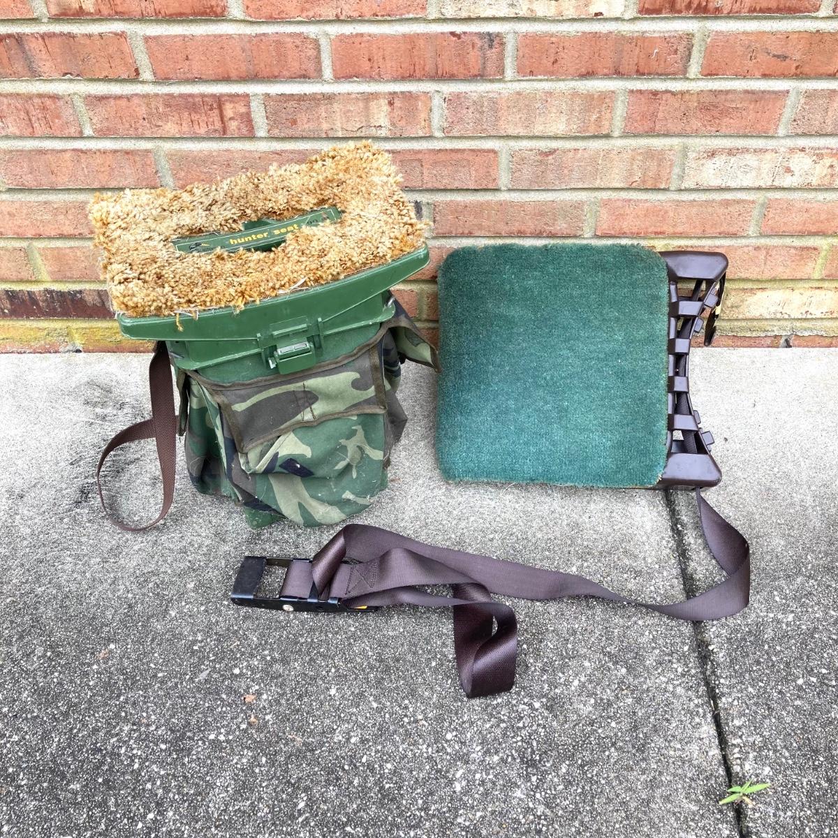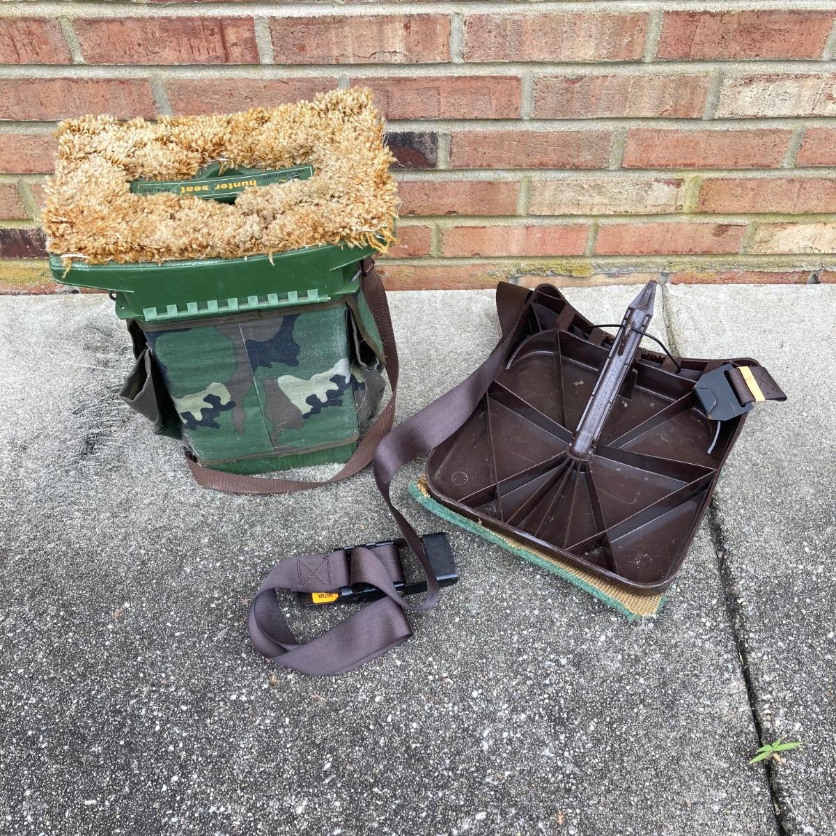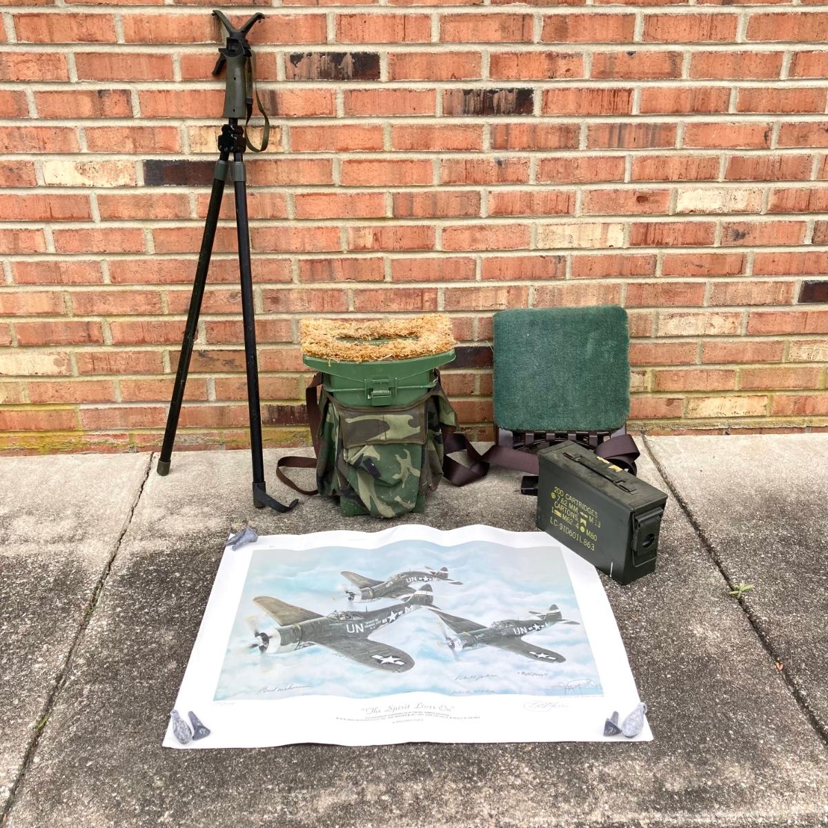 LOT 116: Primos Trigger Rifle Stick / Holder, Hunter's Seats (Woodstream and More), Ammo Box and "The Spirit Lives On" Signed Print