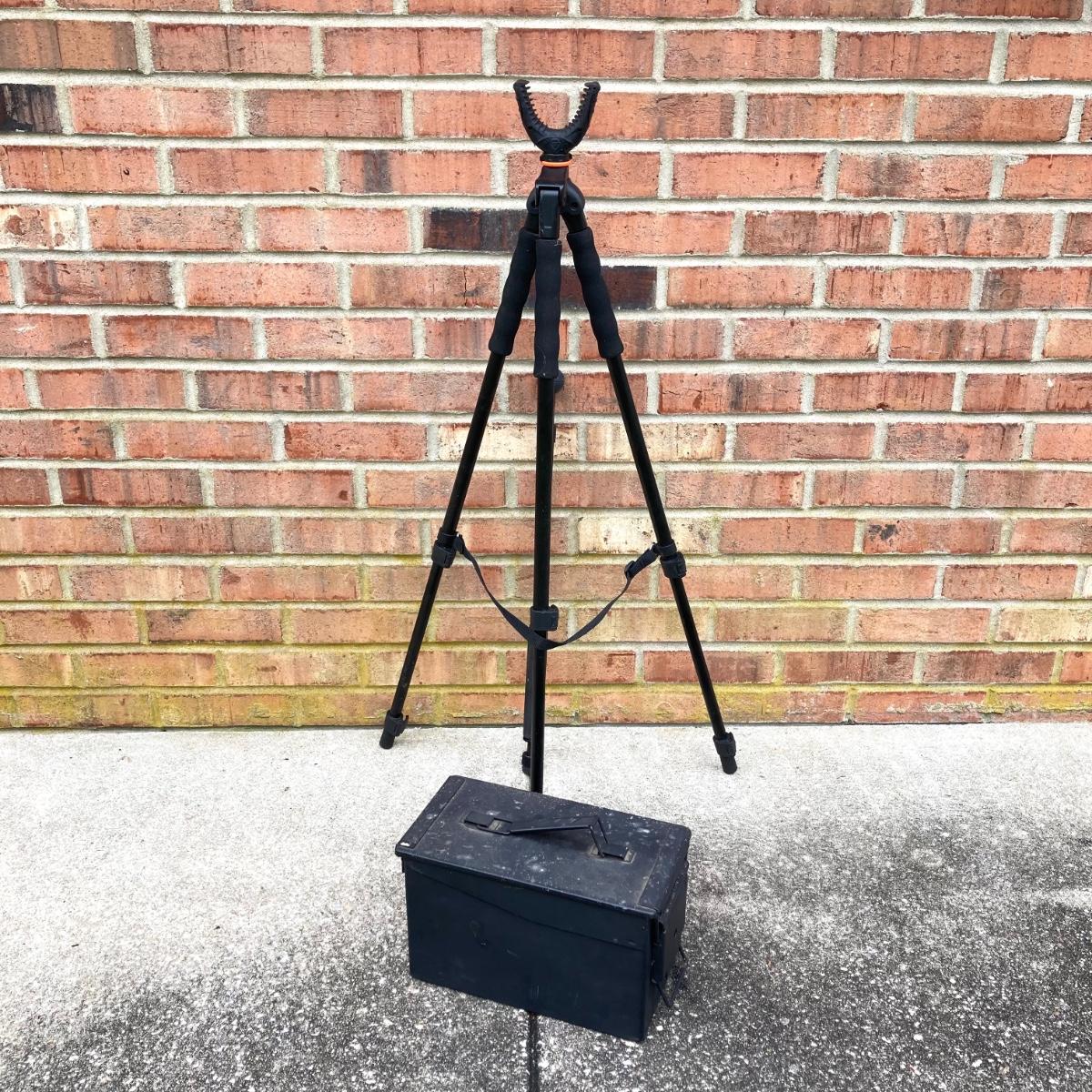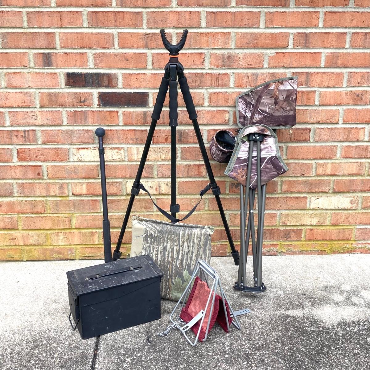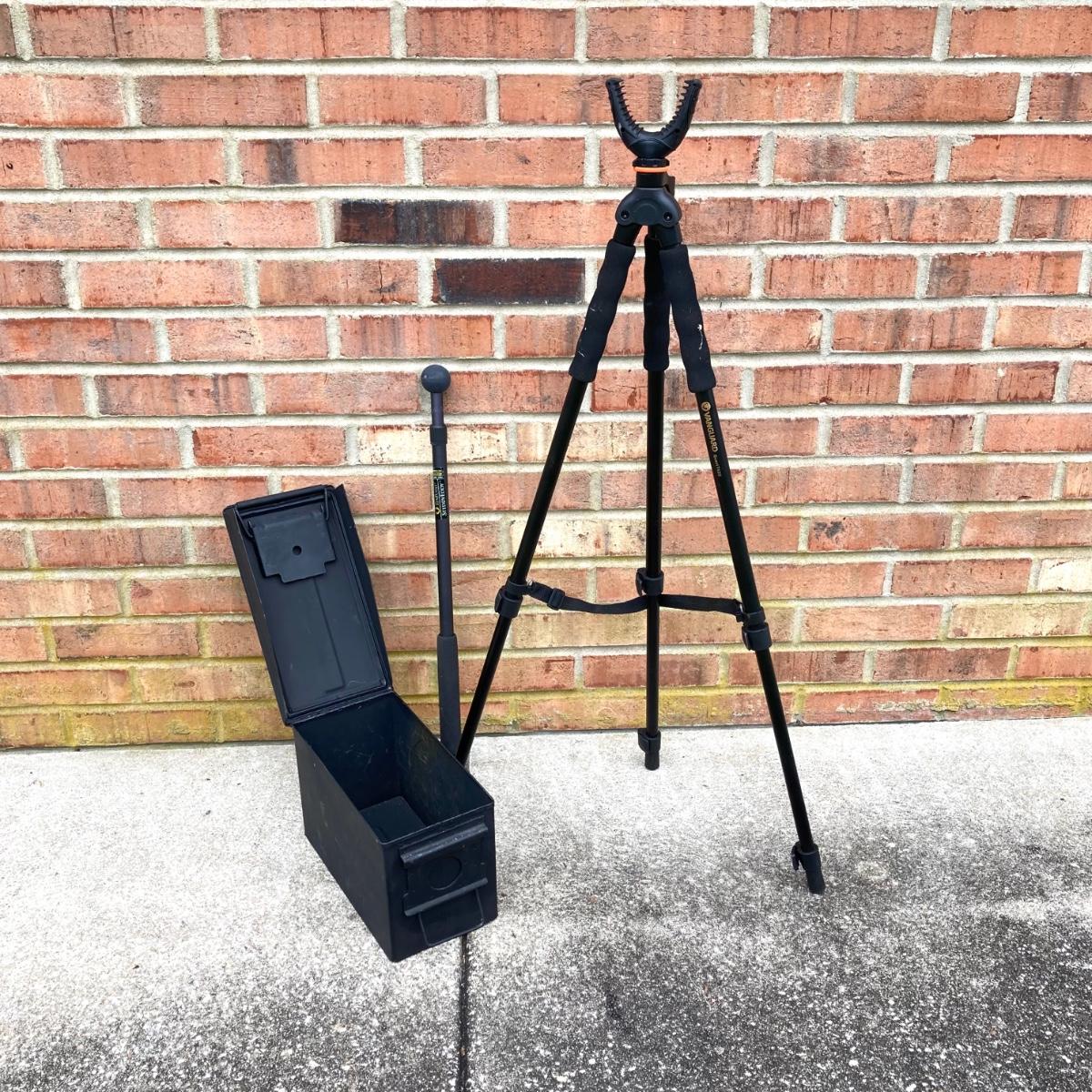 LOT 117: Vanguard Quest T62U Rifle Stand / Tripod / Holder, Seats, Ammo Box and More