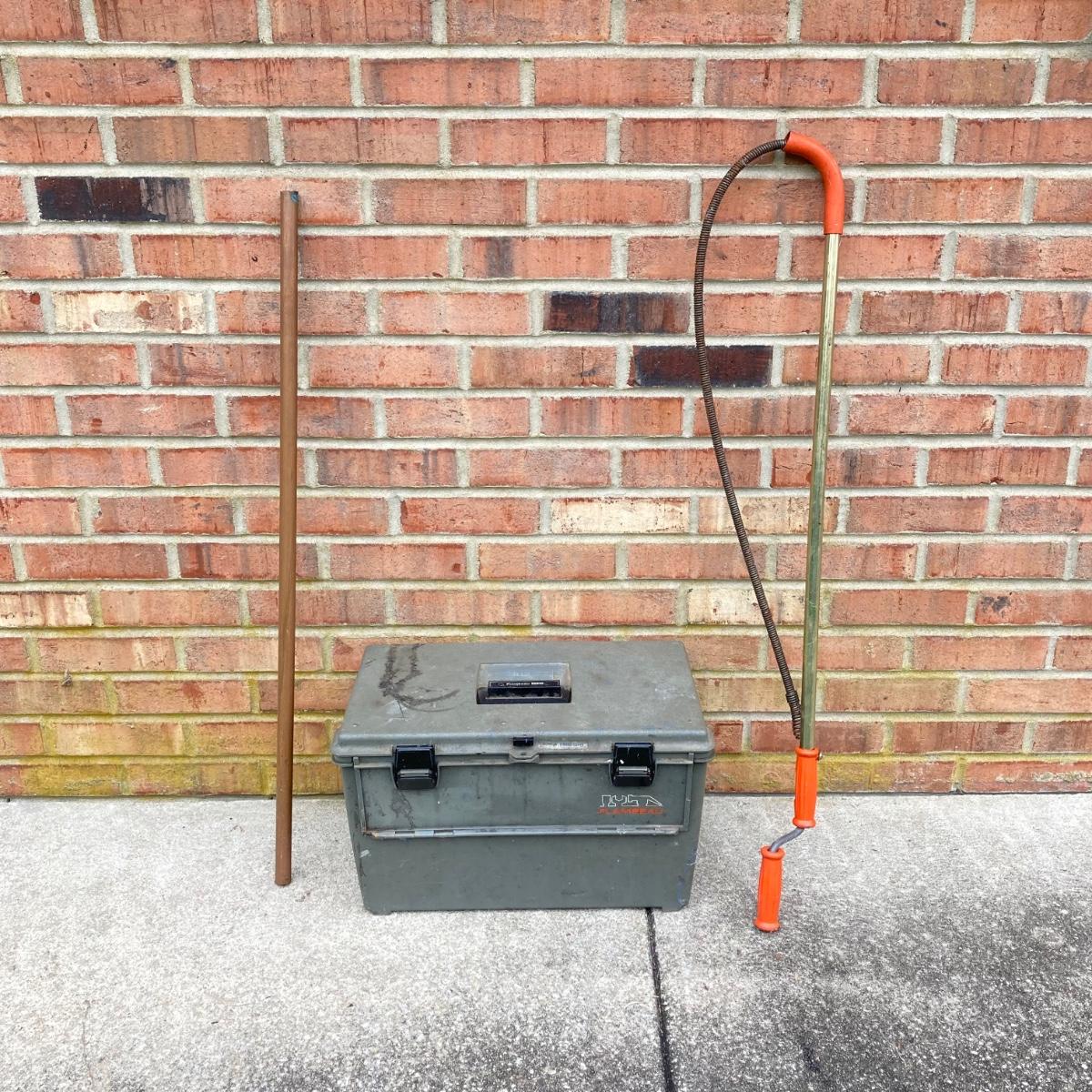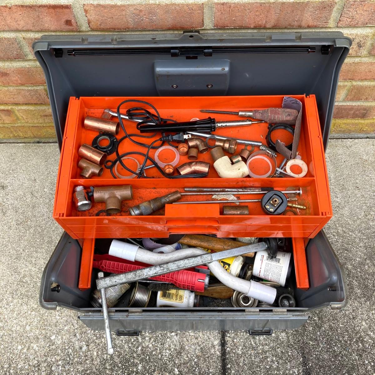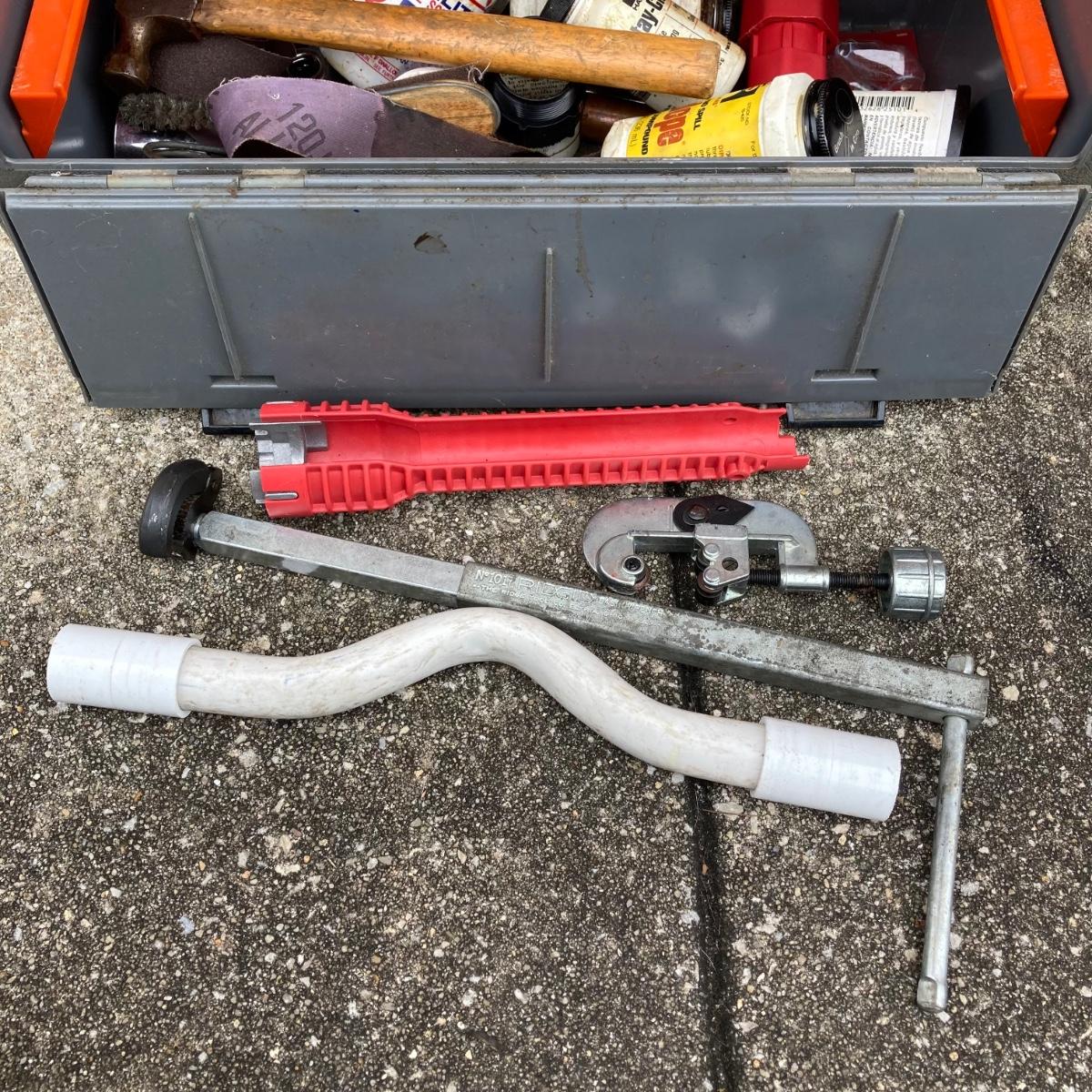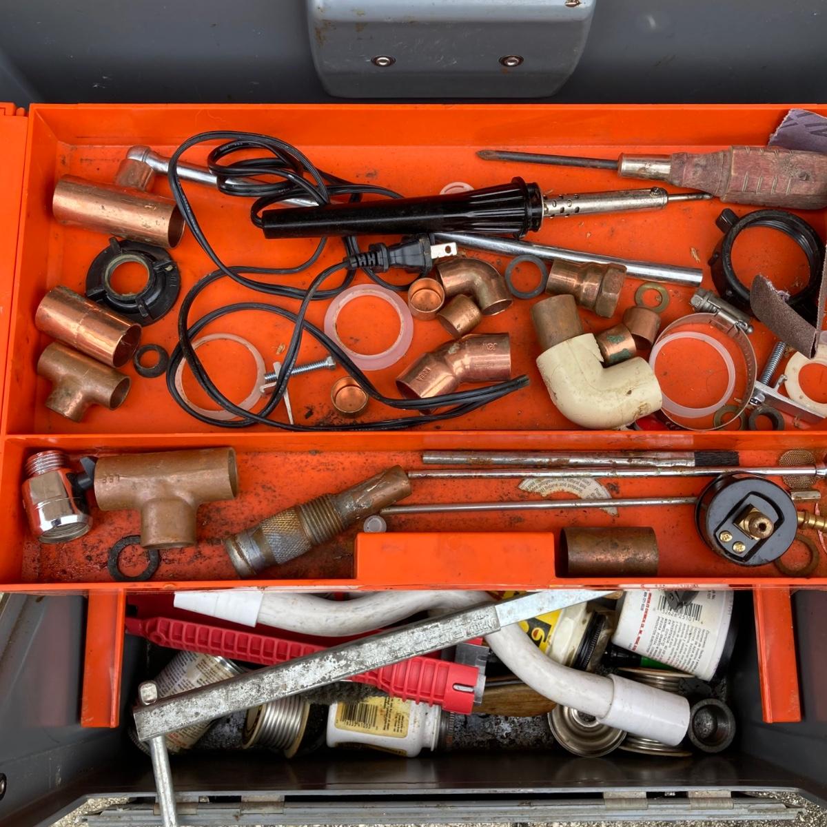 LOT 118: Plumber's Tool Collection - Flambeau Toolbox with Contents, Copper Pipe, General Drain Cleaner Snake Tool