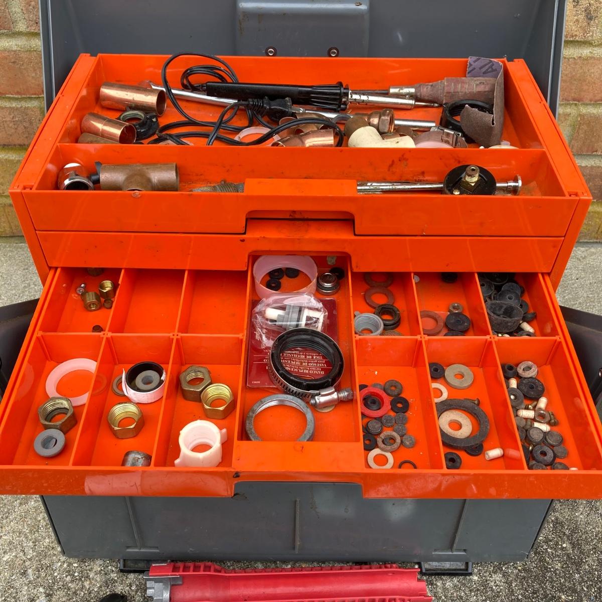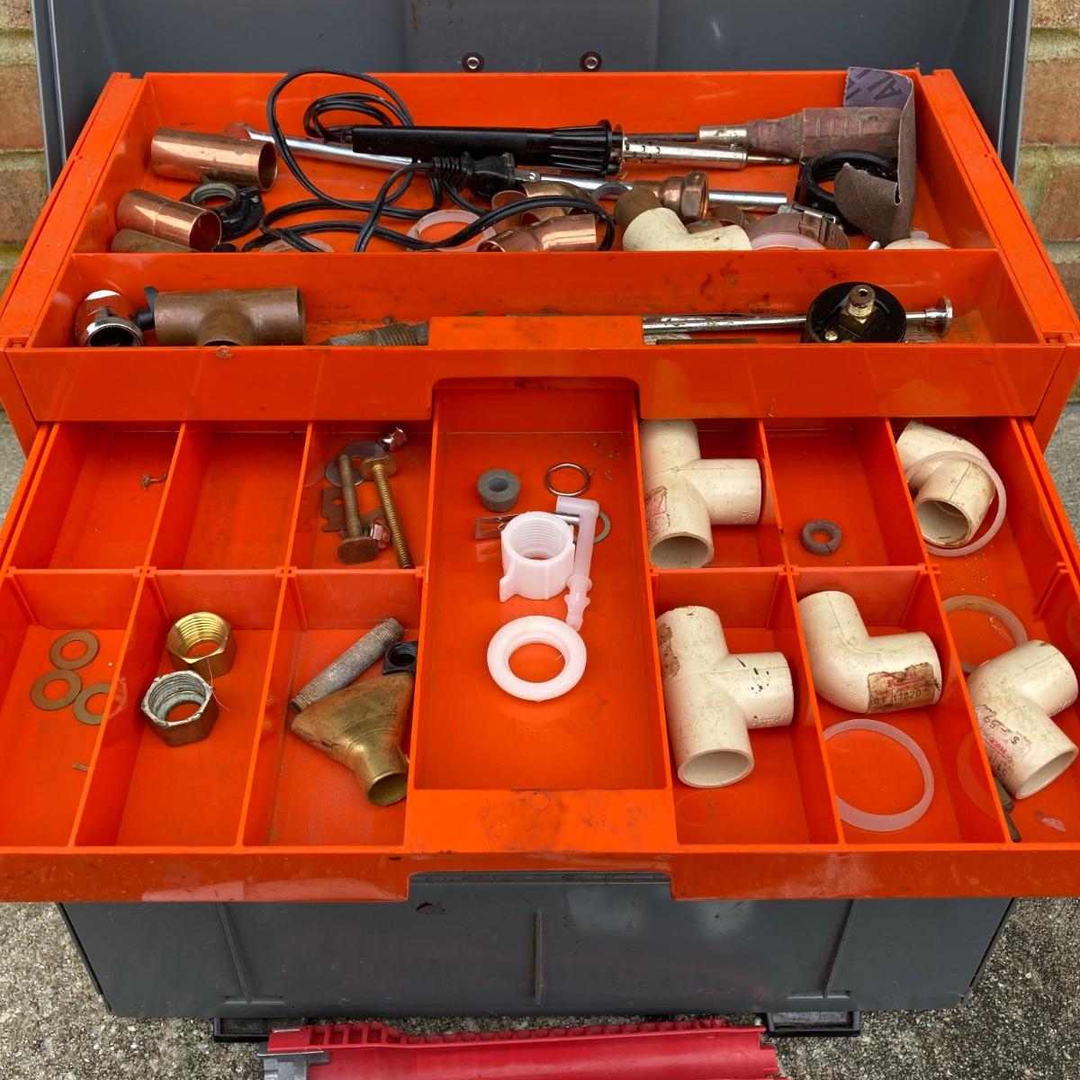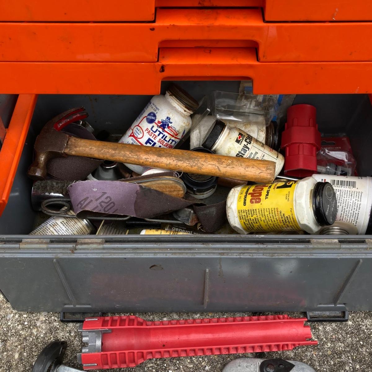 LOT 118: Plumber's Tool Collection - Flambeau Toolbox with Contents, Copper Pipe, General Drain Cleaner Snake Tool