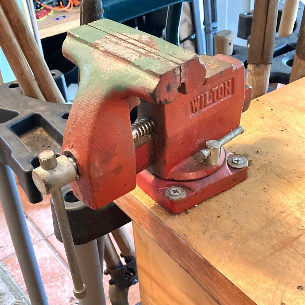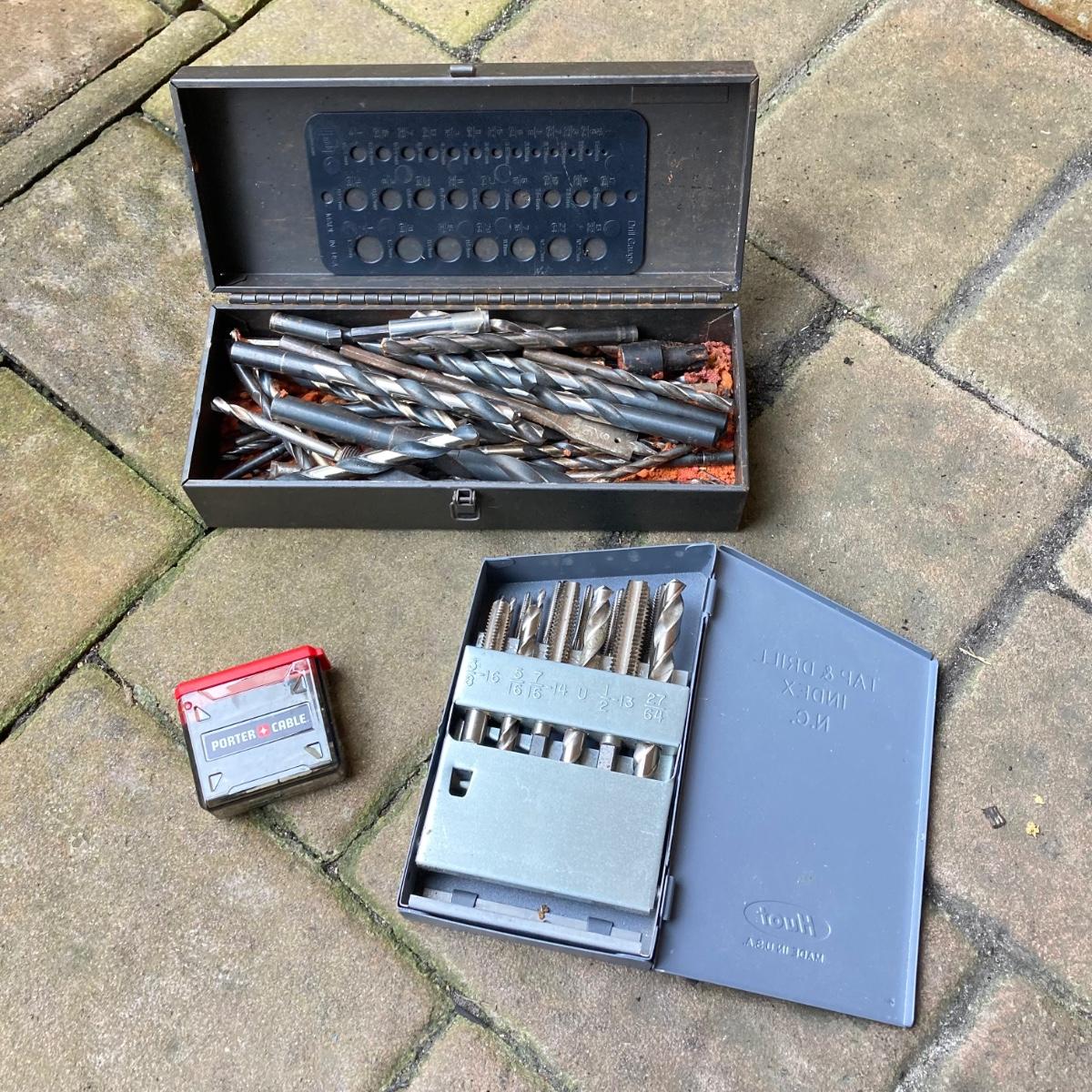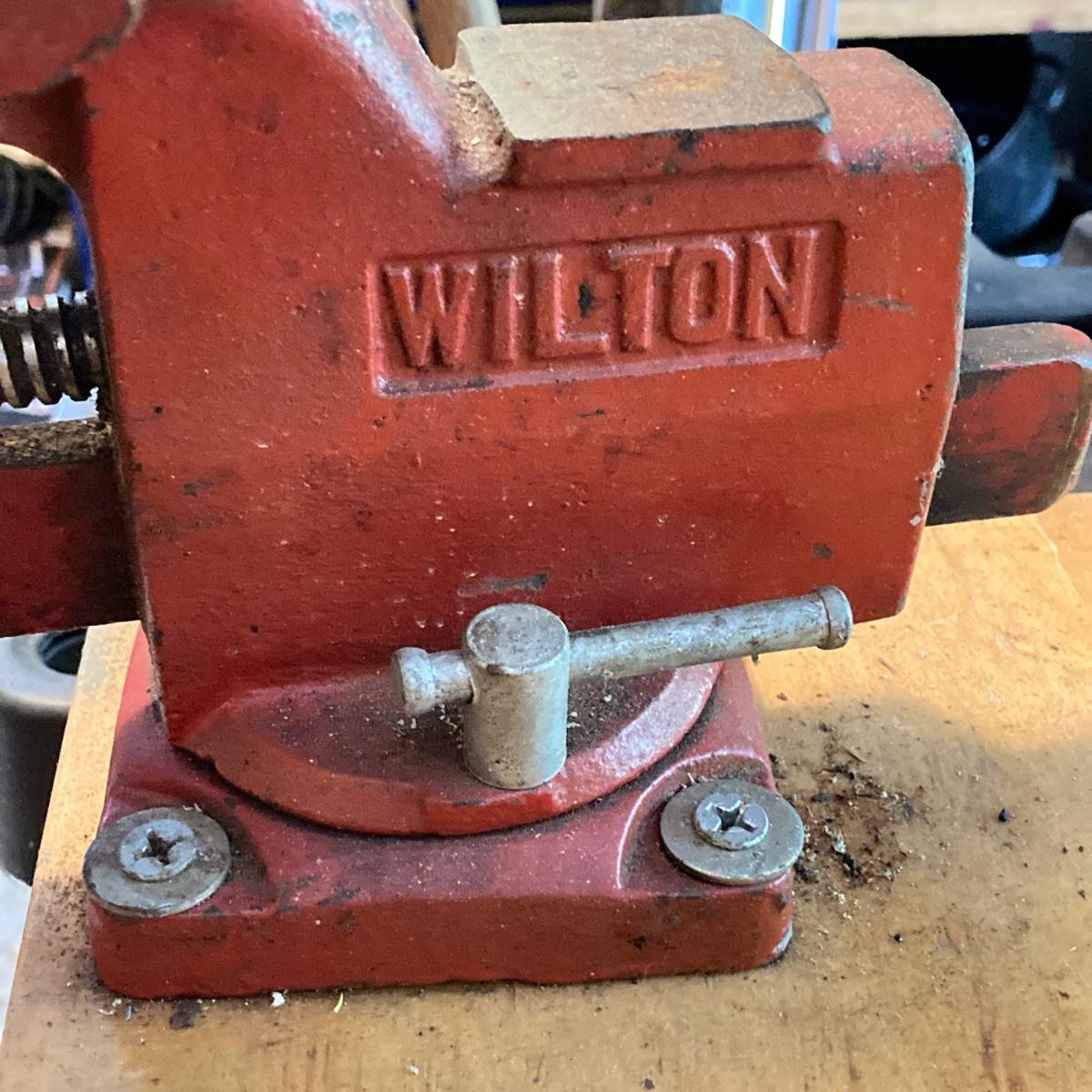 LOT 127: Wilton Bench Vise, Bosch Model 1608 Tool, Rockwell Laminate Trimmer Base Model 3991, Tap and Drill Bits and More