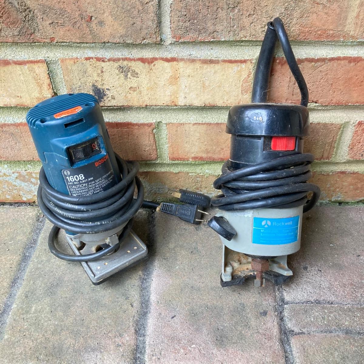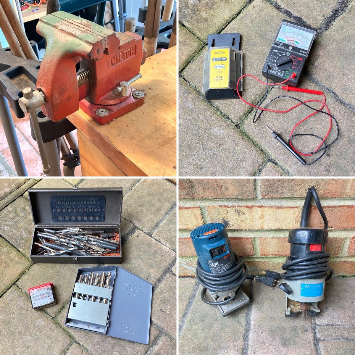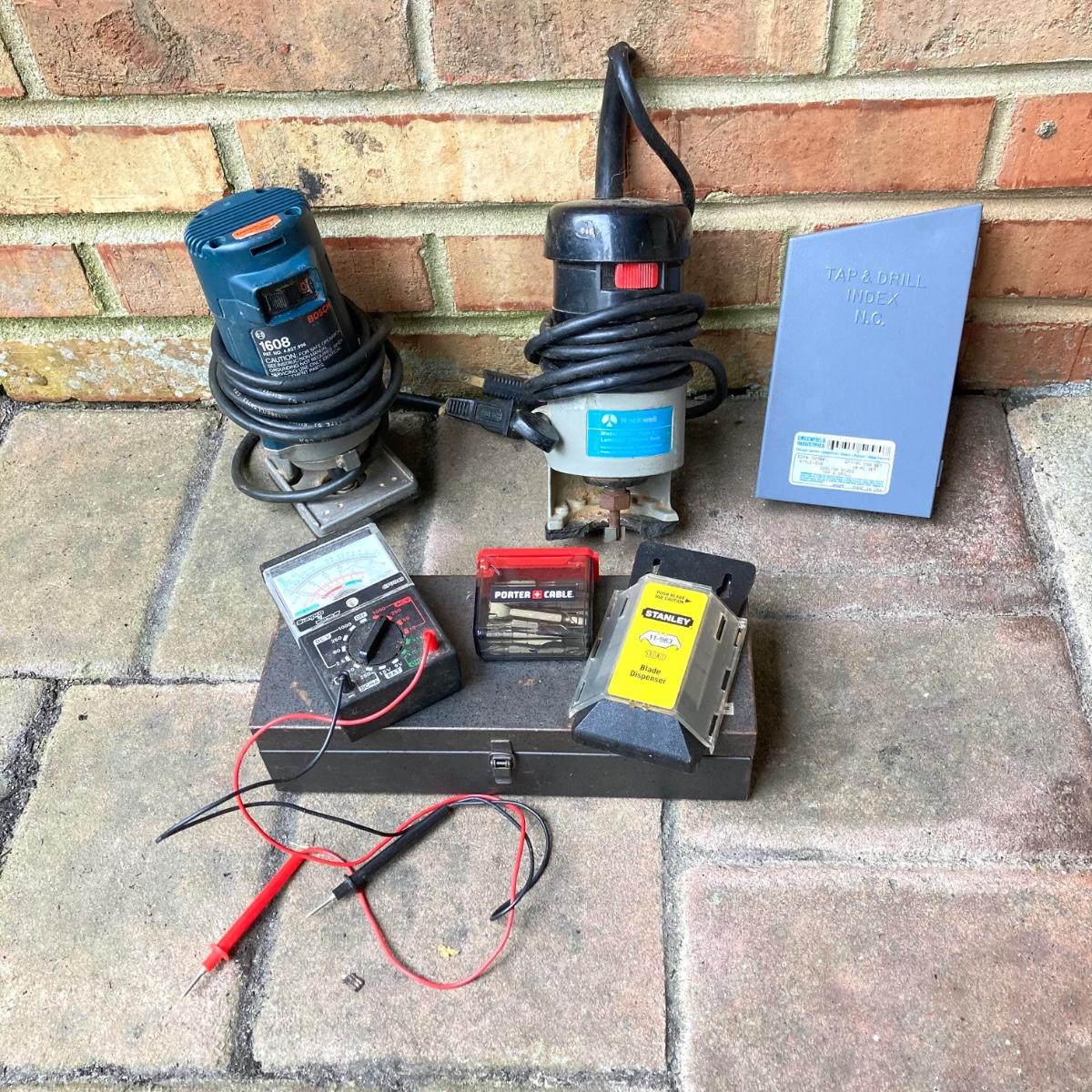 LOT 127: Wilton Bench Vise, Bosch Model 1608 Tool, Rockwell Laminate Trimmer Base Model 3991, Tap and Drill Bits and More