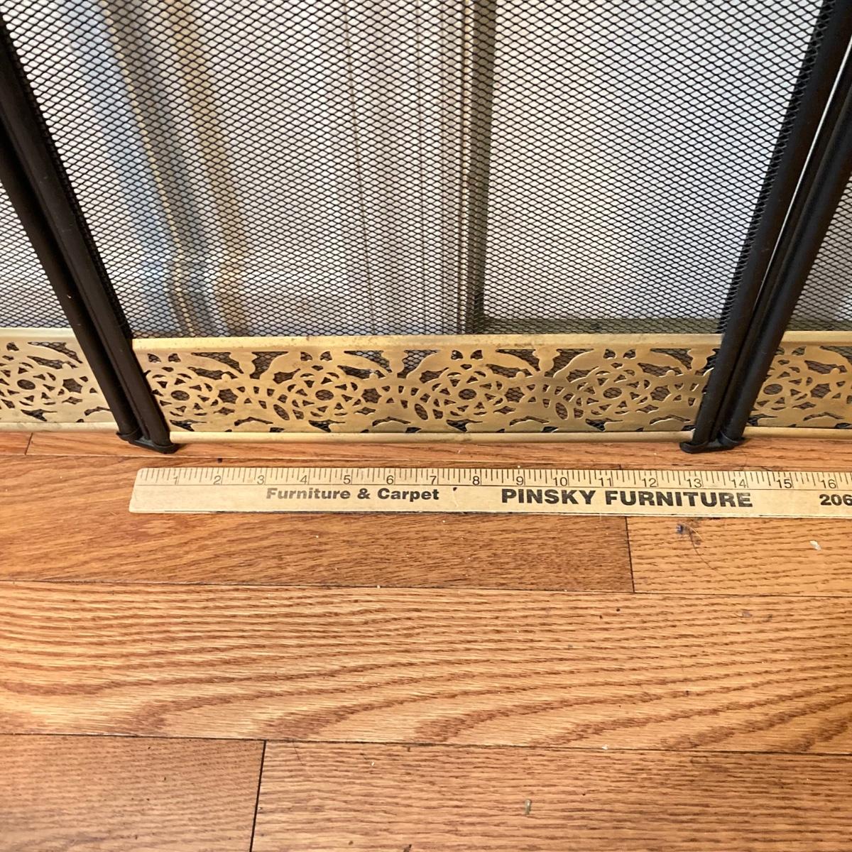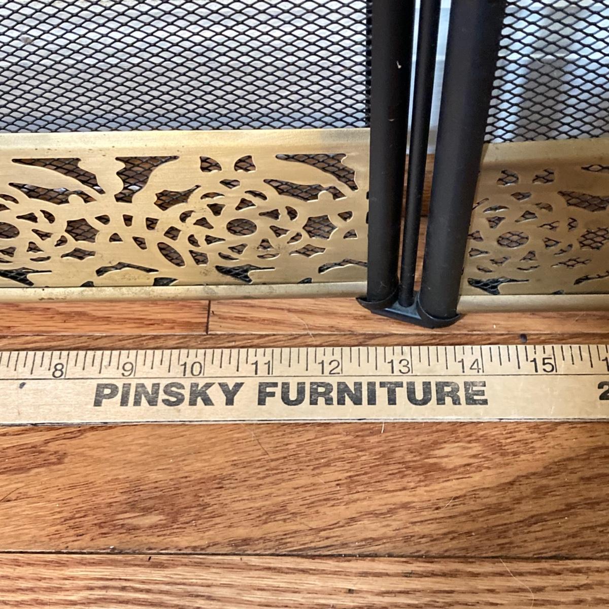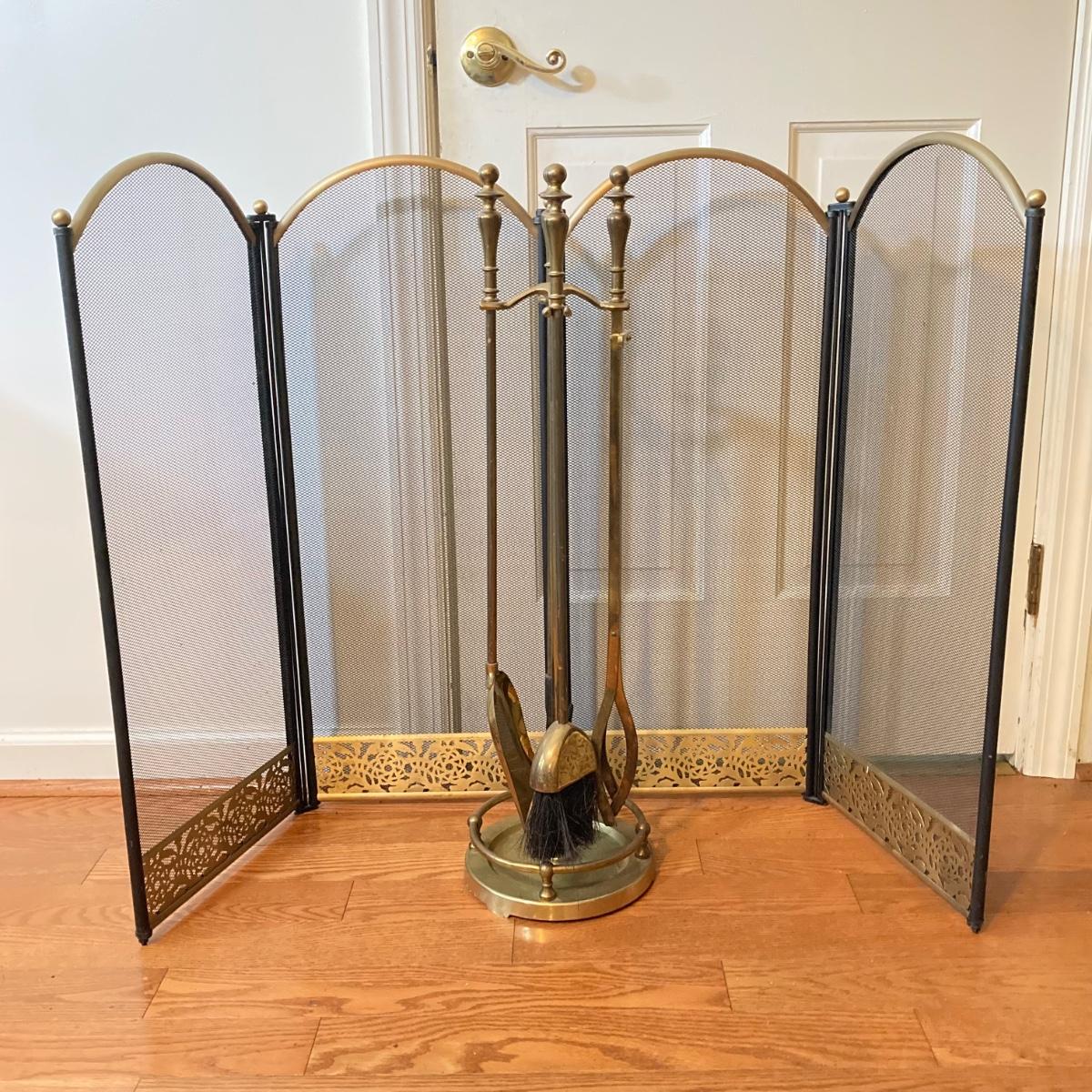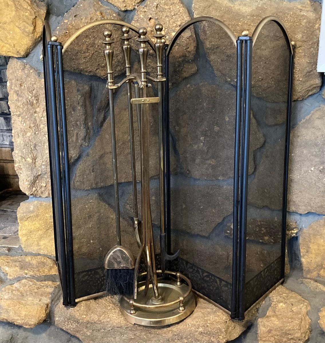 LOT 130: Brass Trimmed Fireplace Screen with Brass Fireplace Tools / Stand