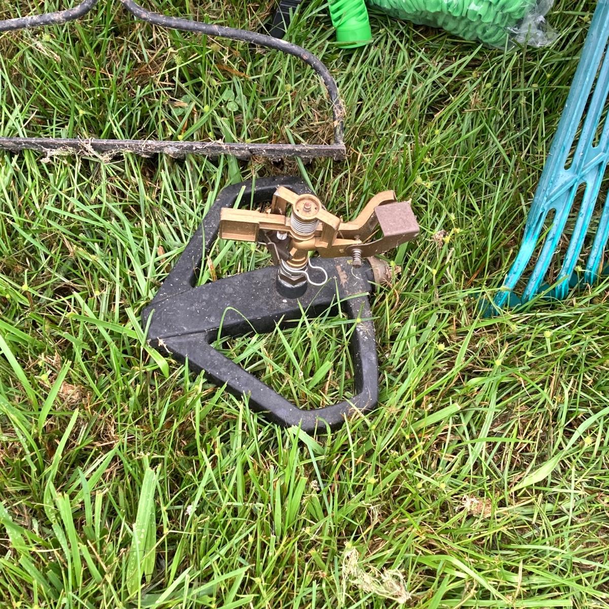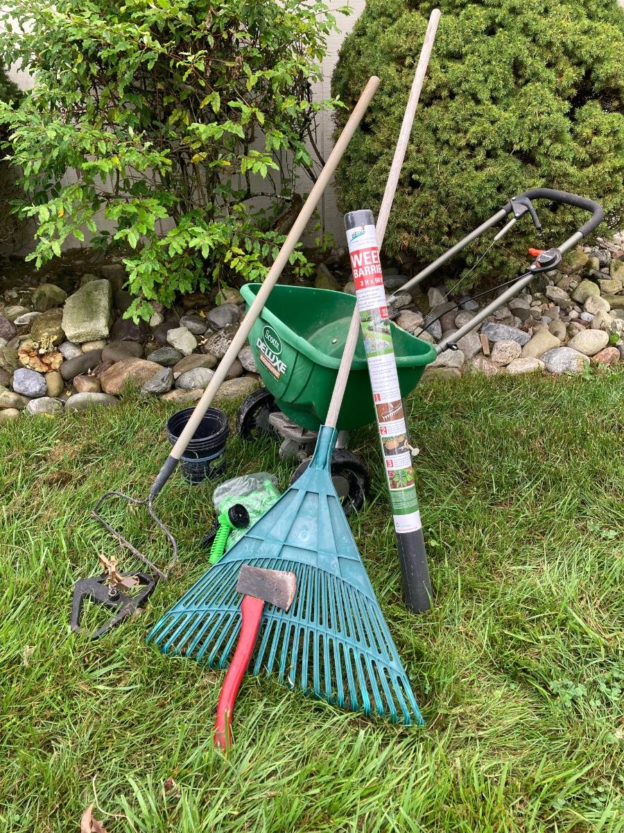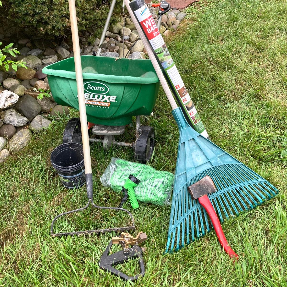 LOT 133: Gardening Tools Including Rakes, Seed Spreader, Ax, Hose and More