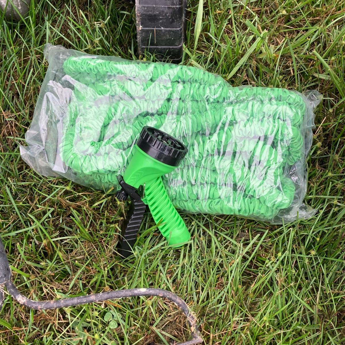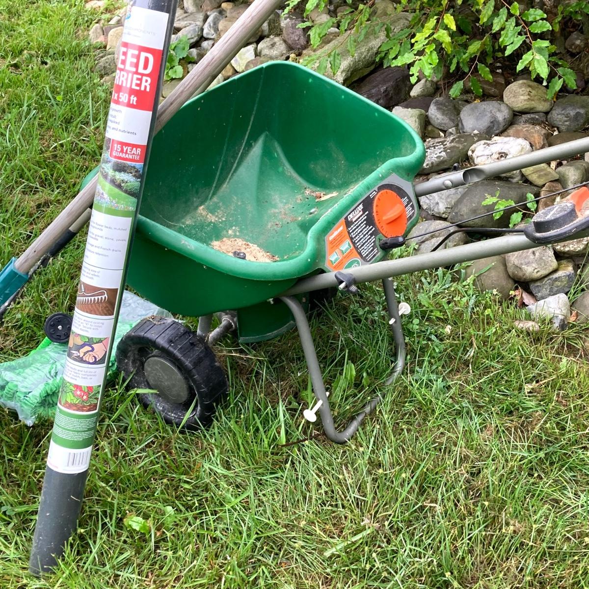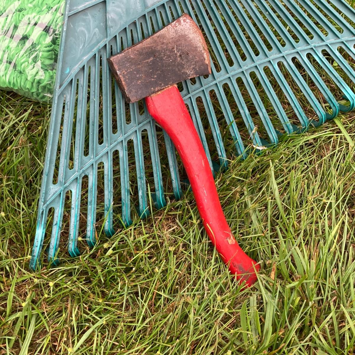 LOT 133: Gardening Tools Including Rakes, Seed Spreader, Ax, Hose and More