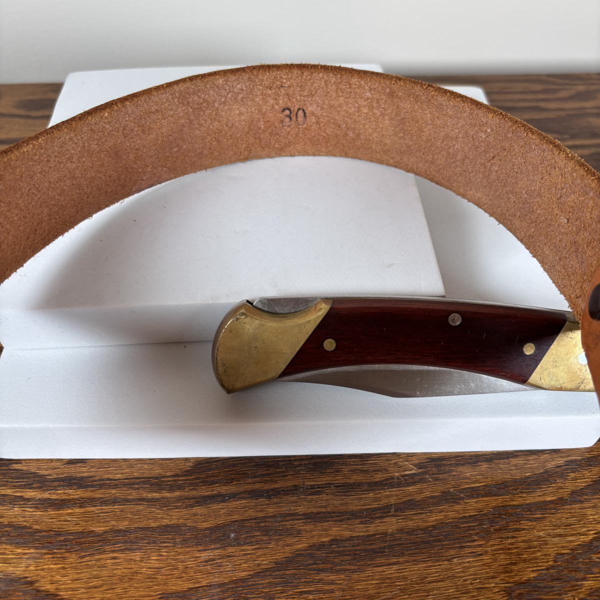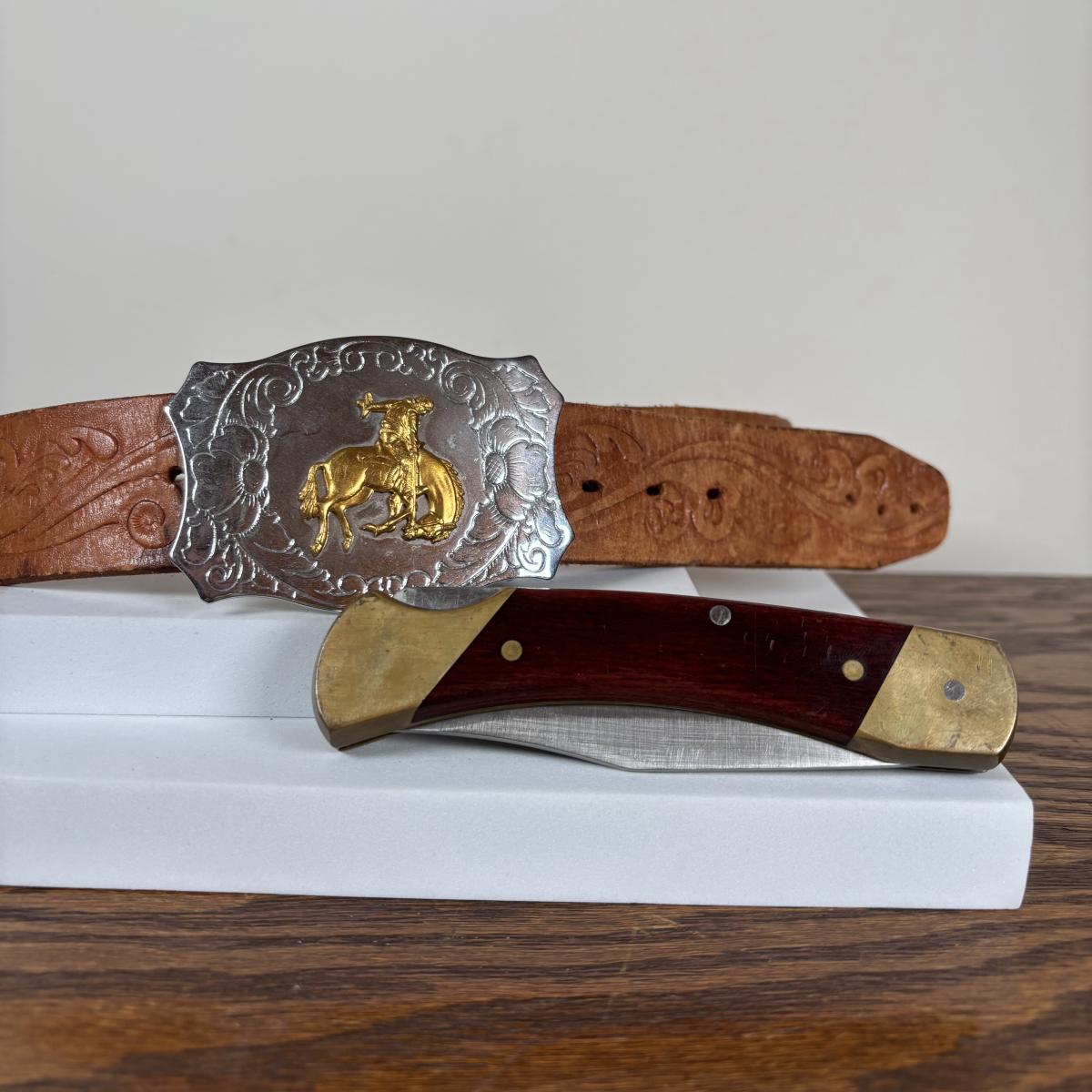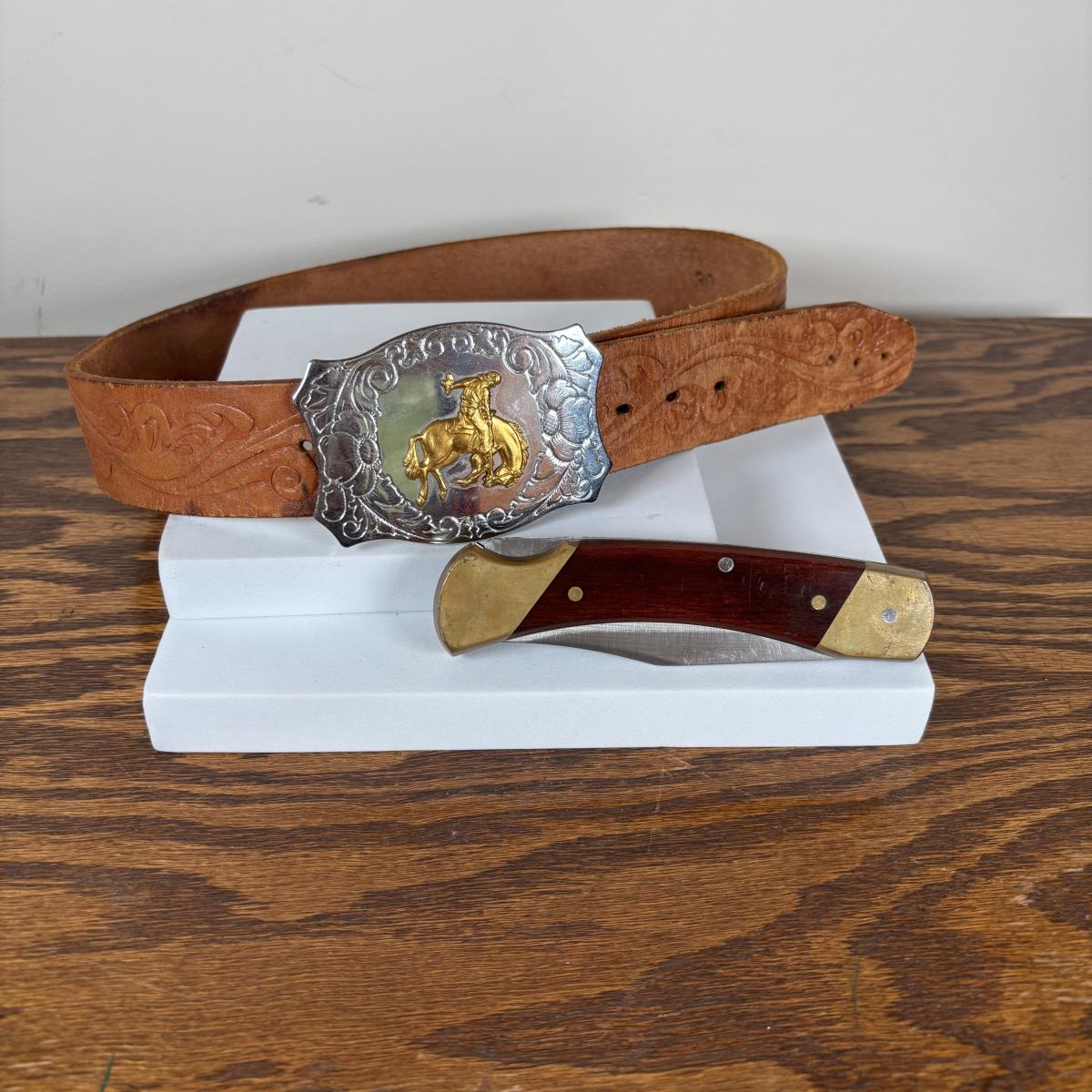LOT 138: Rodeo Cowboy Belt Buckle w/Leather Belt & Uncle Henry Schrade Pocket Knife