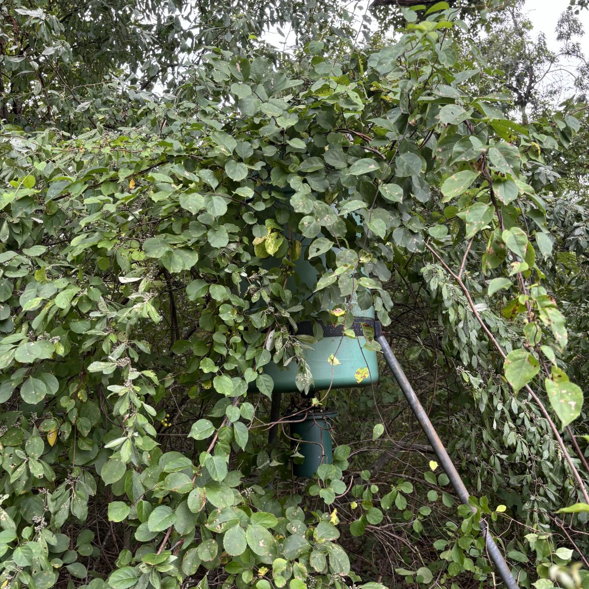 As shown, it is located in the wooded area of the property. It is being sold as is.