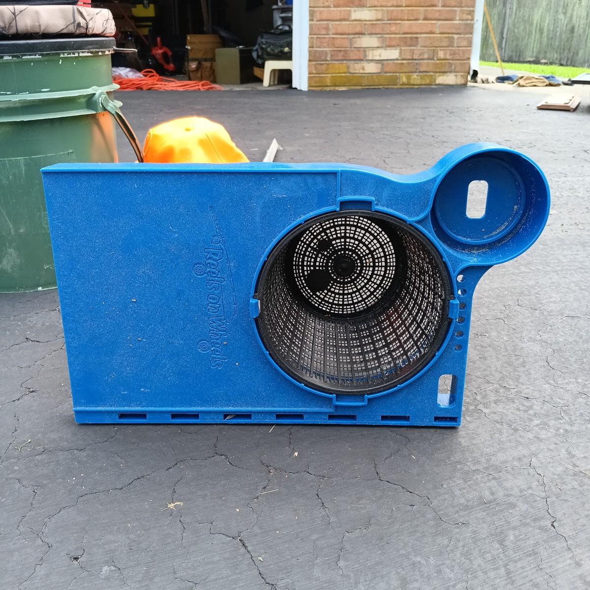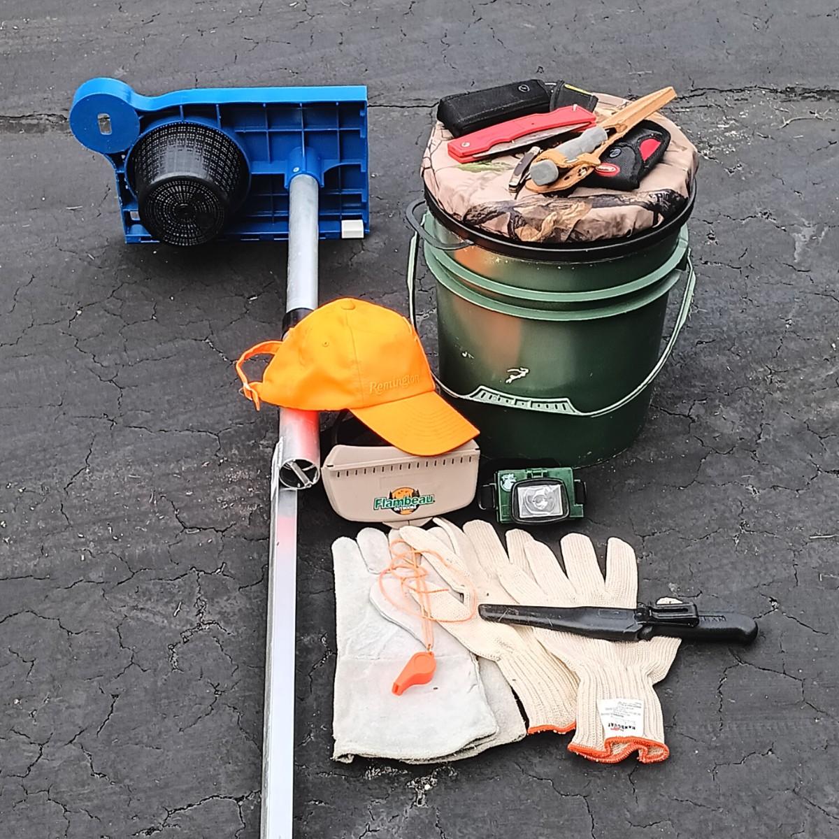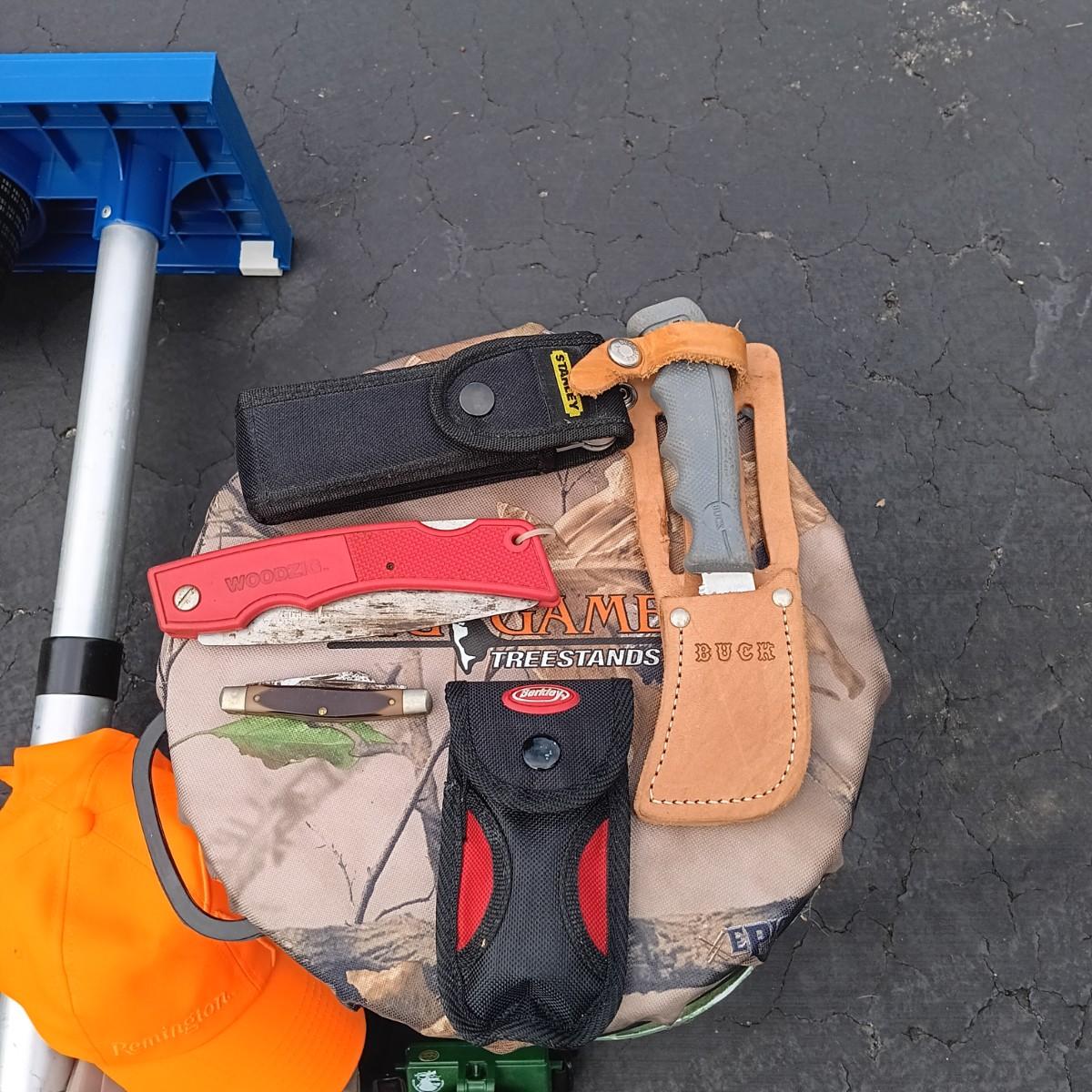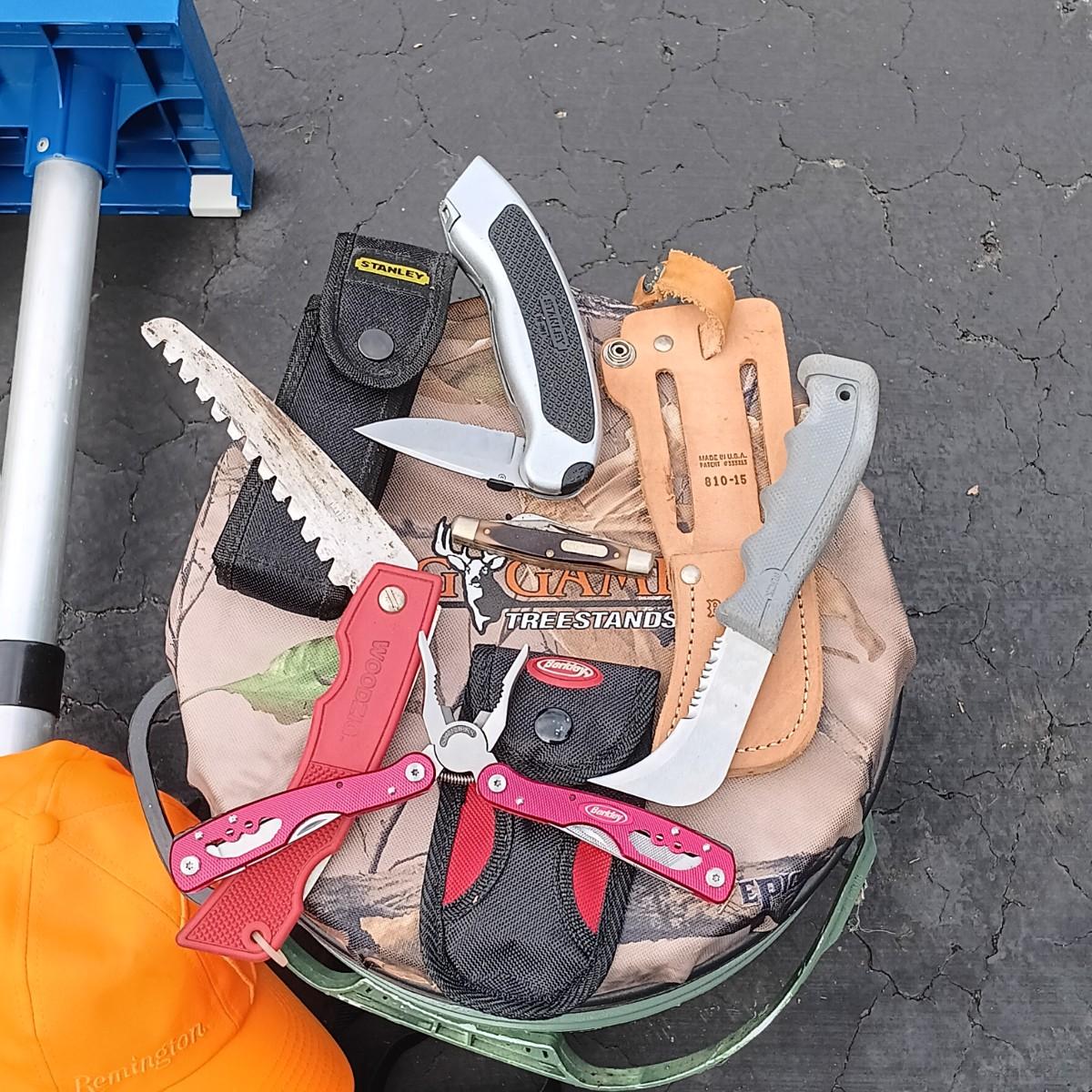 LOT 181: Reels on Wheels Fishing Cart Accessory with a Big Game Storage Bucket, Various Knives & More