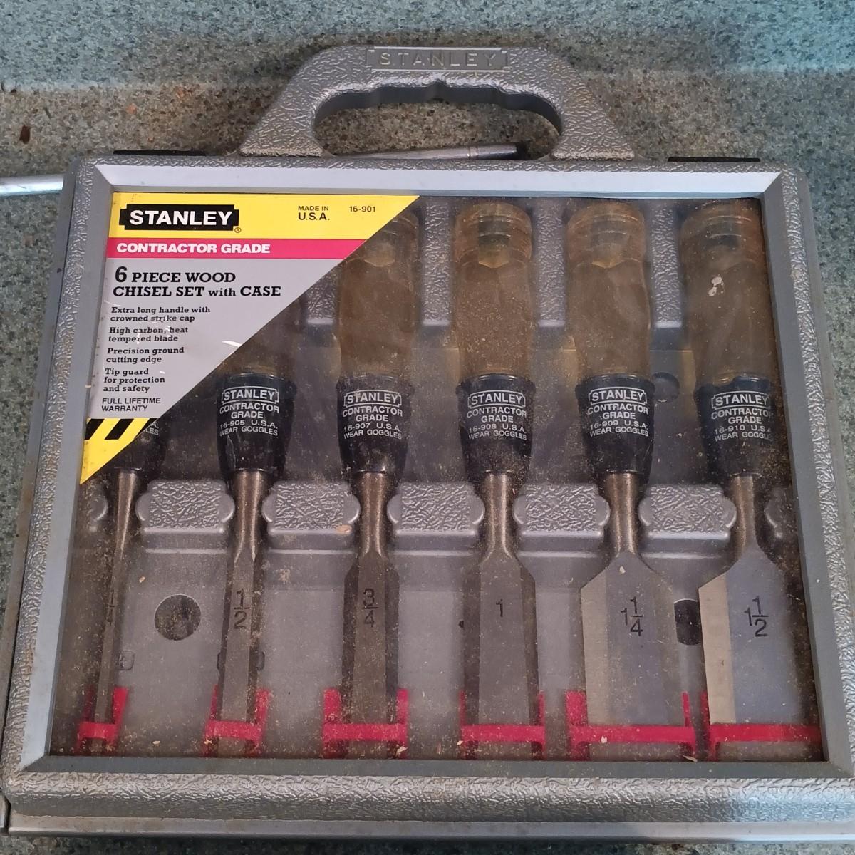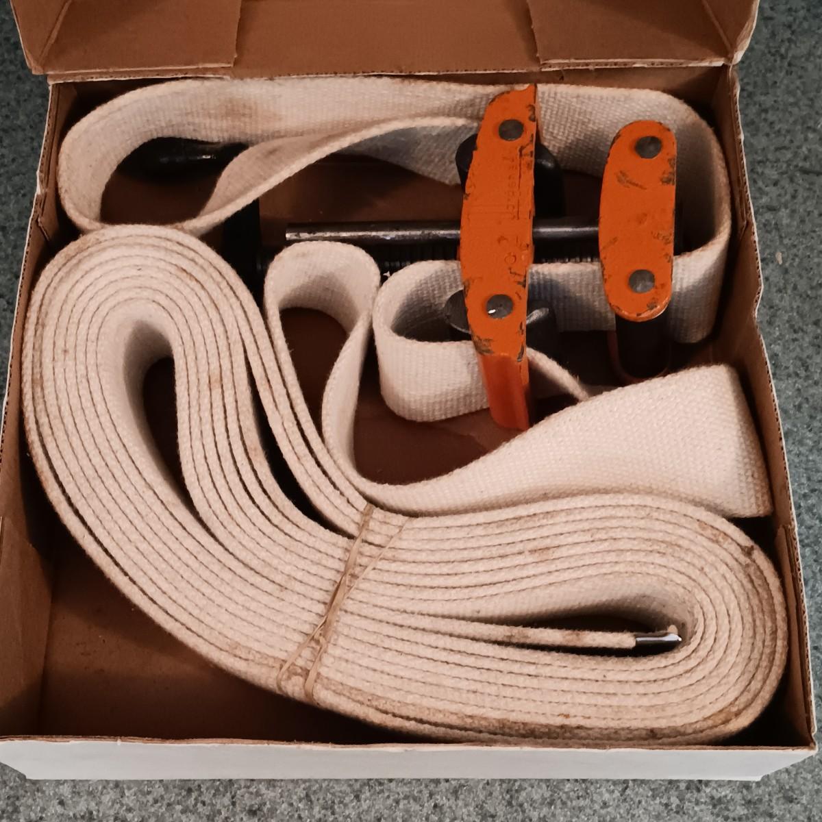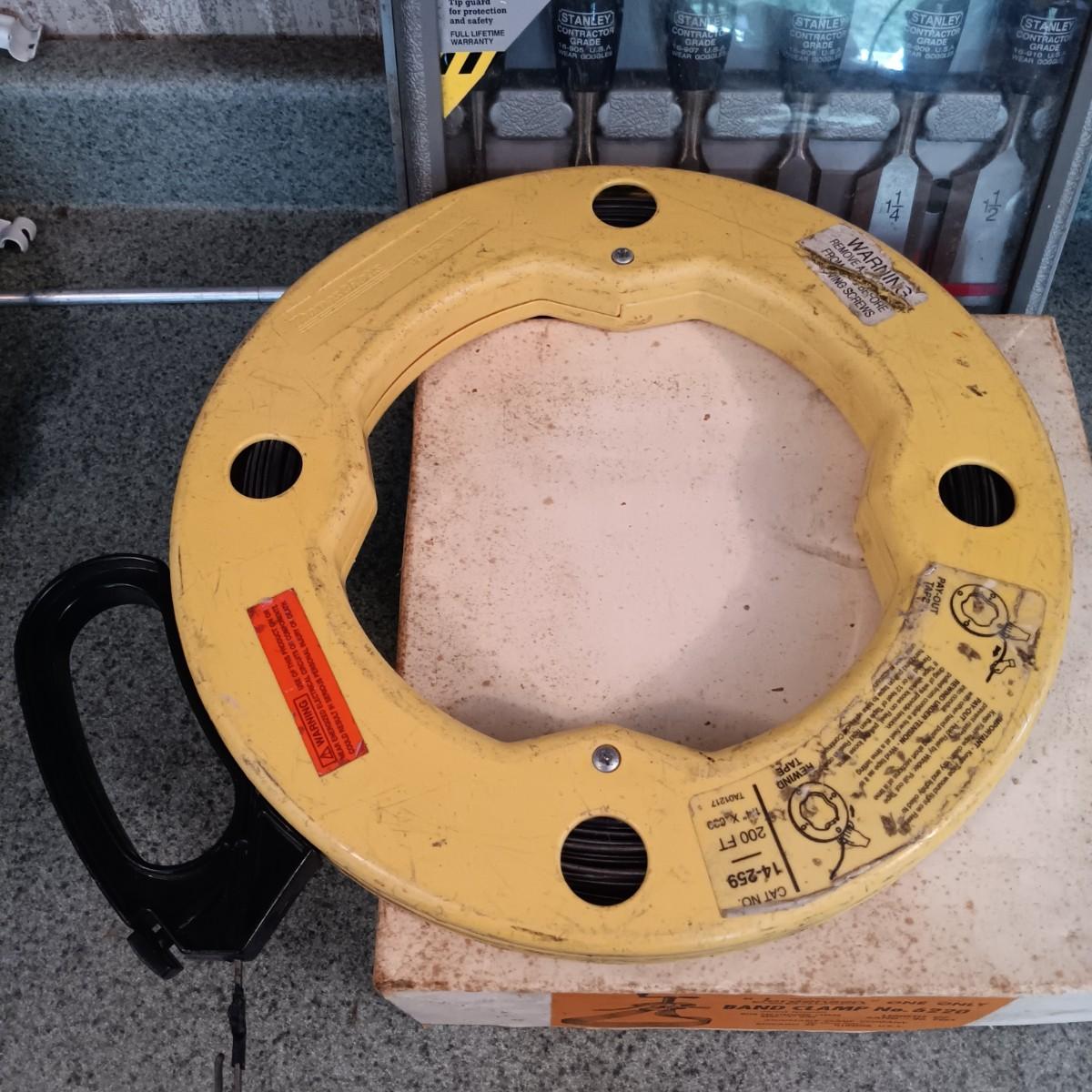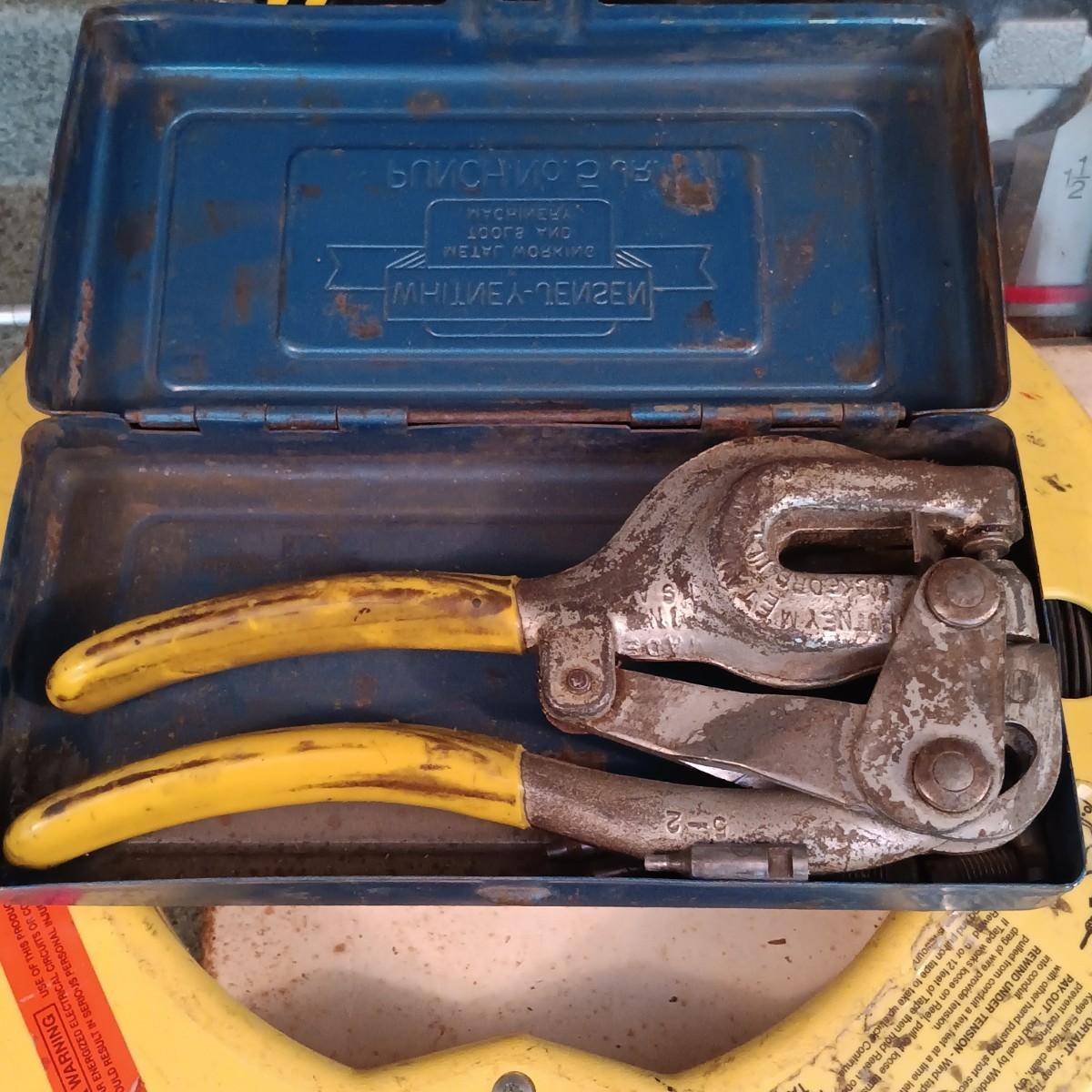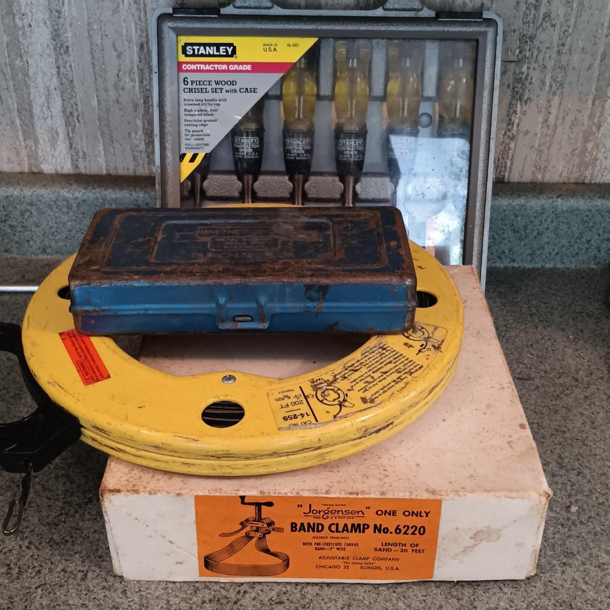 LOT 187: Whitney-Jensen Metal Working Punch, Thomas & Belts Fish Tape, Band Clamp and Stanley Chisel Set