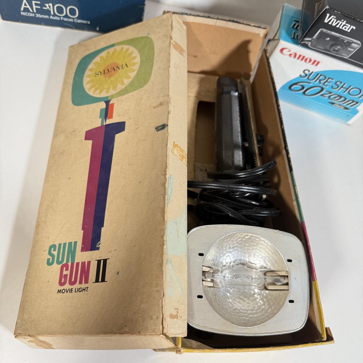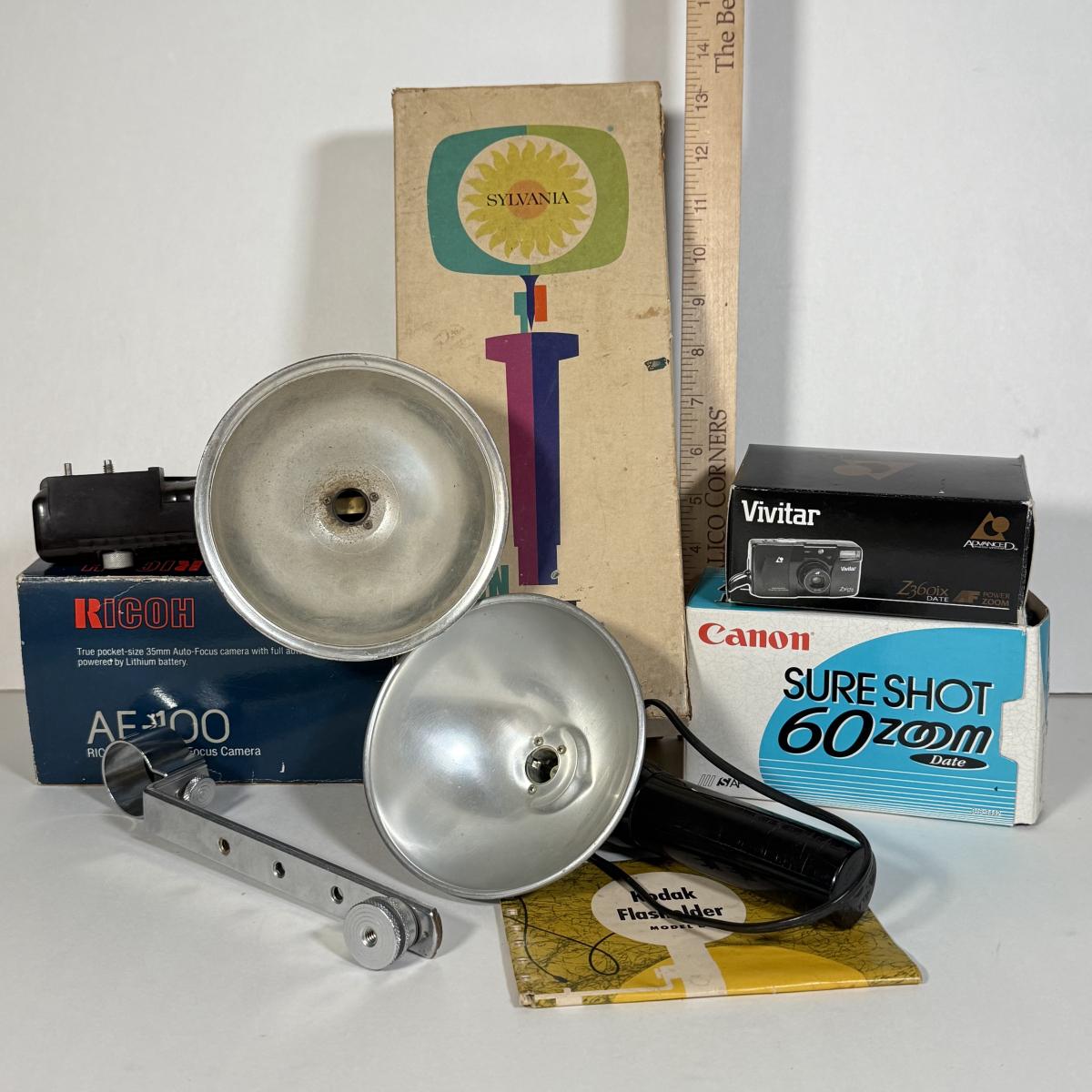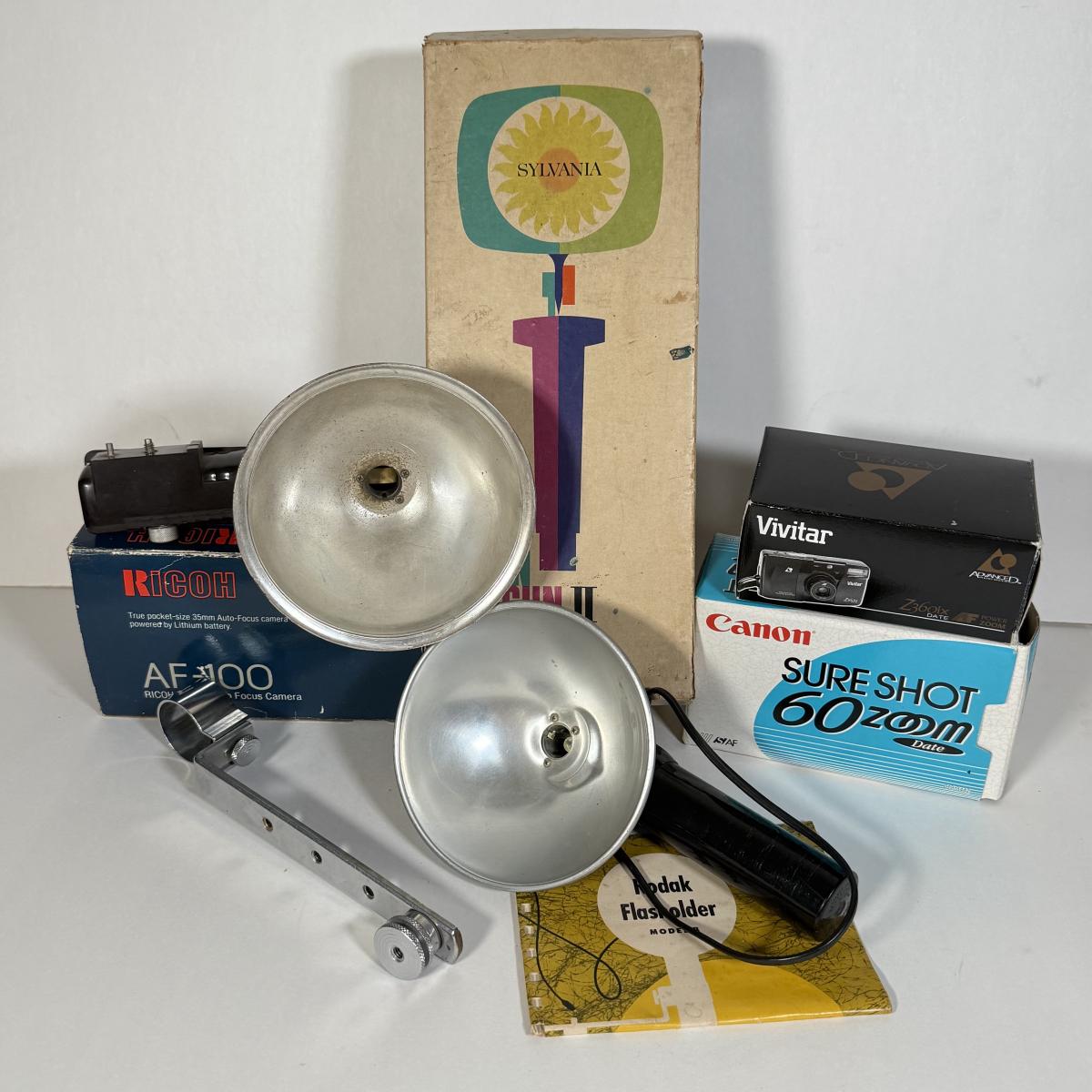 LOT 2D: Cameras & Equipment: Ricoh AF-100 35mm, Vivitar Z360ix, Canon Sure Shot 60 Zoom, Sylvania Sun Gun II Movie Light w/ Box & Kodak Flasholders