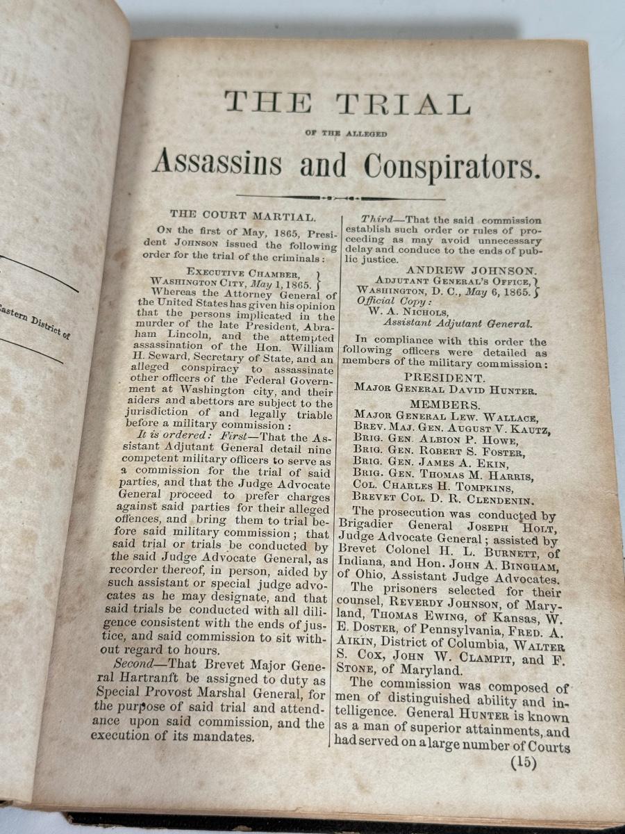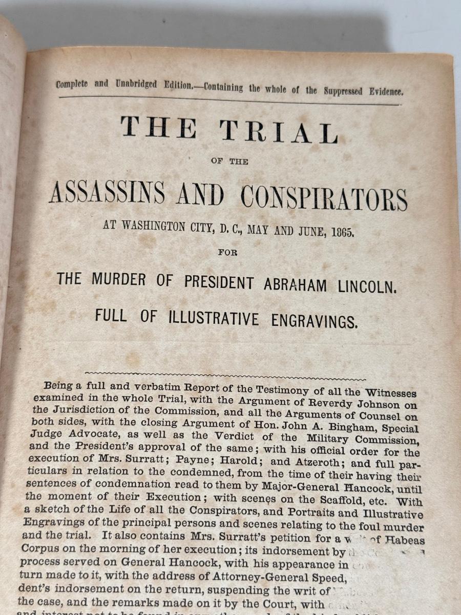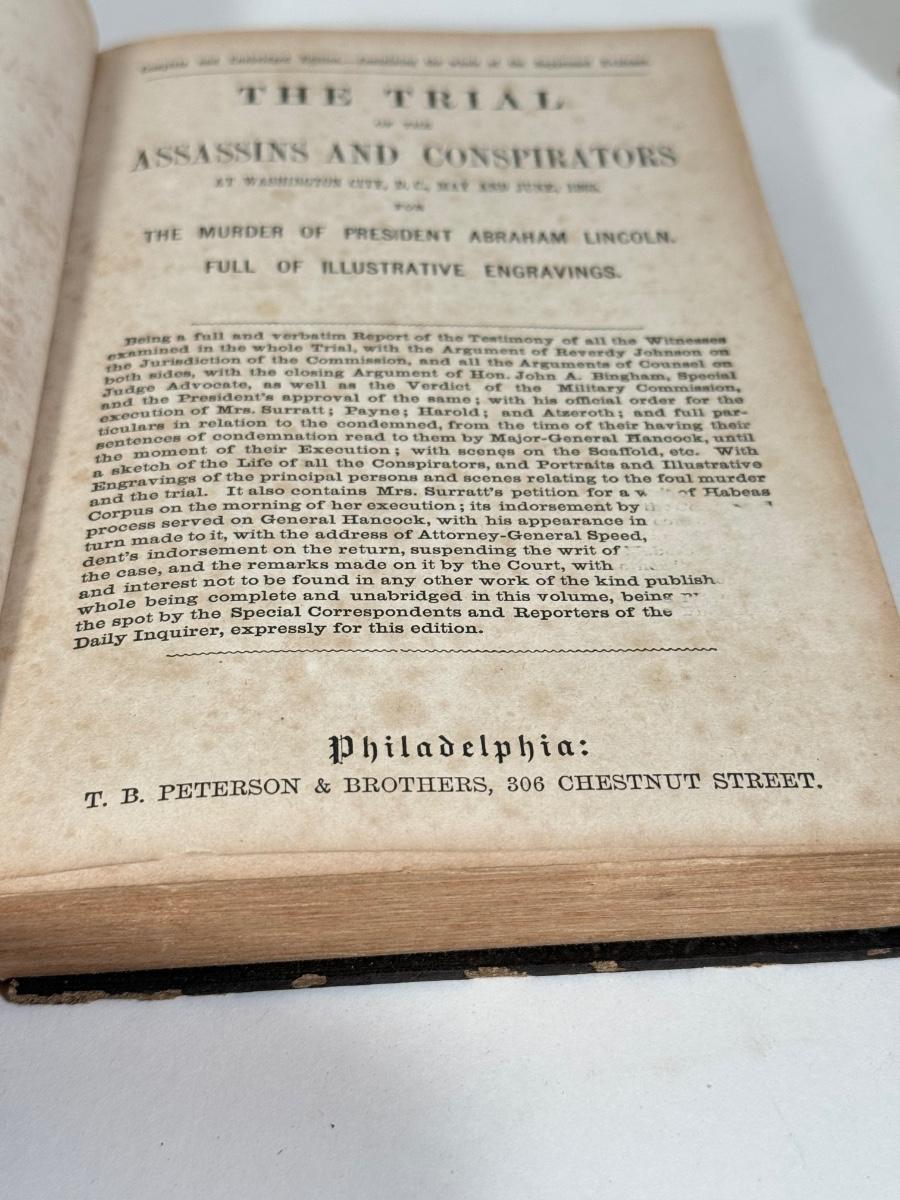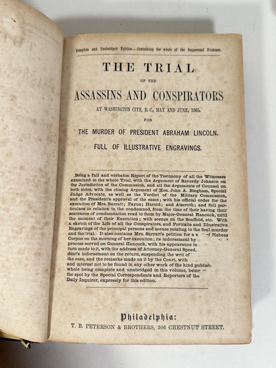 Trial book's full title is The Trial of the Assassins and Conspirators at Washington City, DC May and June 1965 for The Murder of President Abraham Lincoln. It is the complete and unabridged edition with the whole of the suppressed evidence. Published in Philadelphia by T B Peterson & Brothers and contains illustrative engravings.