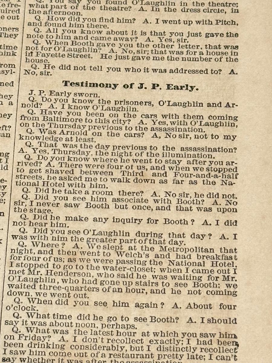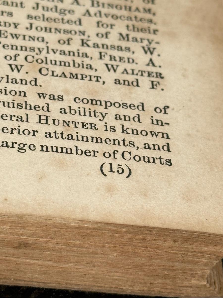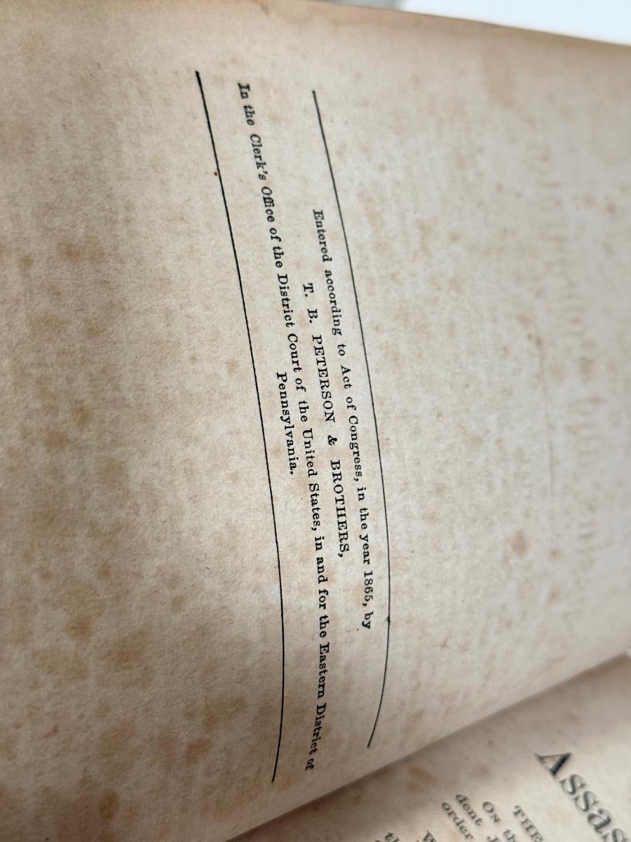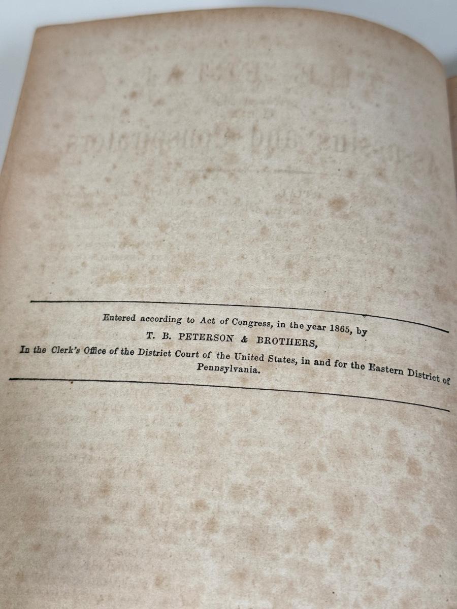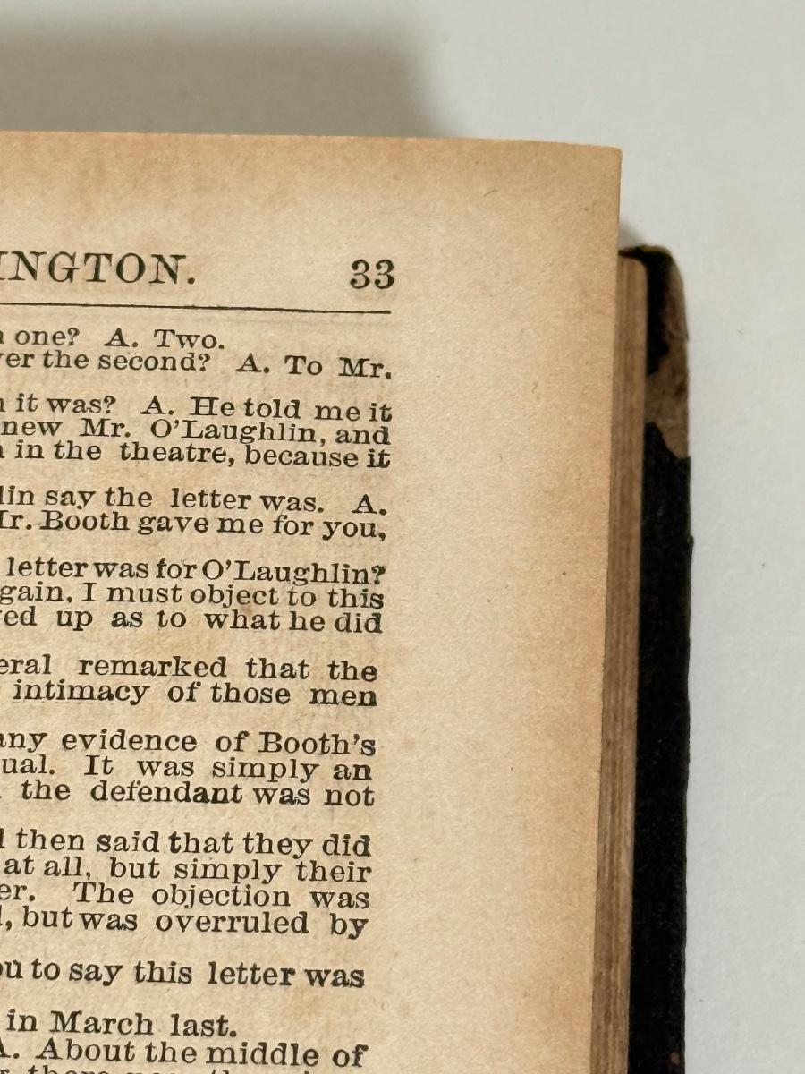 Trial book's full title is The Trial of the Assassins and Conspirators at Washington City, DC May and June 1965 for The Murder of President Abraham Lincoln. It is the complete and unabridged edition with the whole of the suppressed evidence. Published in Philadelphia by T B Peterson & Brothers and contains illustrative engravings.
