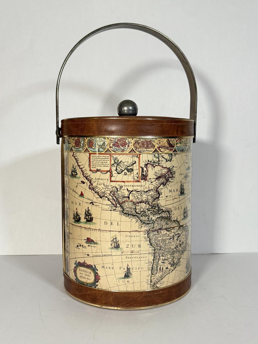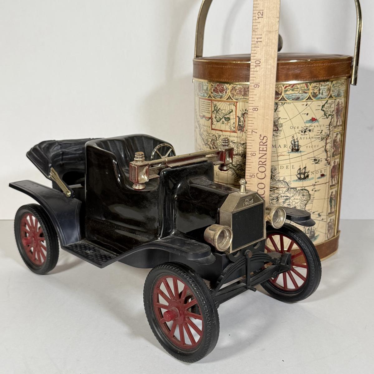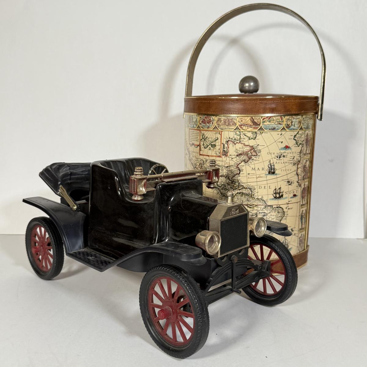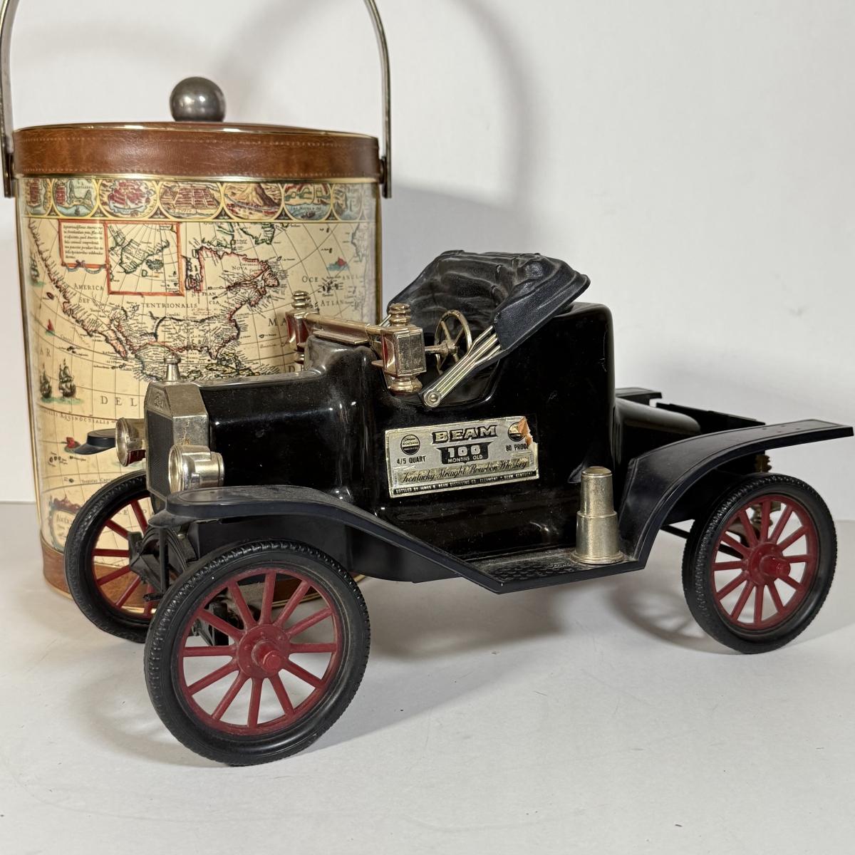 LOT 14K: Vintage Style Map Ice Bucket & Jim Beam Classic Ford Decanter (Empty)
