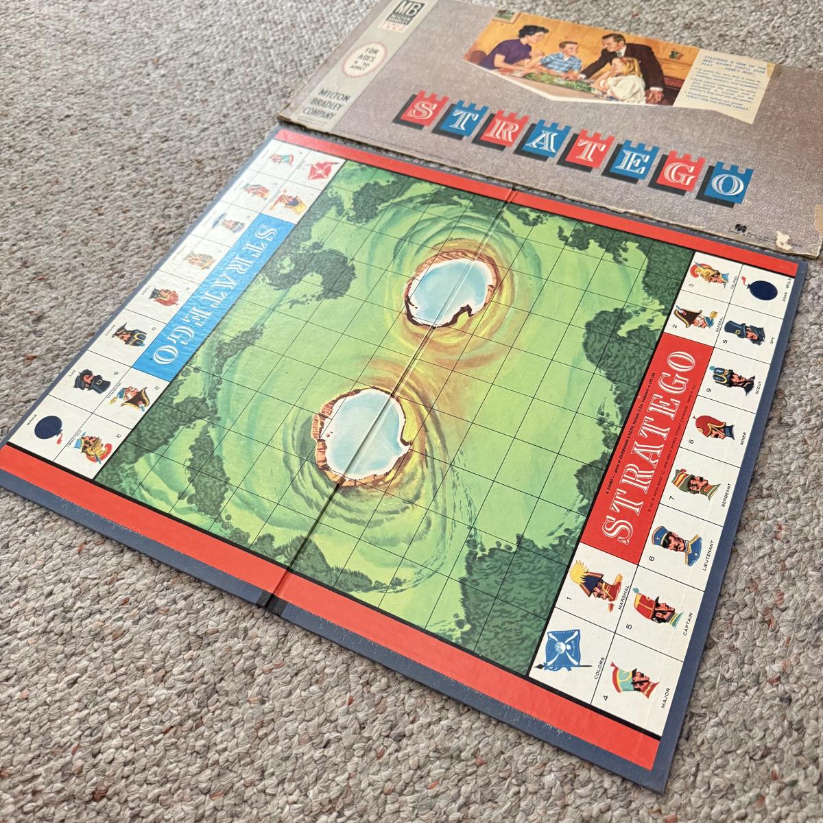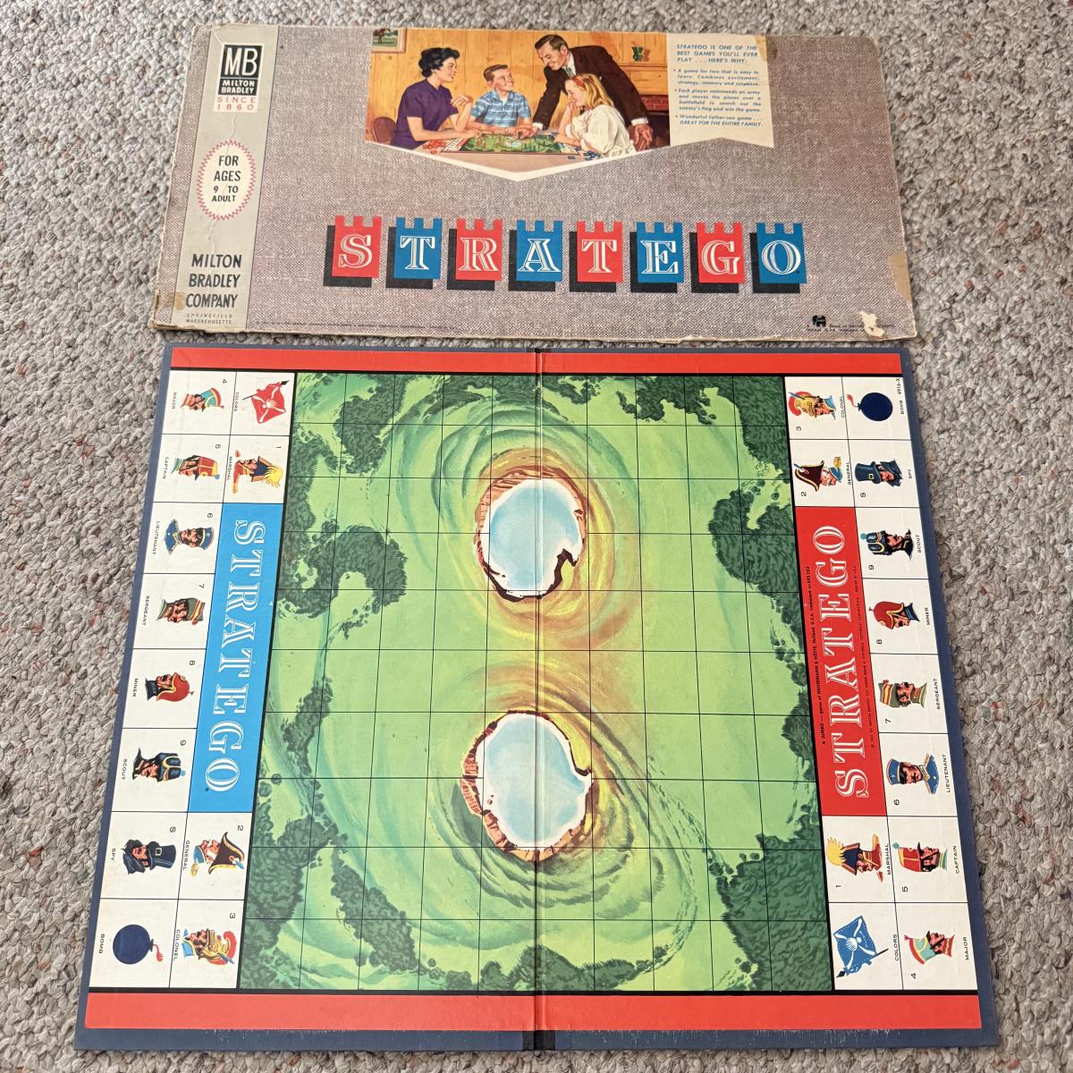 LOT 18L: Vintage Monopoly Game Board & Variety of Pieces, Milton Bradley Stay Alive Marble Game, Whitman Royal Rummy Play Mat, MB Solotaire & Vintage MB Stratego Board & Box Top