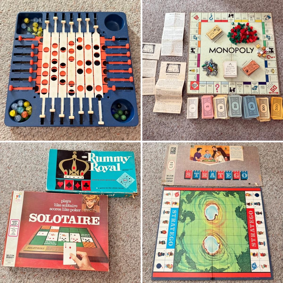 Games may not be complete. Monopoly pieces are a combination from several vintage sets.