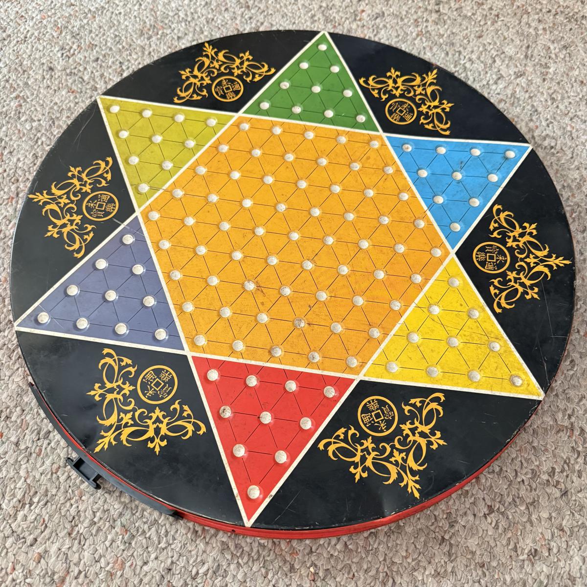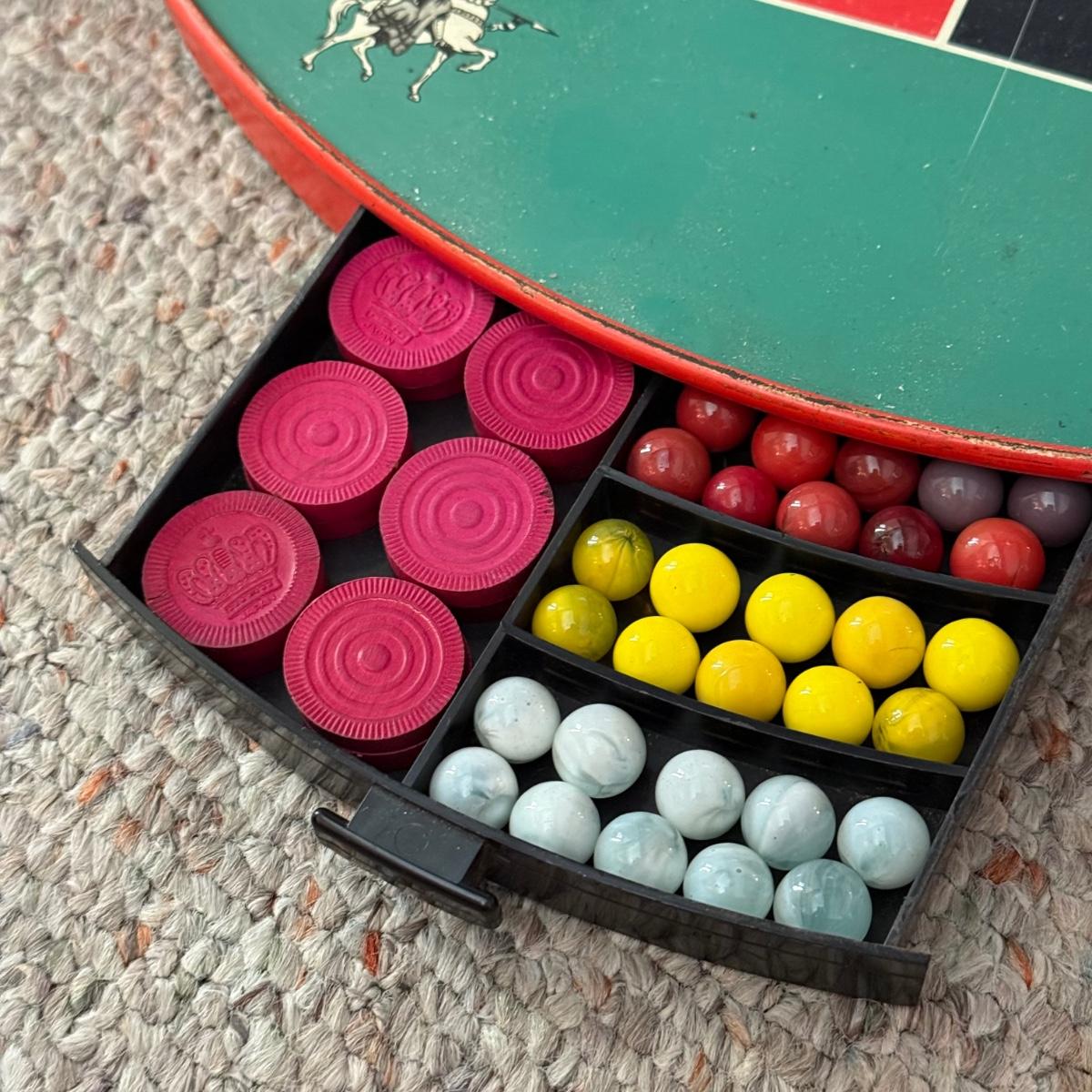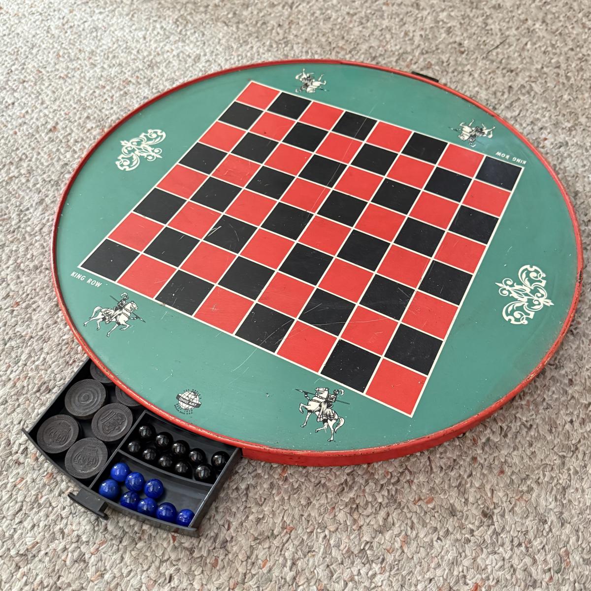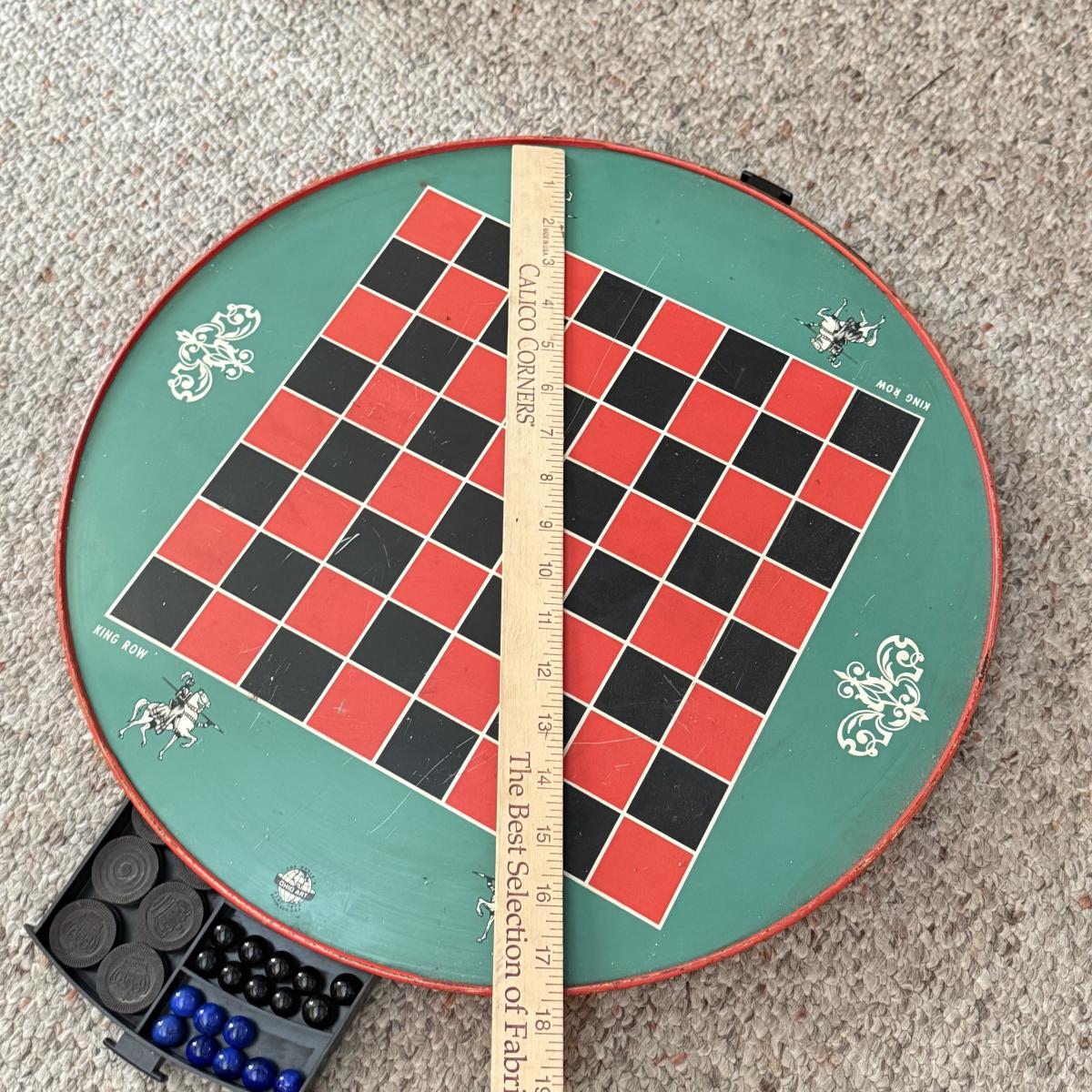 LOT 19L: Vintage Ohio Art Tin Litho Checkers/Chinese Checkers Circular Gameboard w/ Pieces in Drawers, Little Learners Memory Match, 1980s Home Run & More
