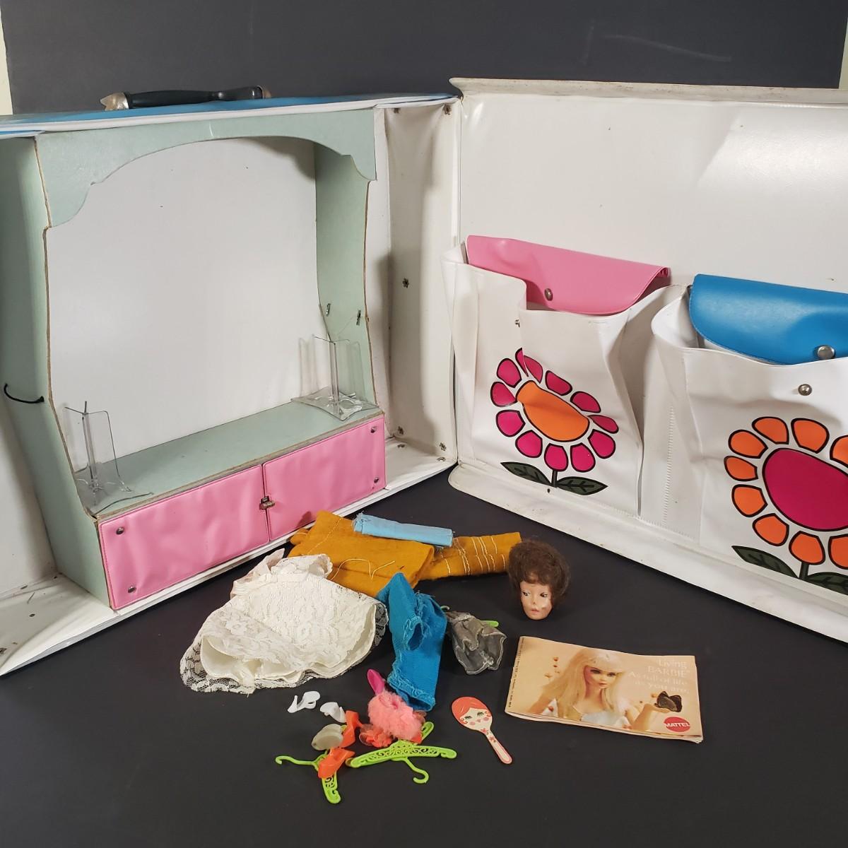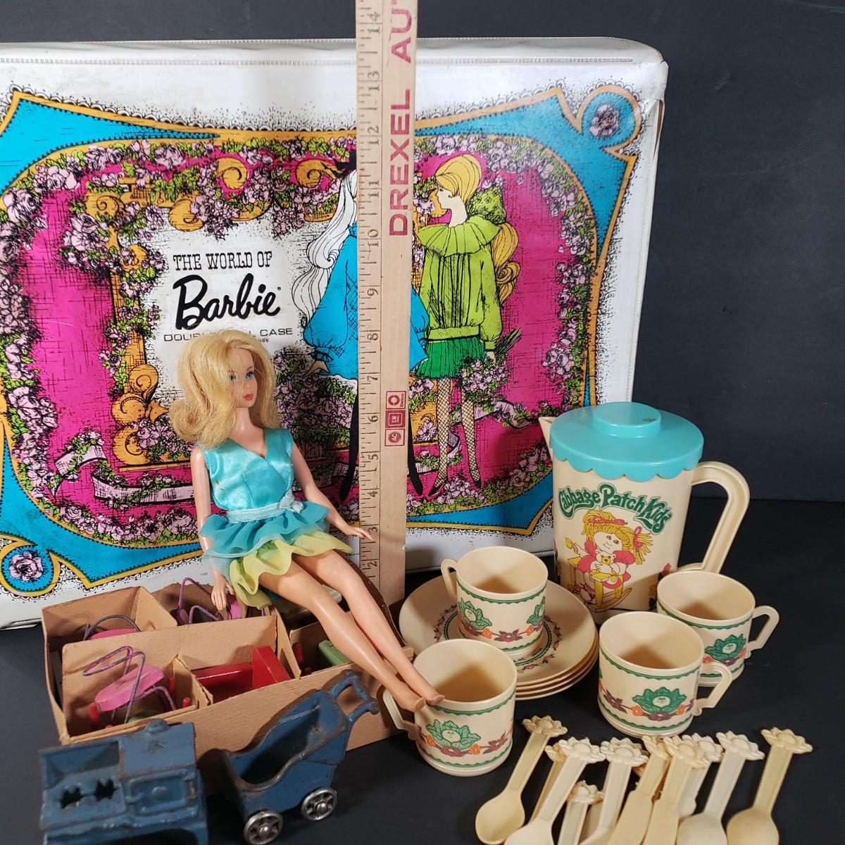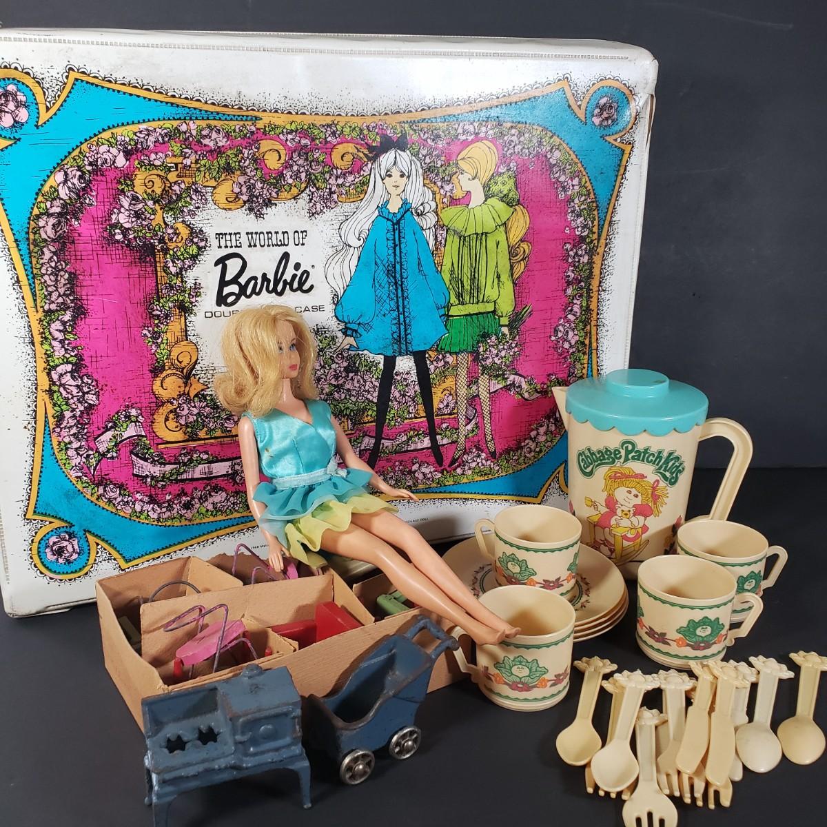 LOT 38X: Vintage 1968 Barbie Carrying Case with Accessories; 1984 Cabbage Patch Tea Set & Doll House Furniture with 2 Cast Iron Pieces