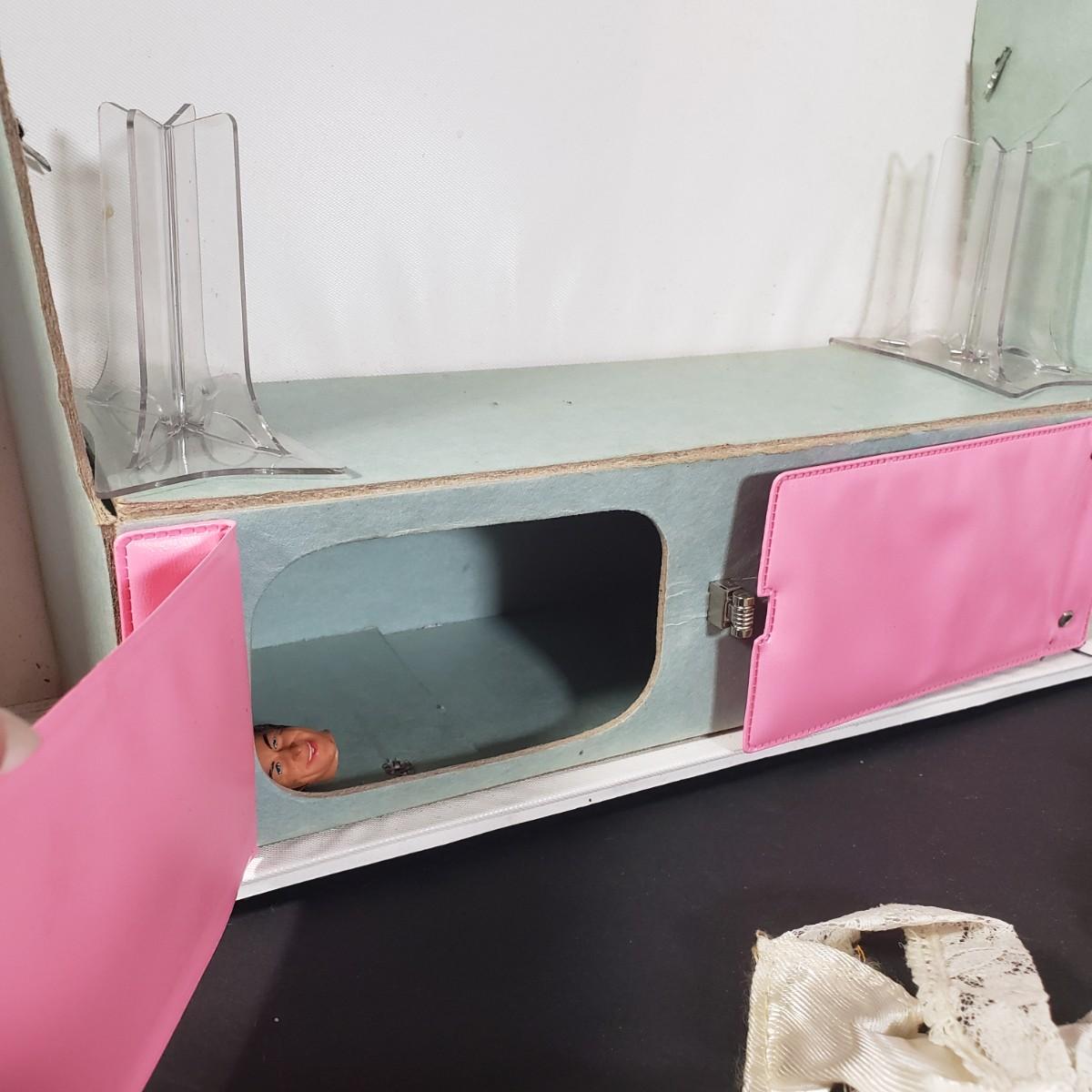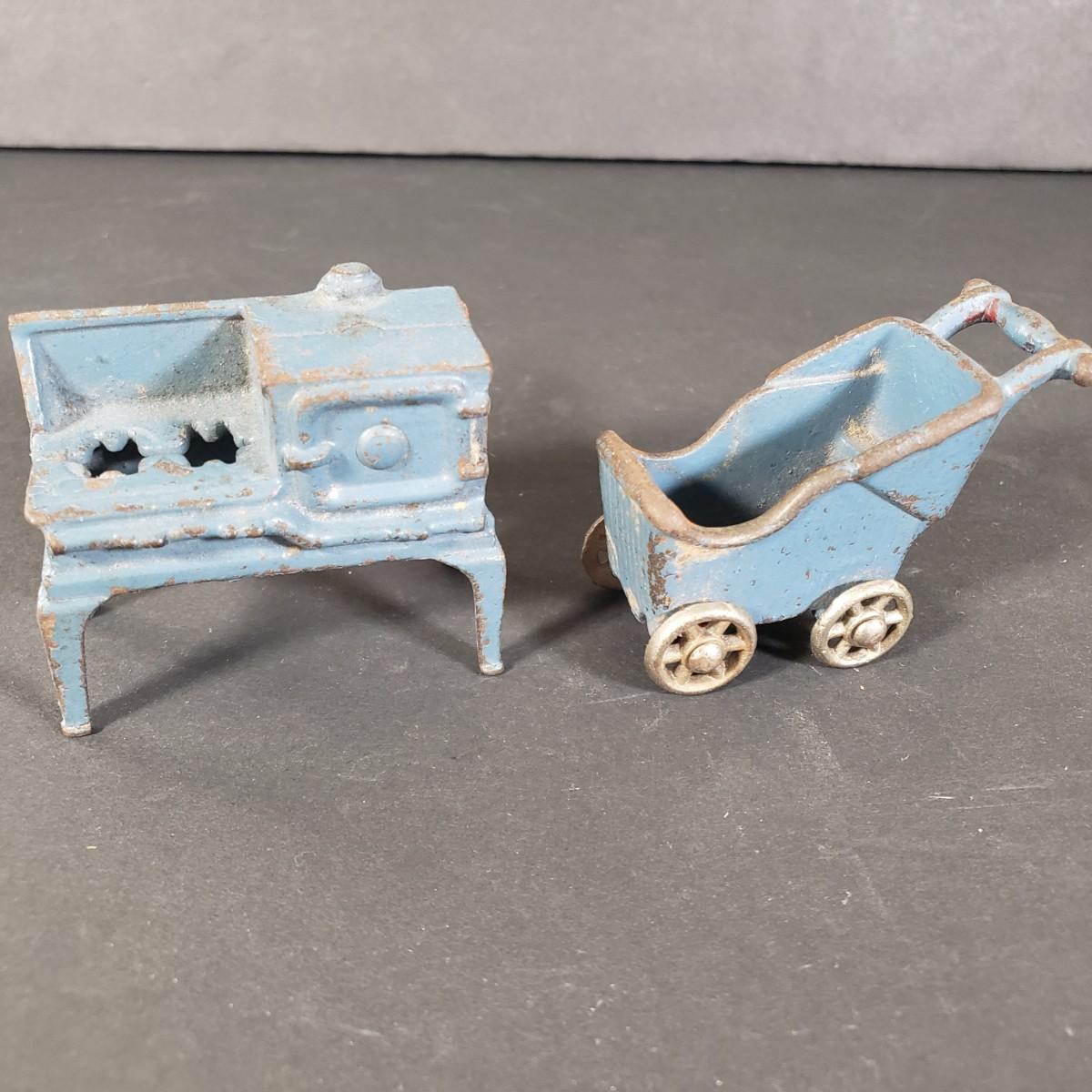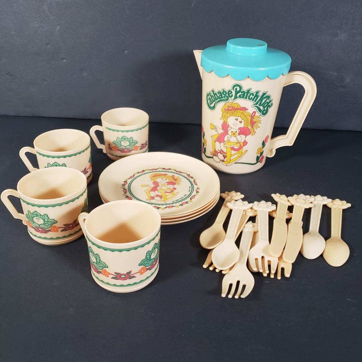LOT 38X: Vintage 1968 Barbie Carrying Case with Accessories; 1984 Cabbage Patch Tea Set & Doll House Furniture with 2 Cast Iron Pieces