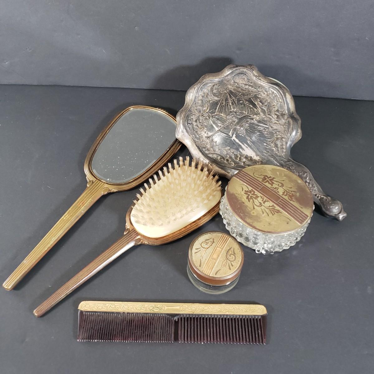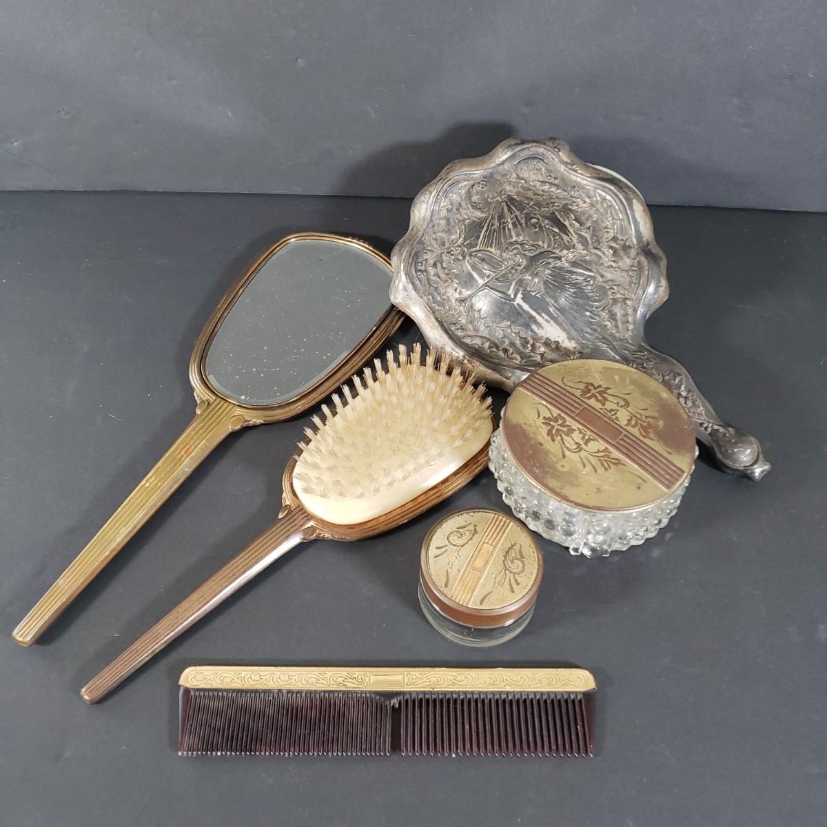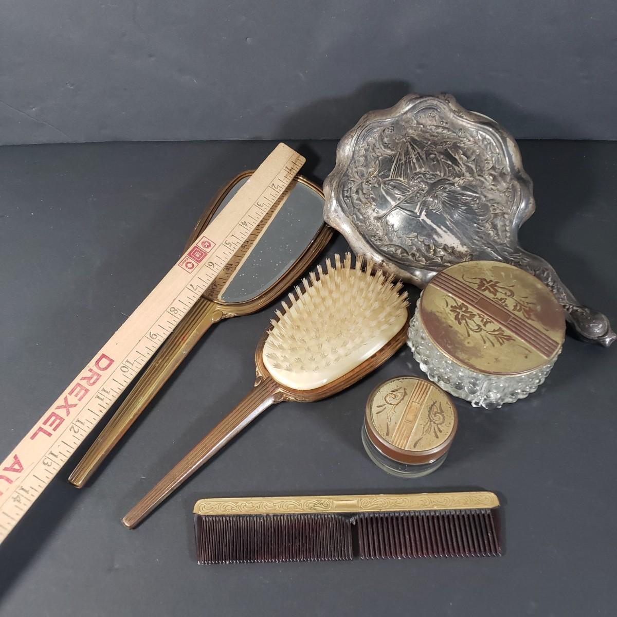 LOT 40X: Vintage Vanity Set with Art Nouveau Silver Tone Mirror