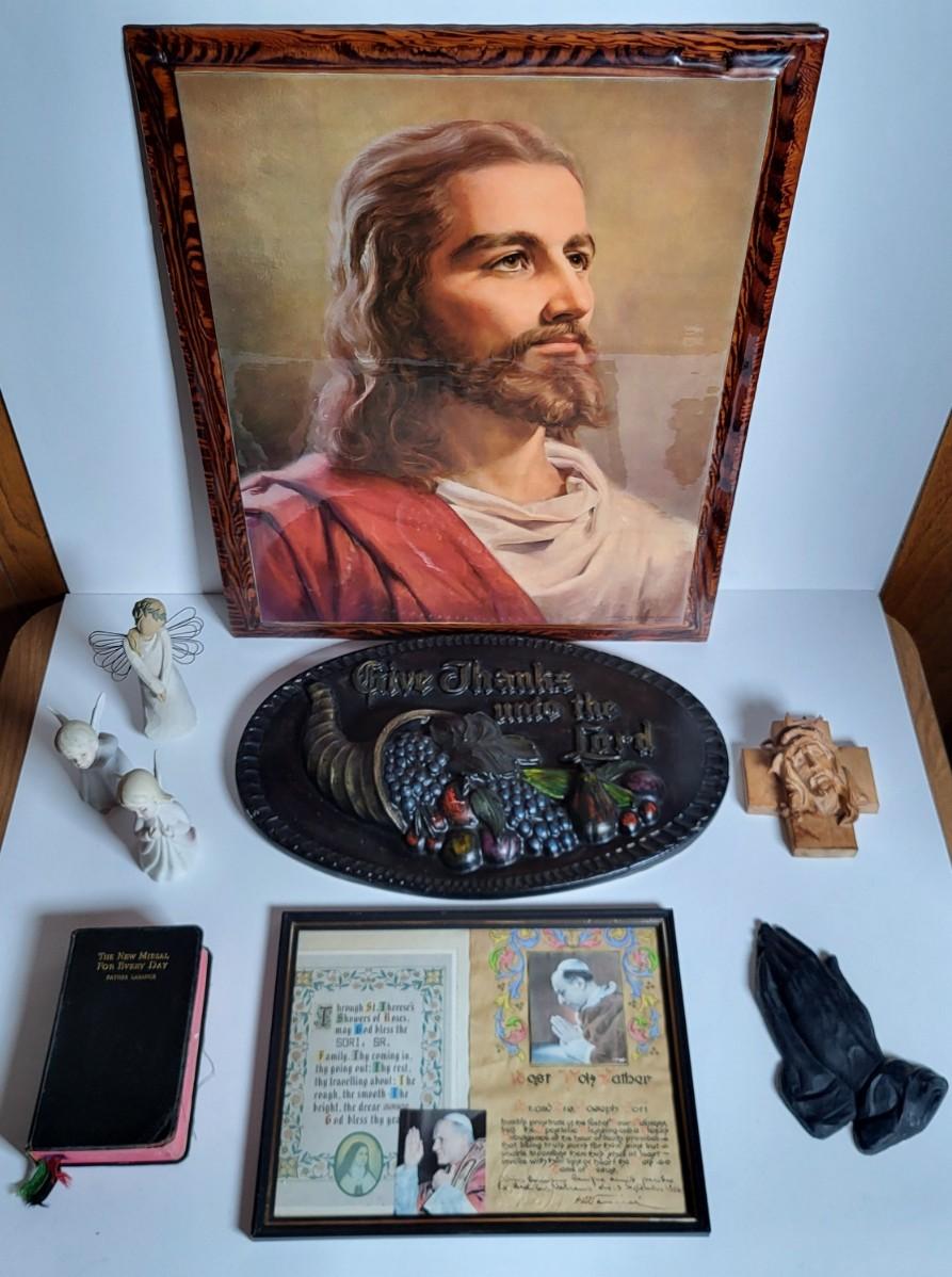 LOT 68L: Collection of Religious Items Including Holy Bible, Jesus Framed Painting and More