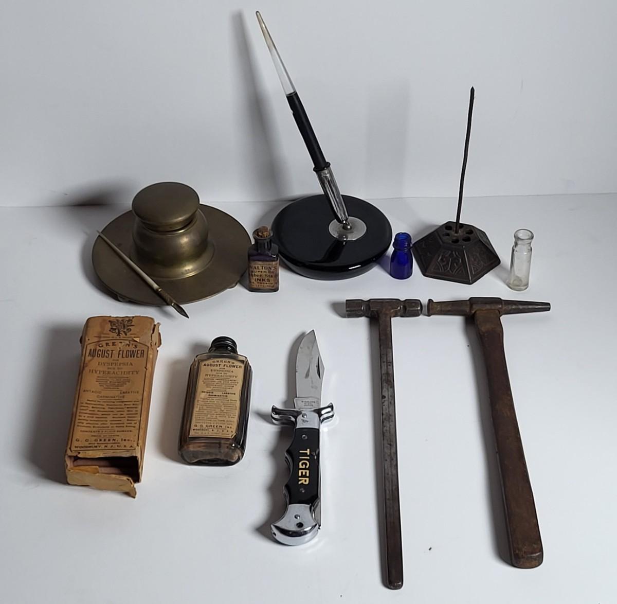 LOT 76L: Vintage Lot Including Stainless Steel Japanese Switchblade, Inkwells, Quills and More
