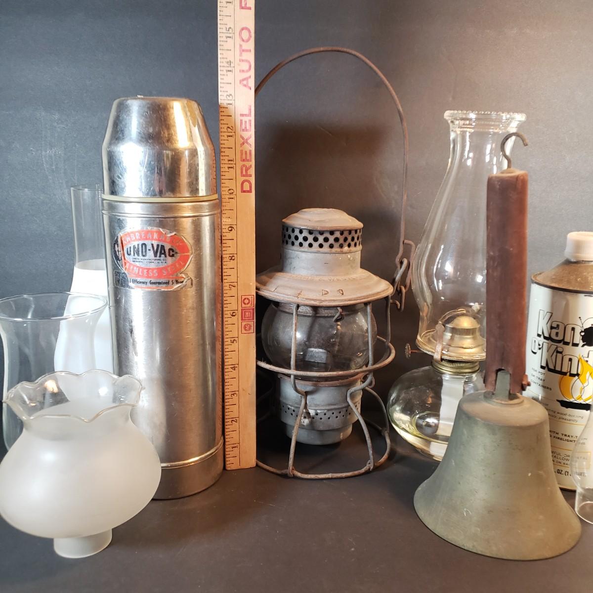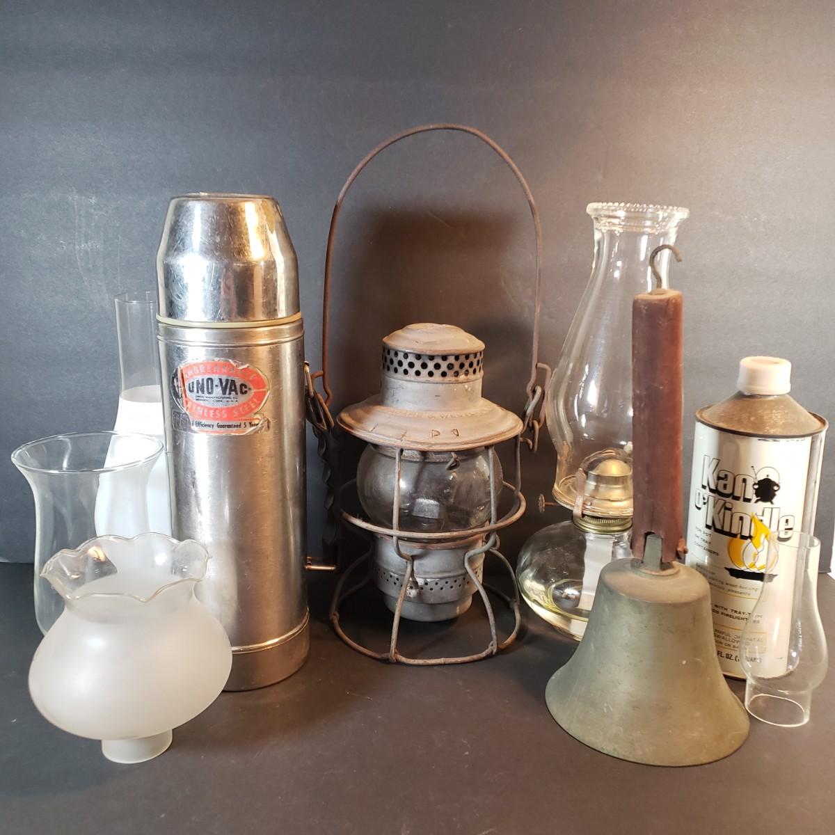 LOT 96D: Pennsylvania Railroad Kerosene Lamp, Stainless Steel Vintage Thermos & Lamp Accessories