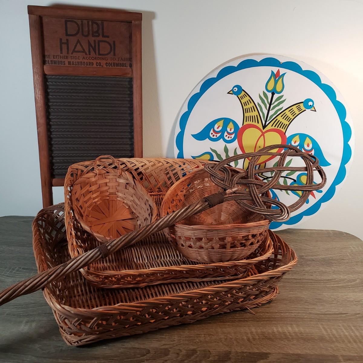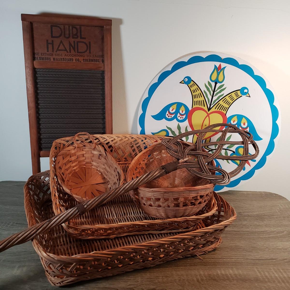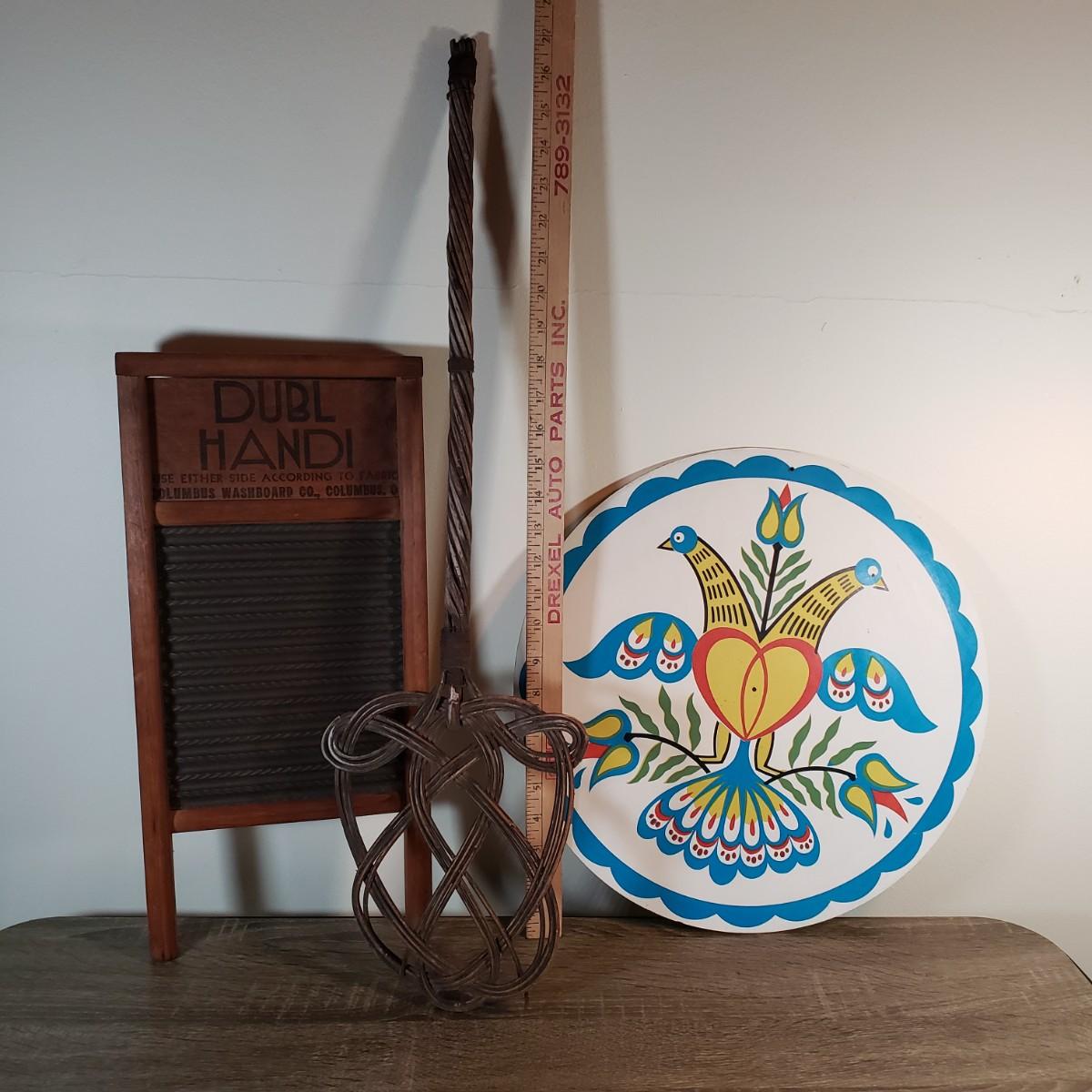 LOT 99X: Pennsylvania Dutch Wall Decor, Washboard, Rug Beater, Basket Collection