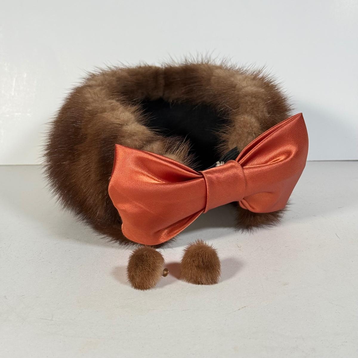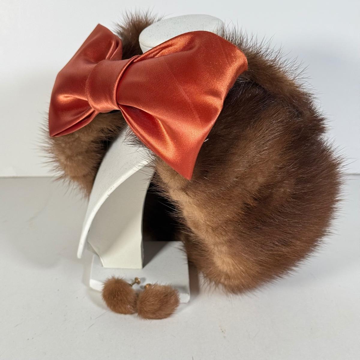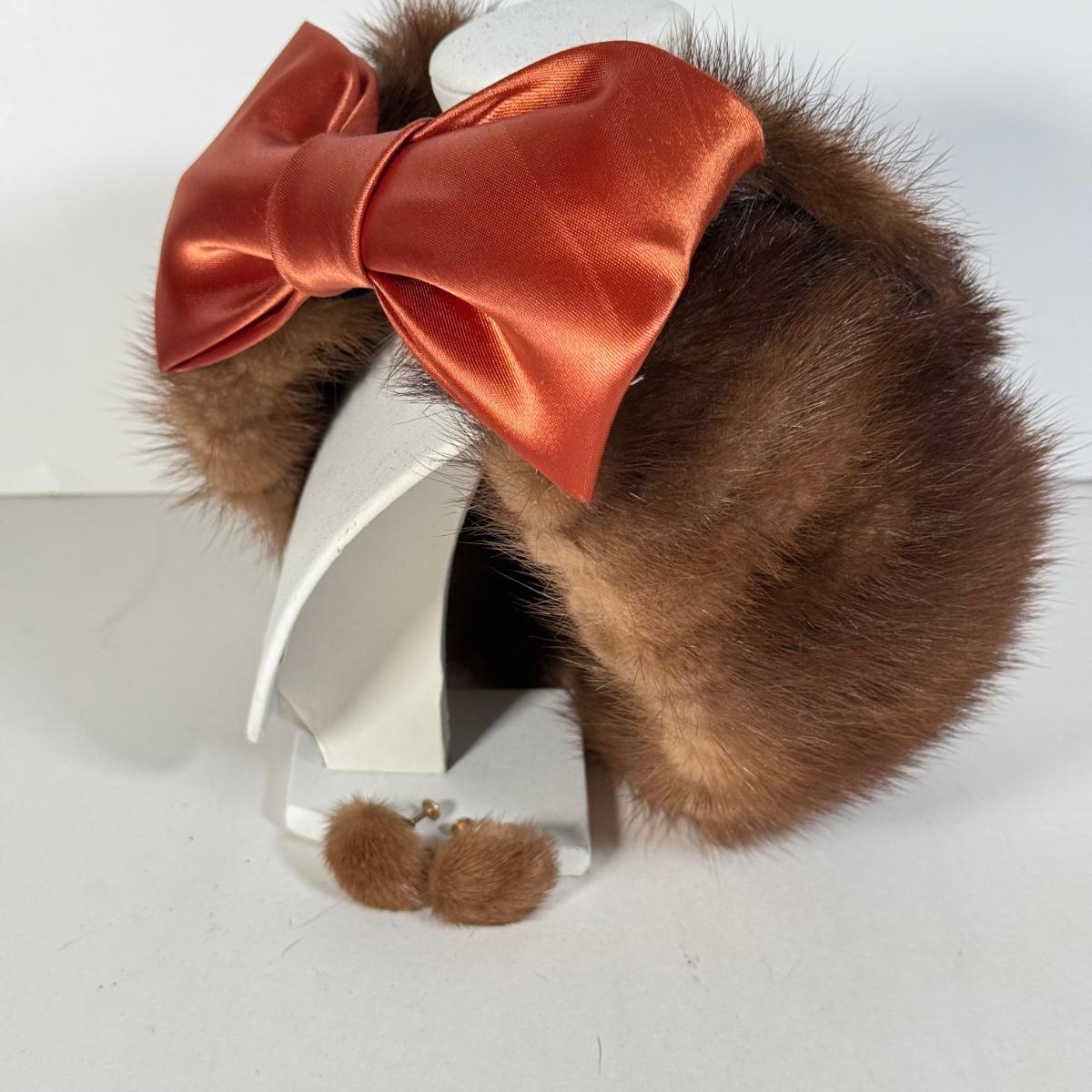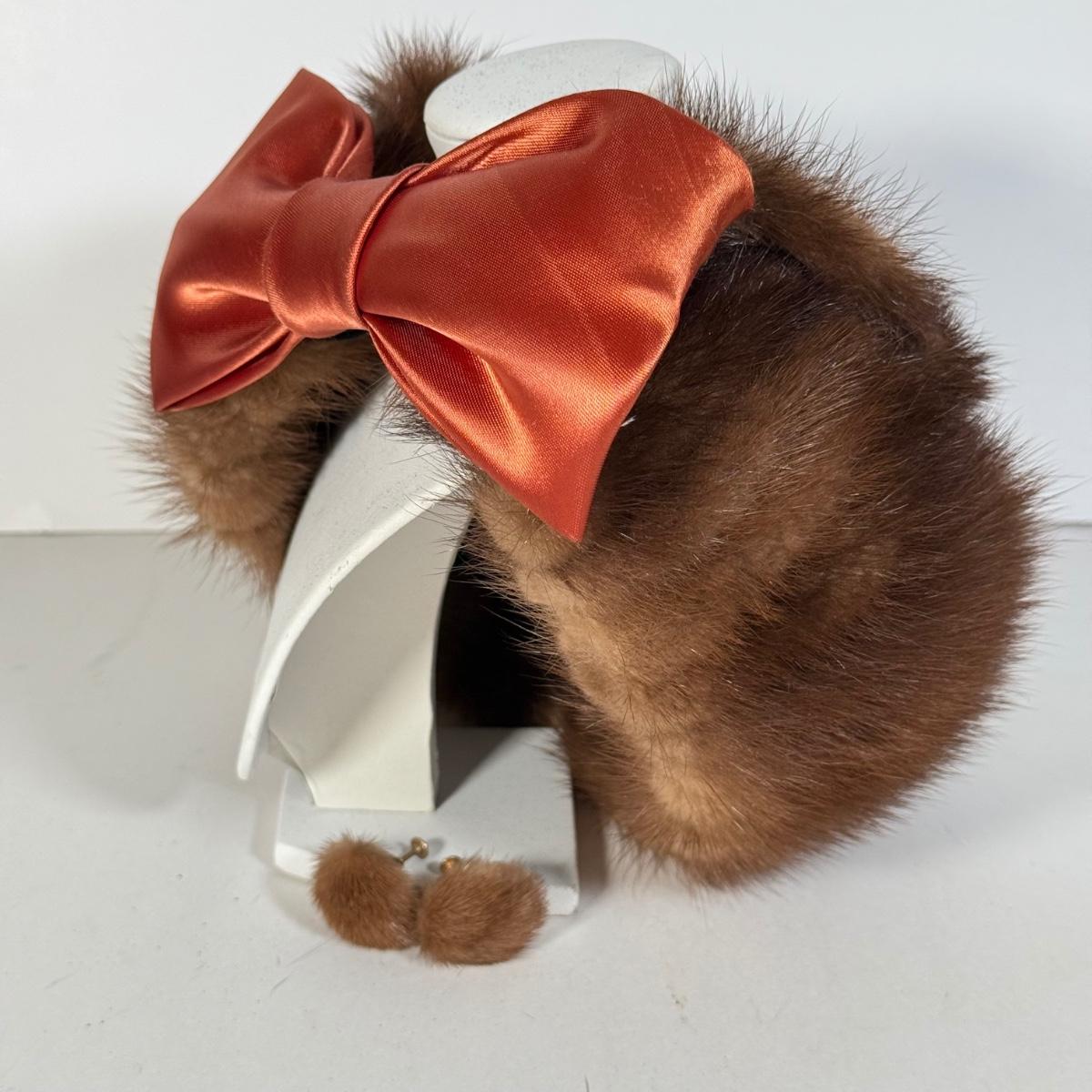 LOT 112D: Gorgeous Vintage Mink Fur Hat w/ Bow & Matching Screwback Earrings