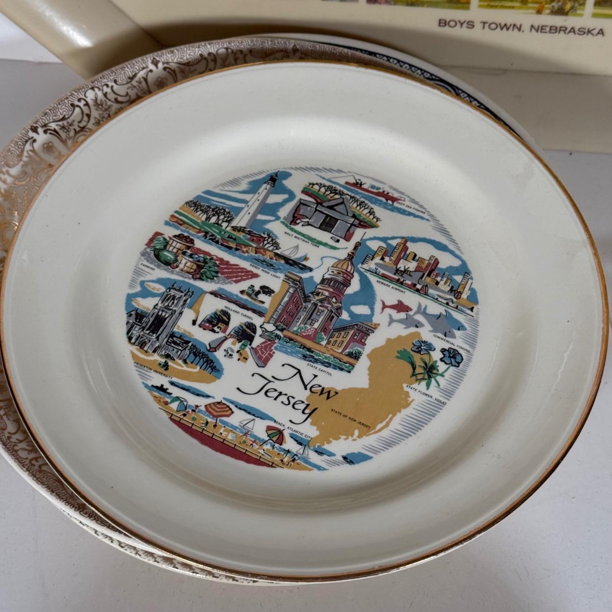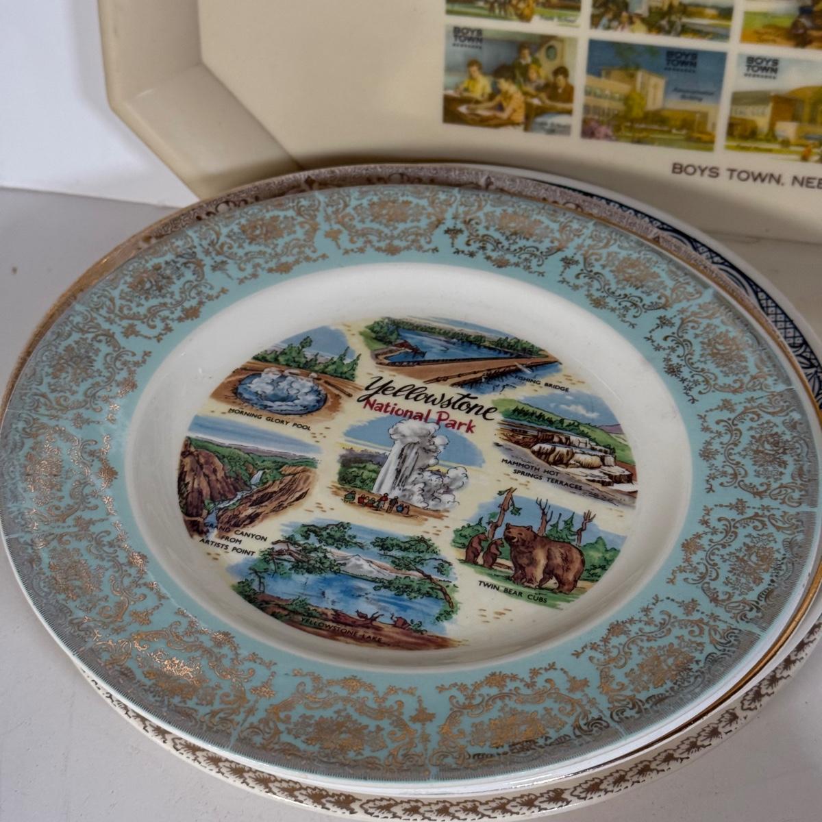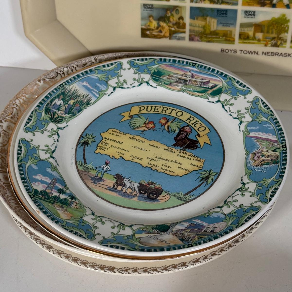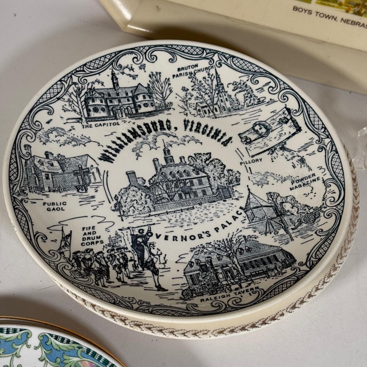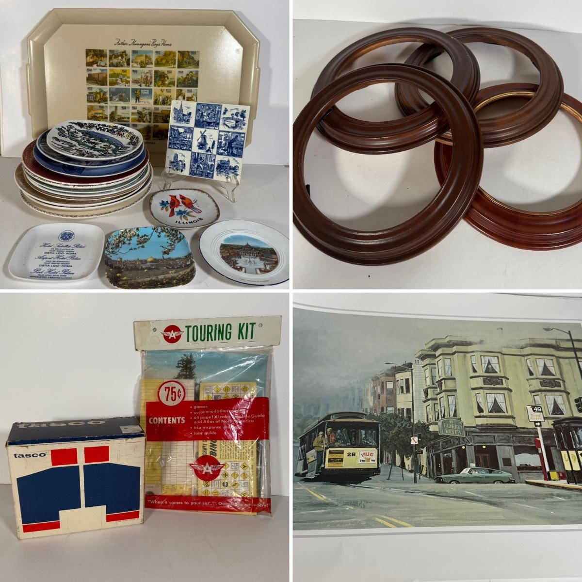 LOT 116D: Collection of Souvenir Plates, Wooden Plate Frames, Tasco Binoculars in Box & Vintage 1960s "Touring Kit"