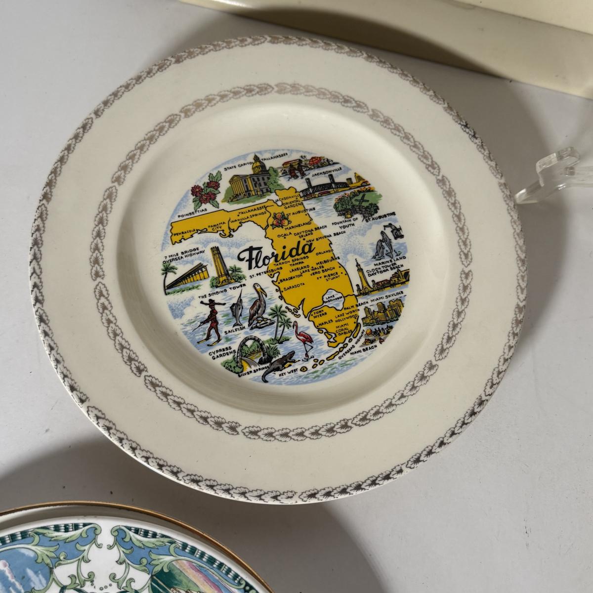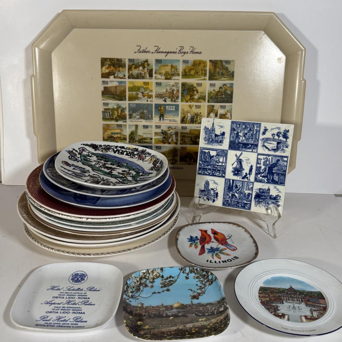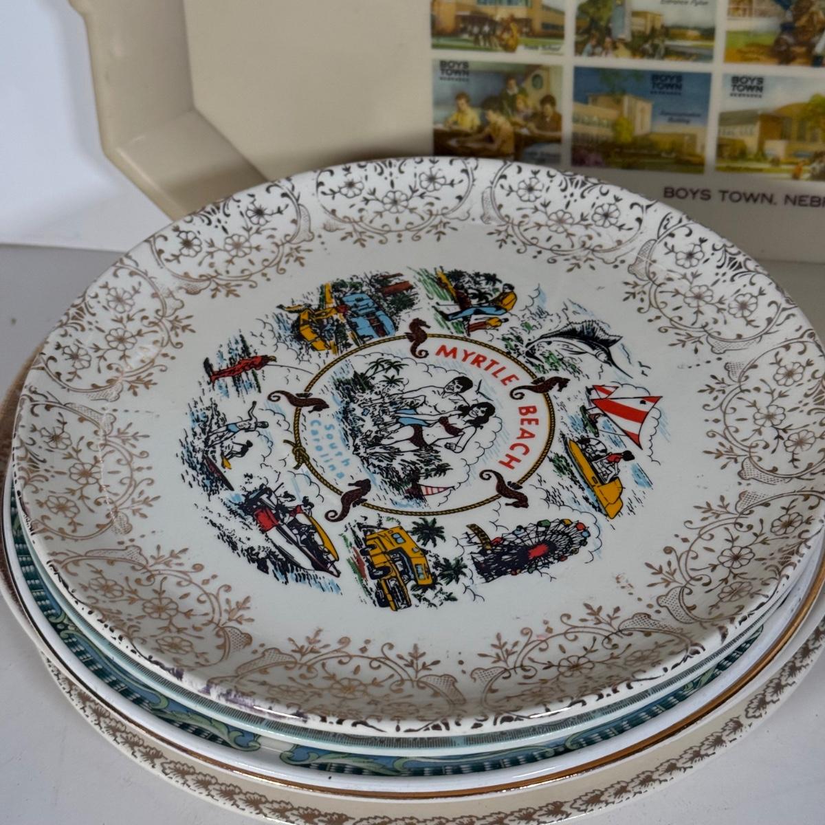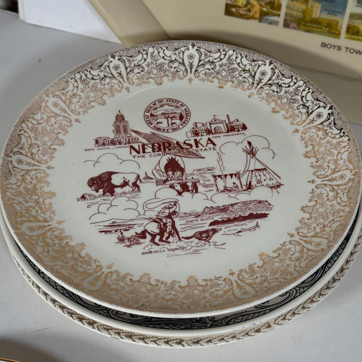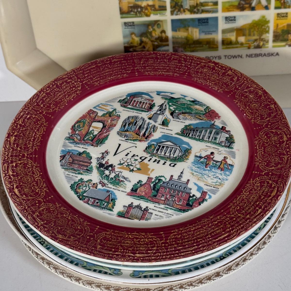 LOT 116D: Collection of Souvenir Plates, Wooden Plate Frames, Tasco Binoculars in Box & Vintage 1960s "Touring Kit"