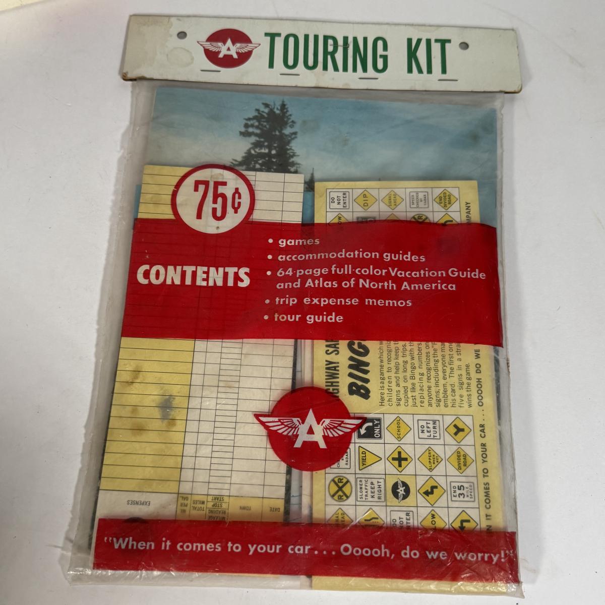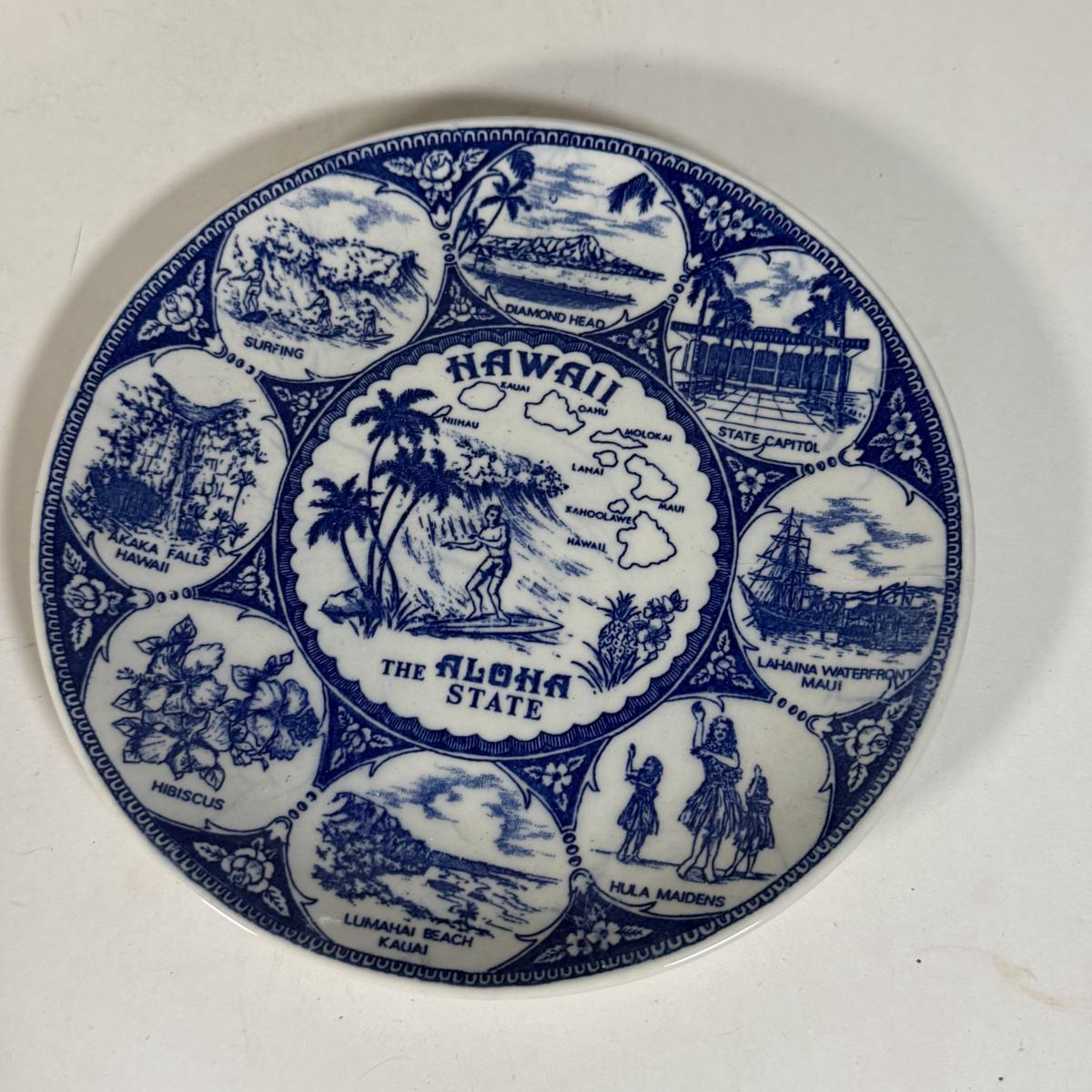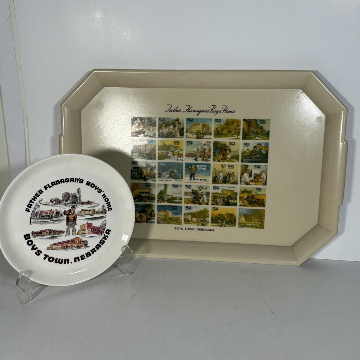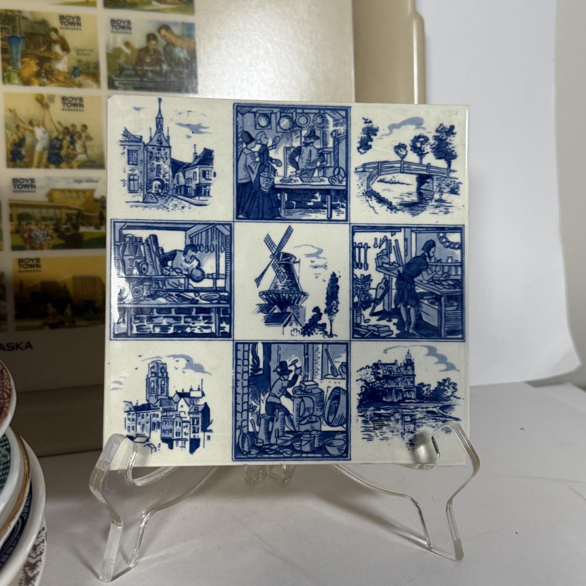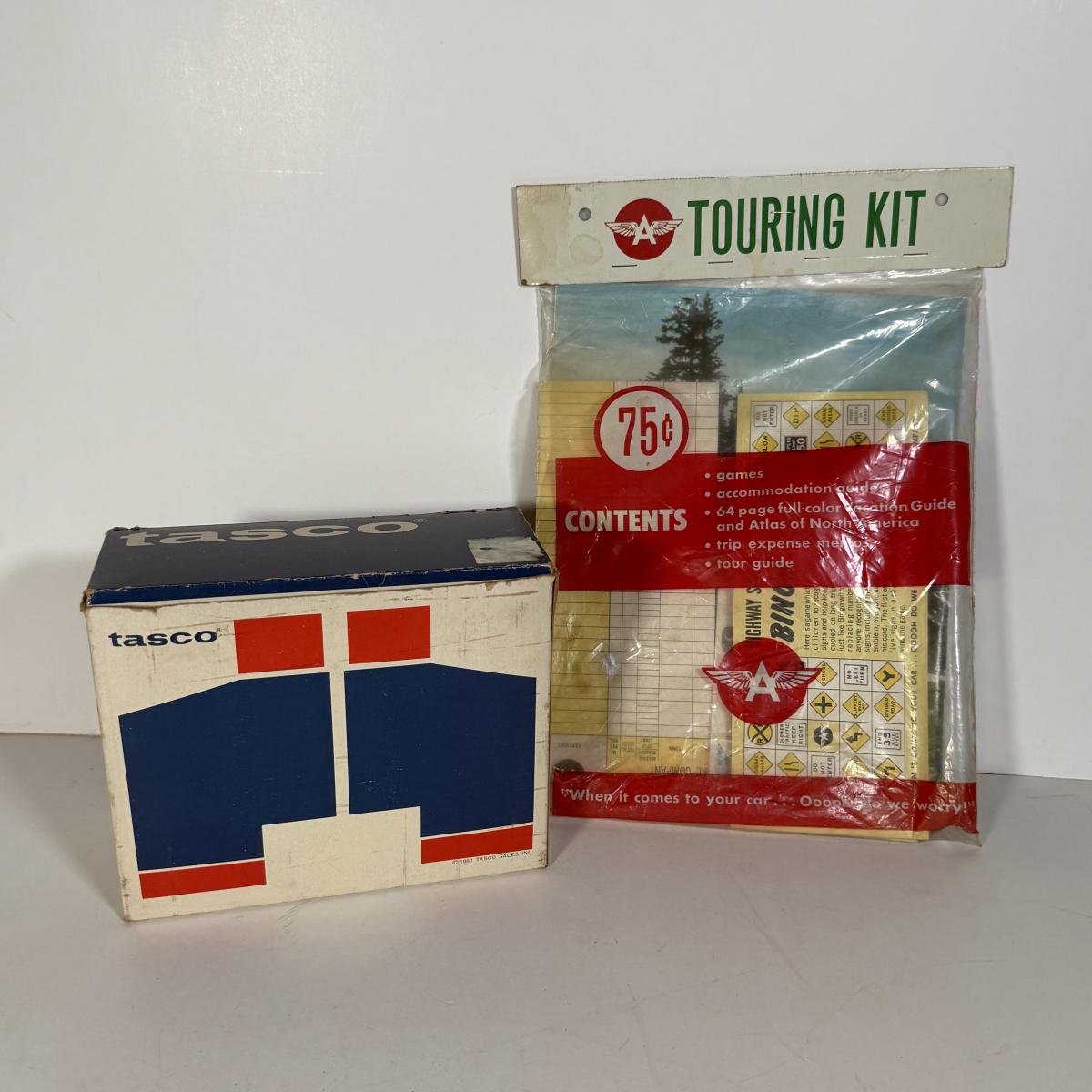 LOT 116D: Collection of Souvenir Plates, Wooden Plate Frames, Tasco Binoculars in Box & Vintage 1960s "Touring Kit"