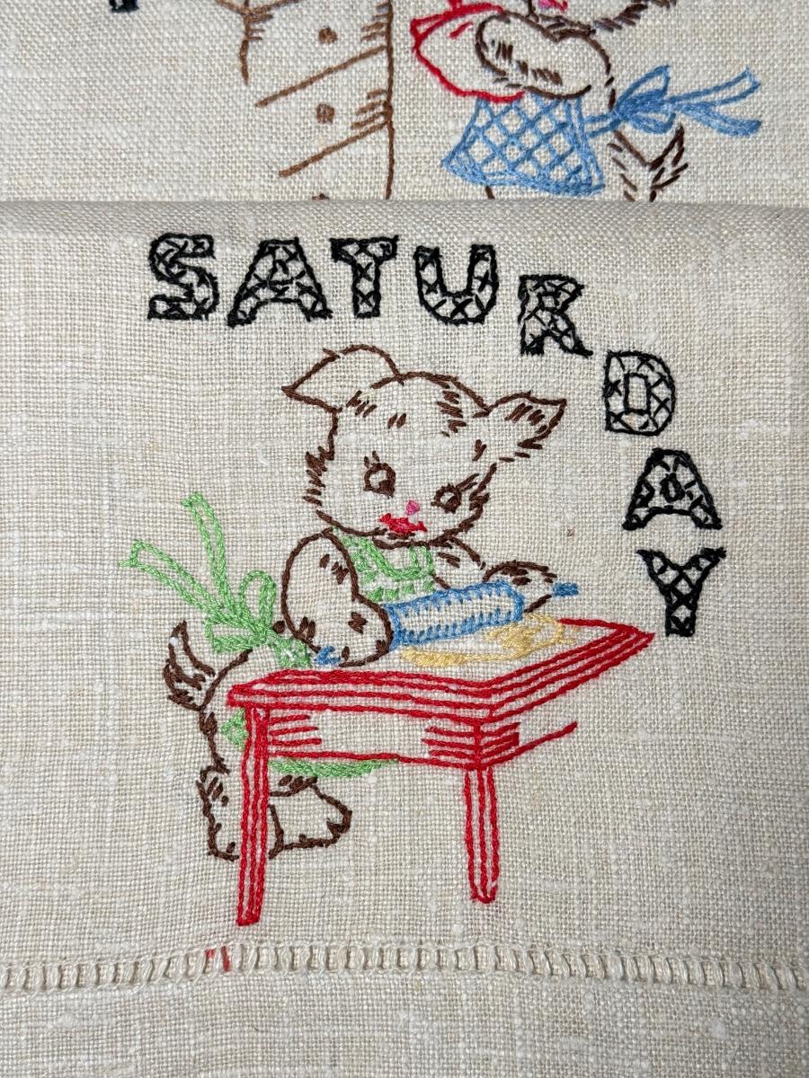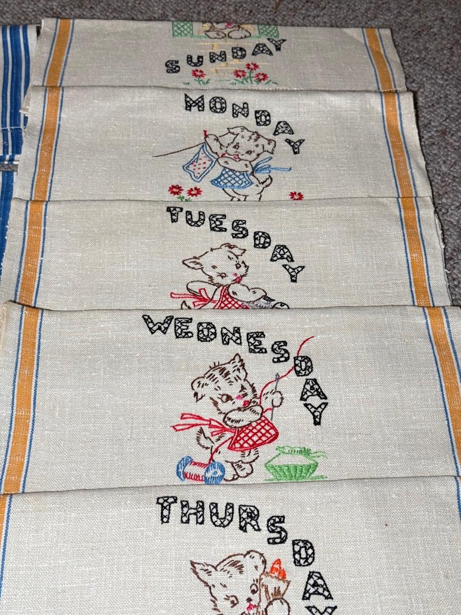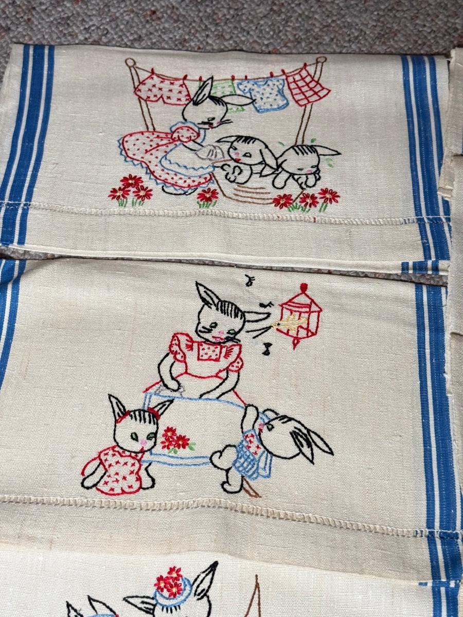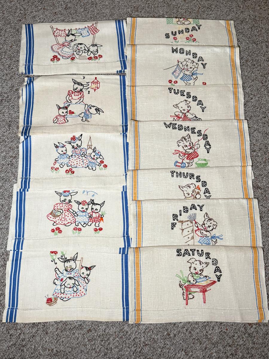 LOT 120D: Adorable Hand Made Embroidered Days of the Week Tea Towels w/ Bunny Rabbit Scene Tea Towels