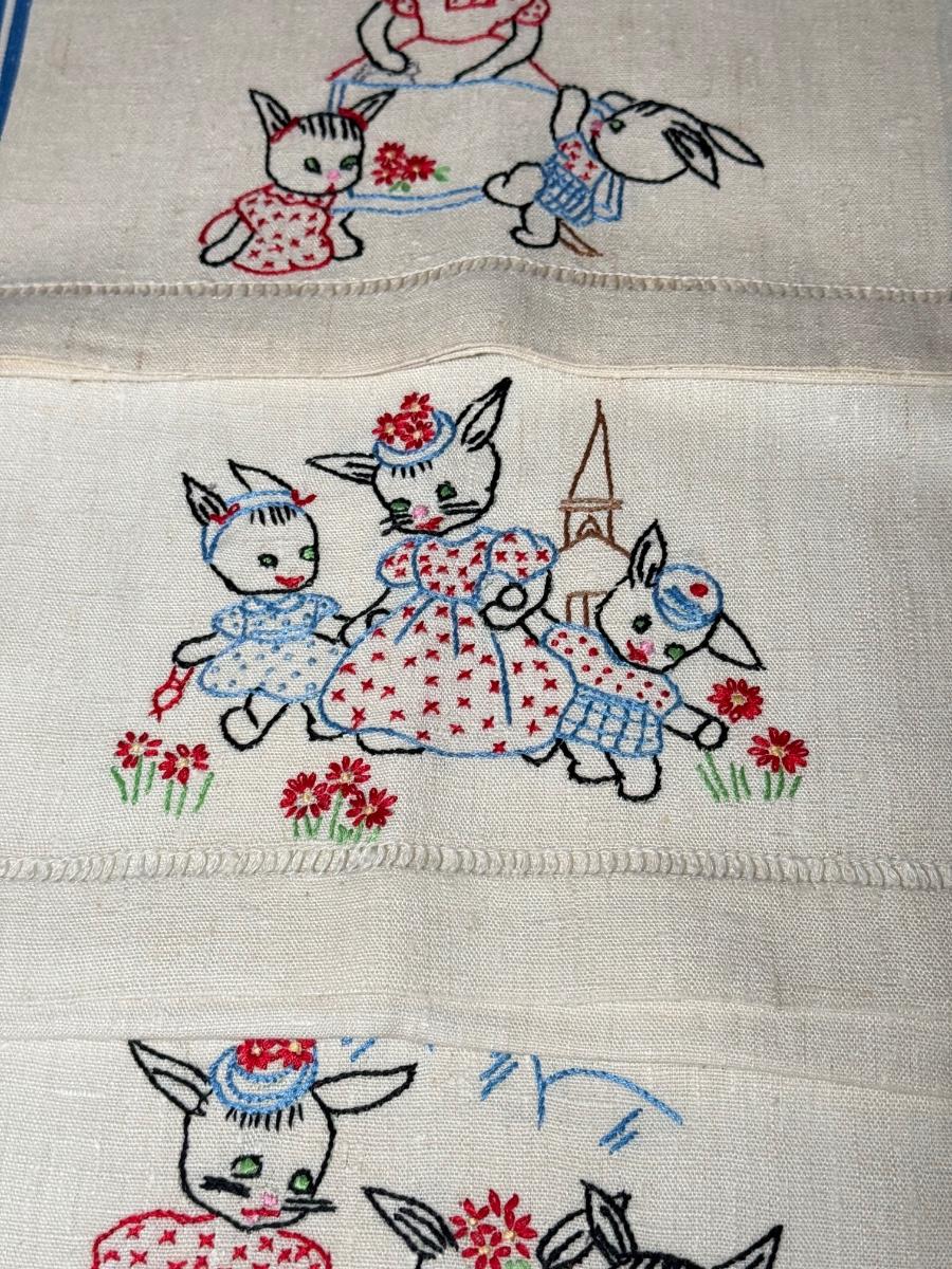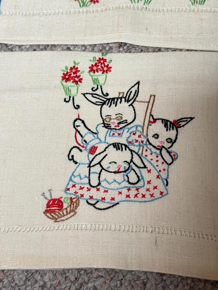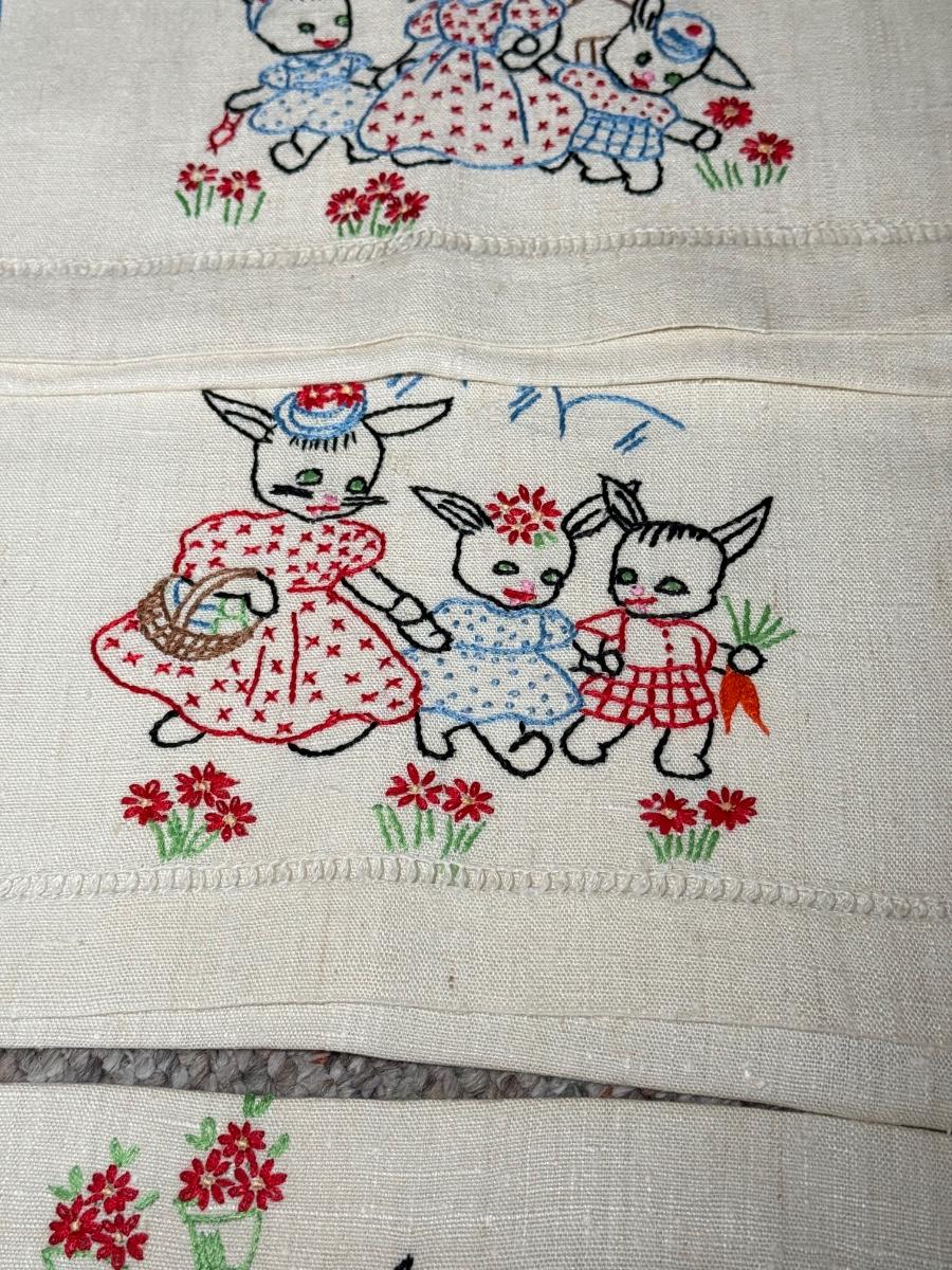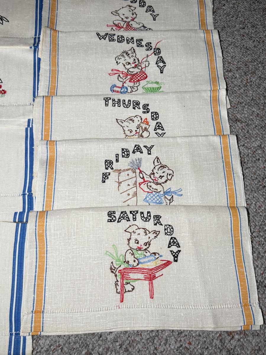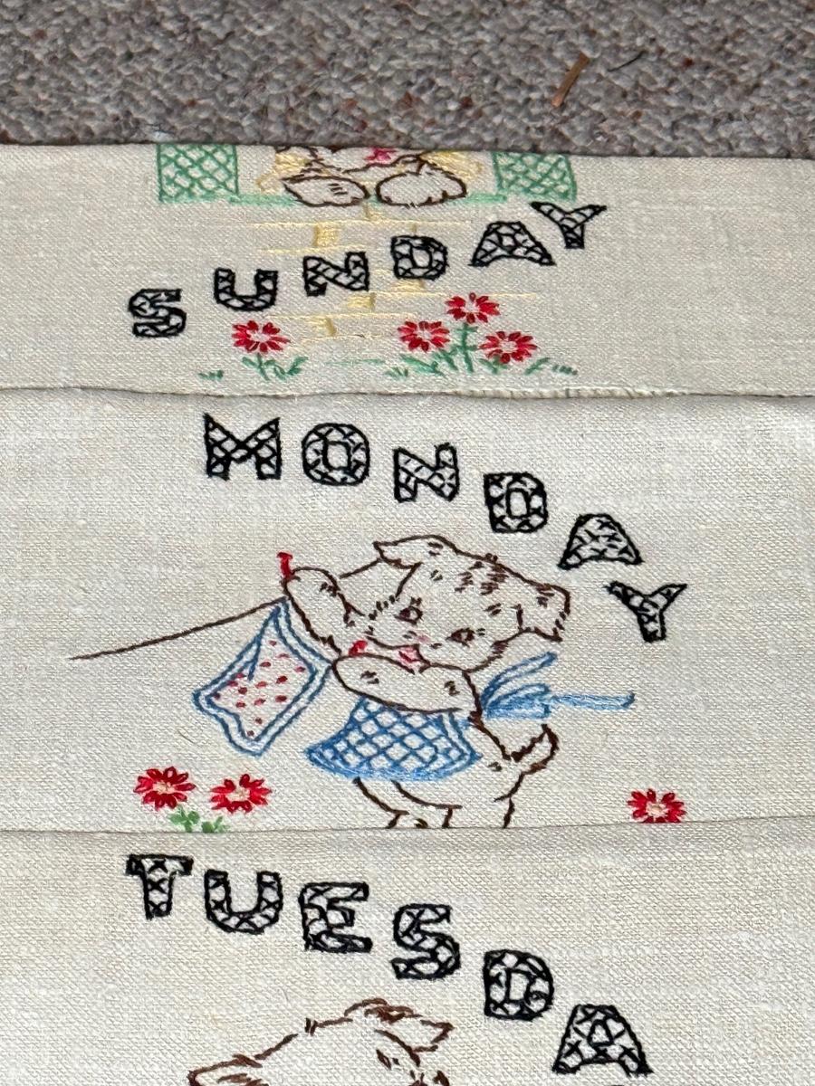 LOT 120D: Adorable Hand Made Embroidered Days of the Week Tea Towels w/ Bunny Rabbit Scene Tea Towels