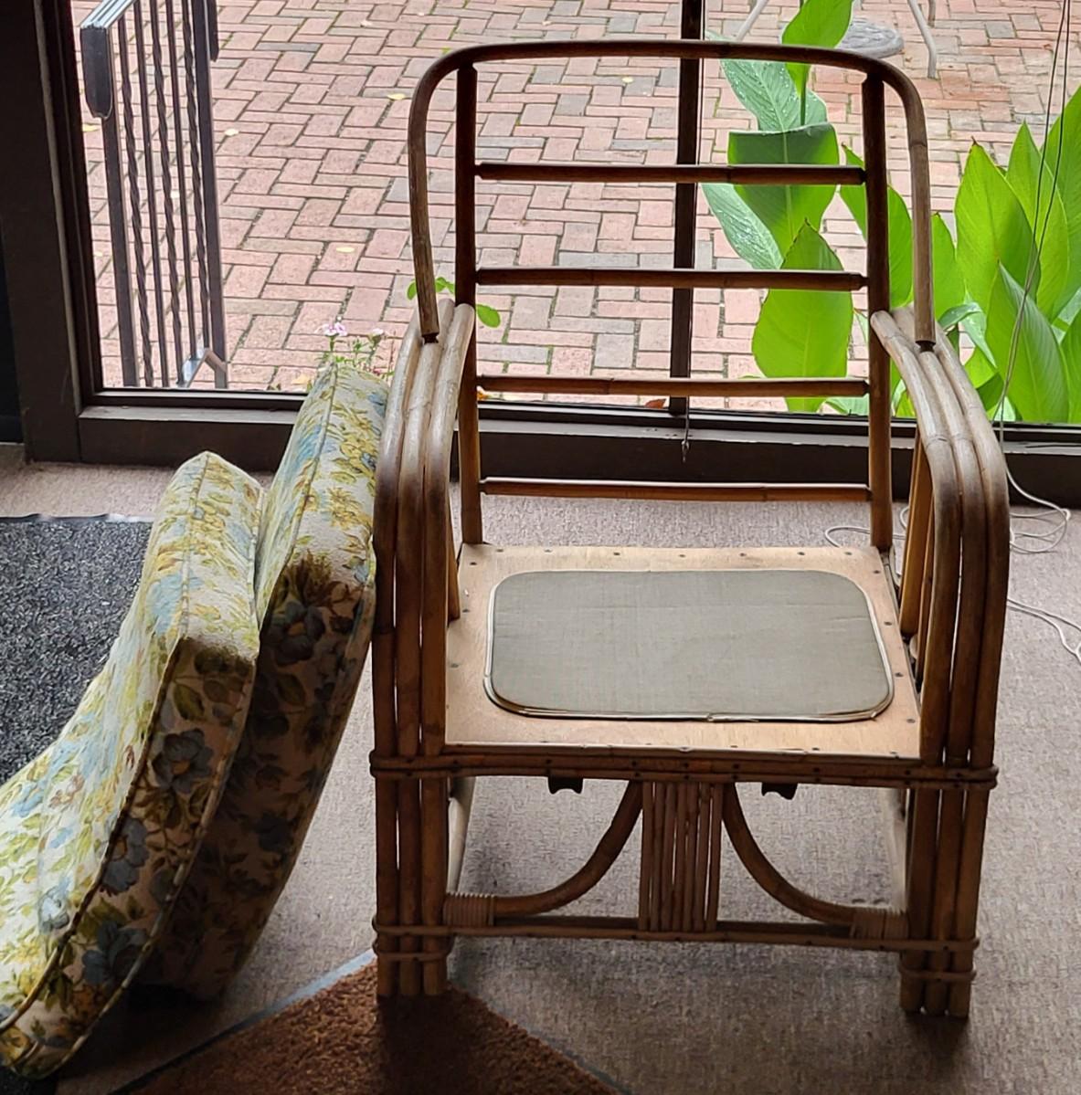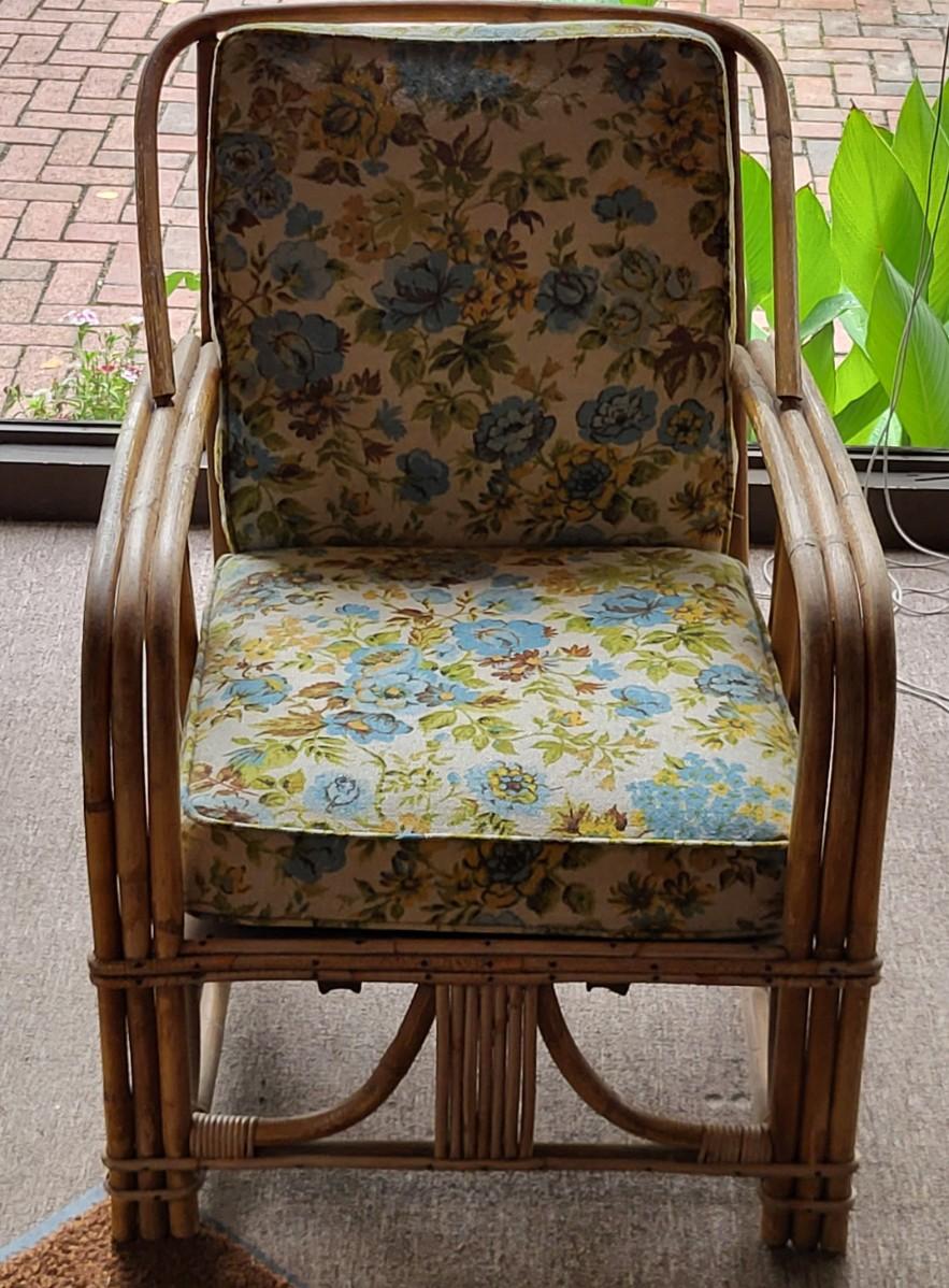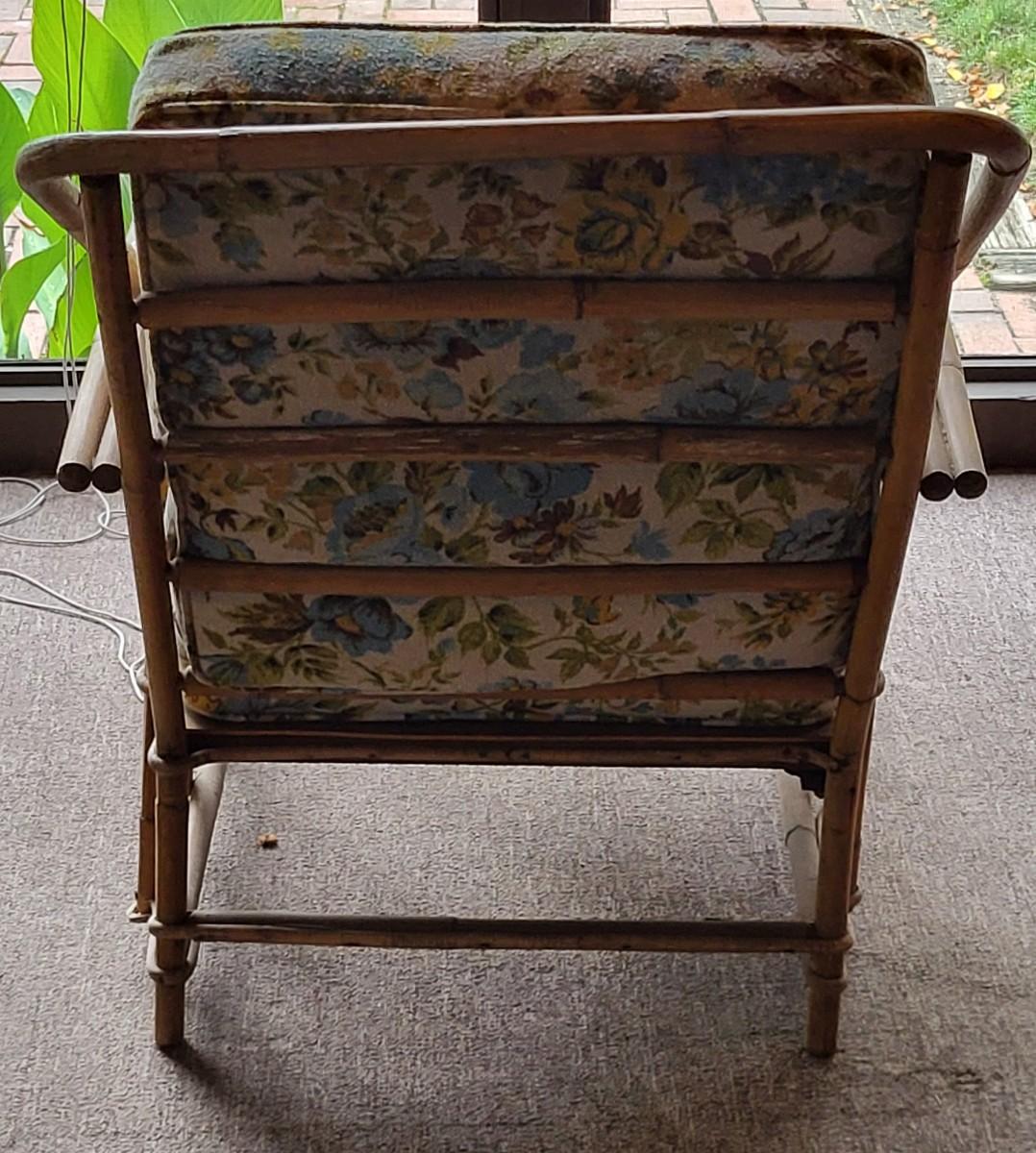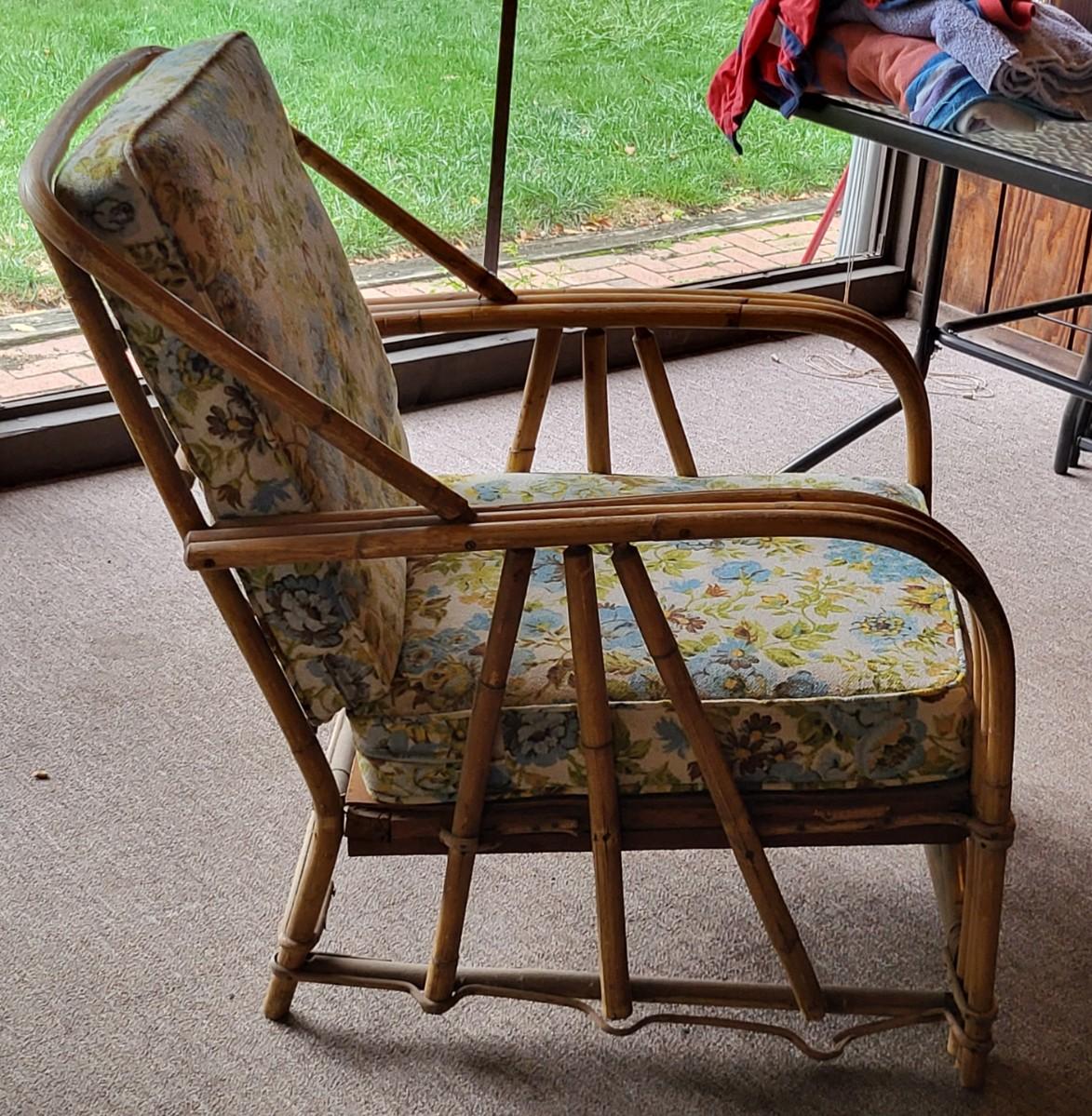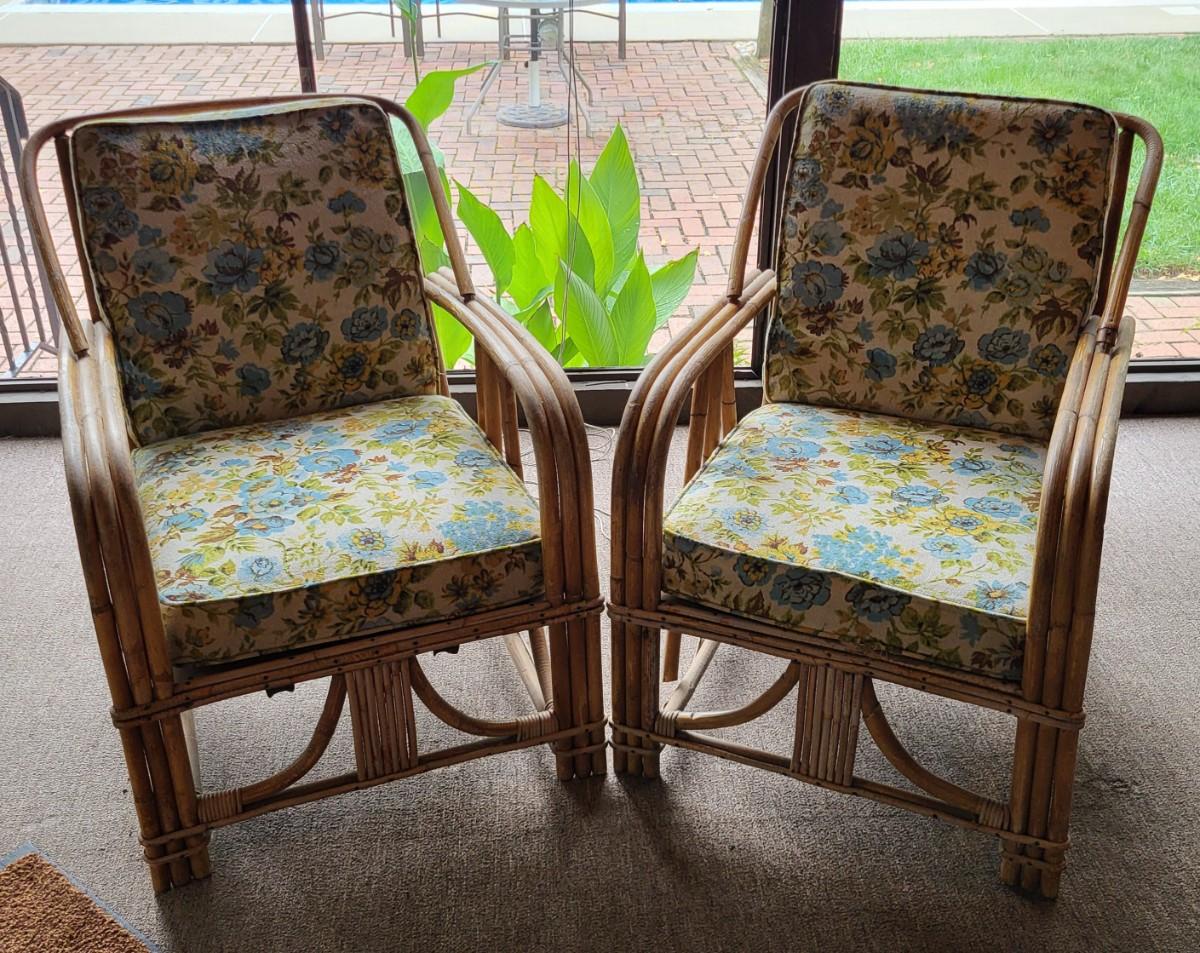 LOT 124P: Pair of Vintage Rattan Bamboo Porch Chairs with Floral Pattern Cushions