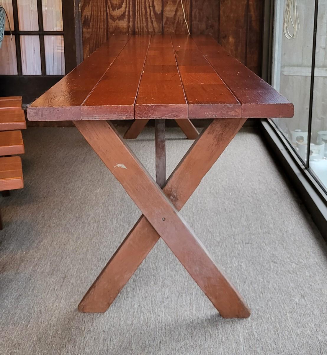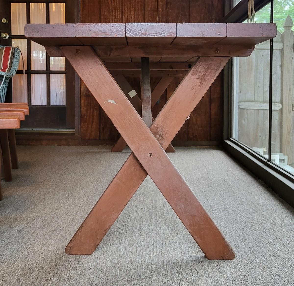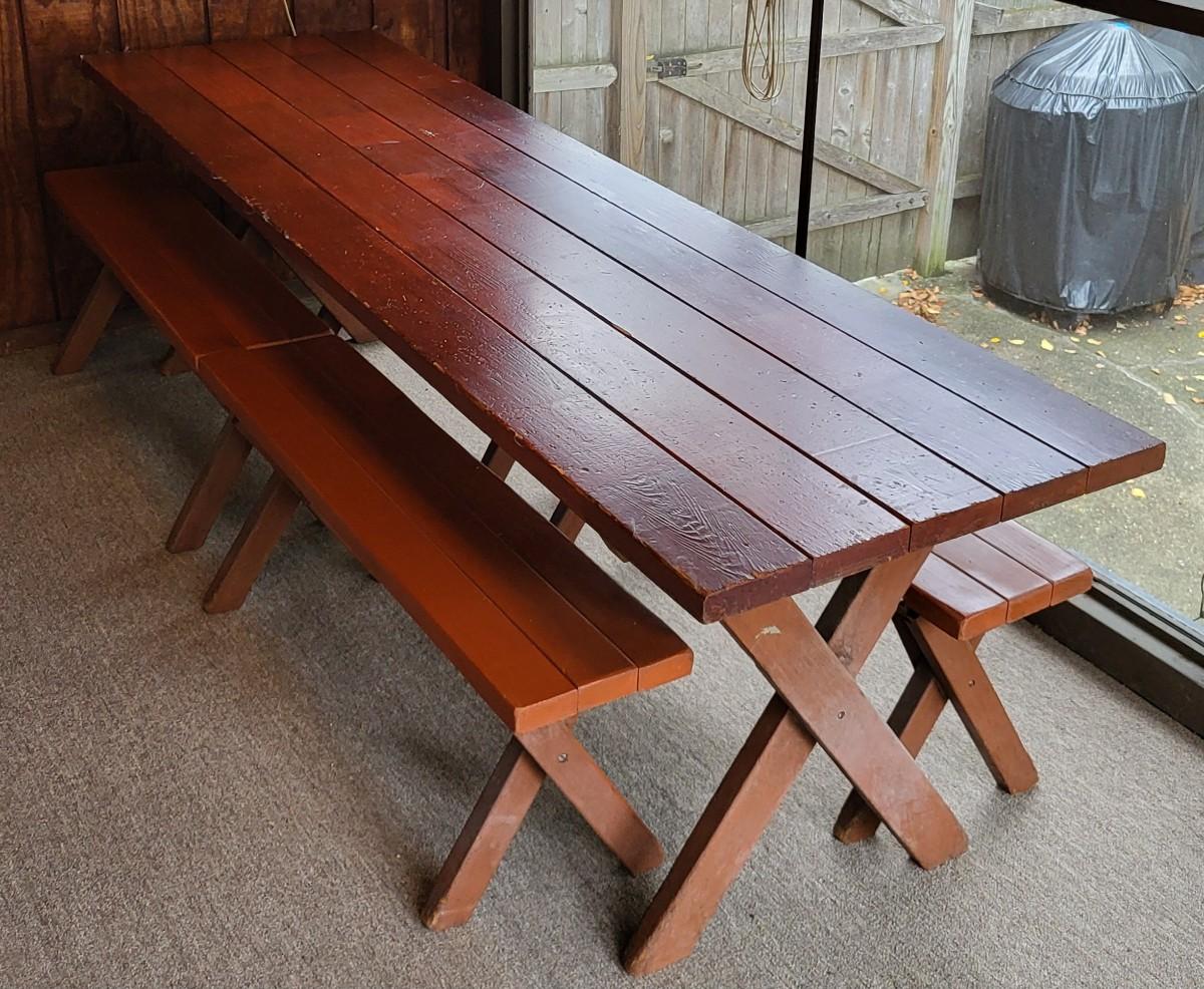 LOT 126P: Long Redwood Picnic Table with Four Bench Chairs