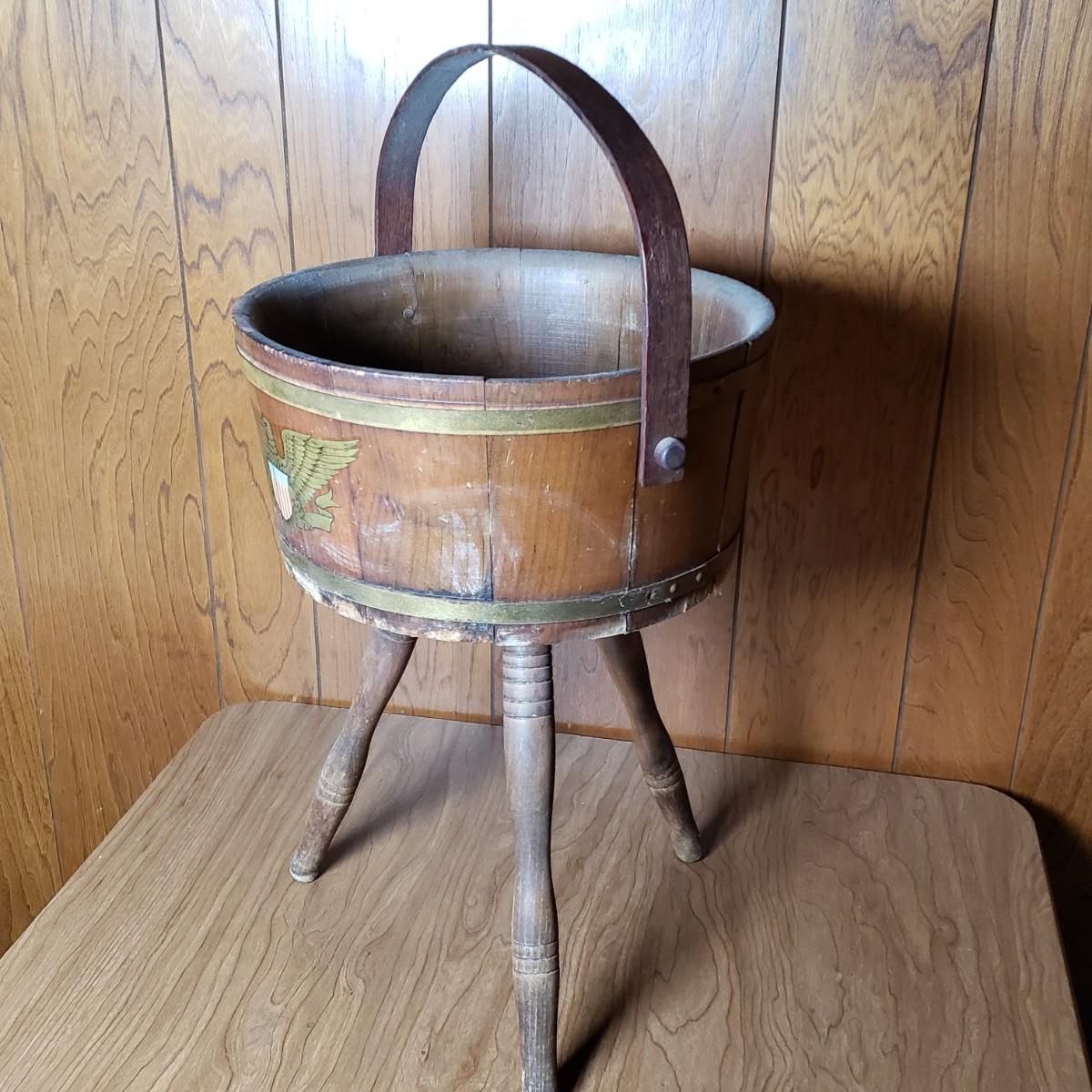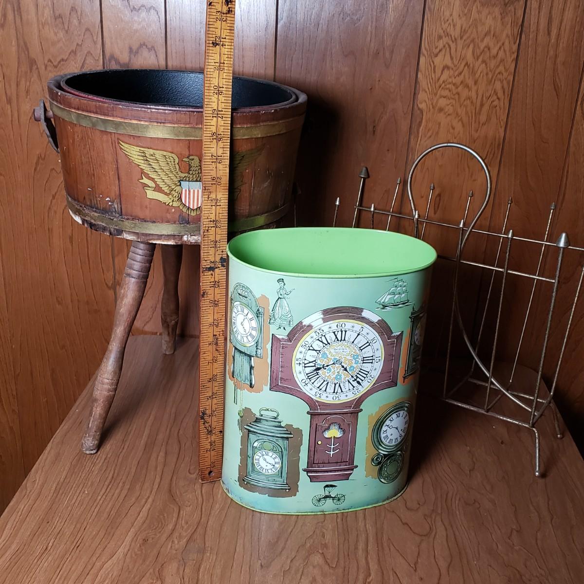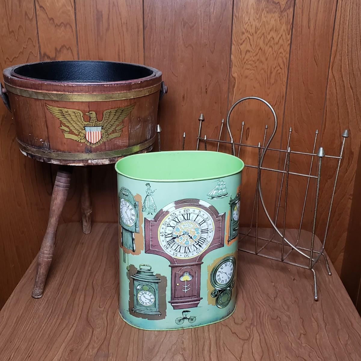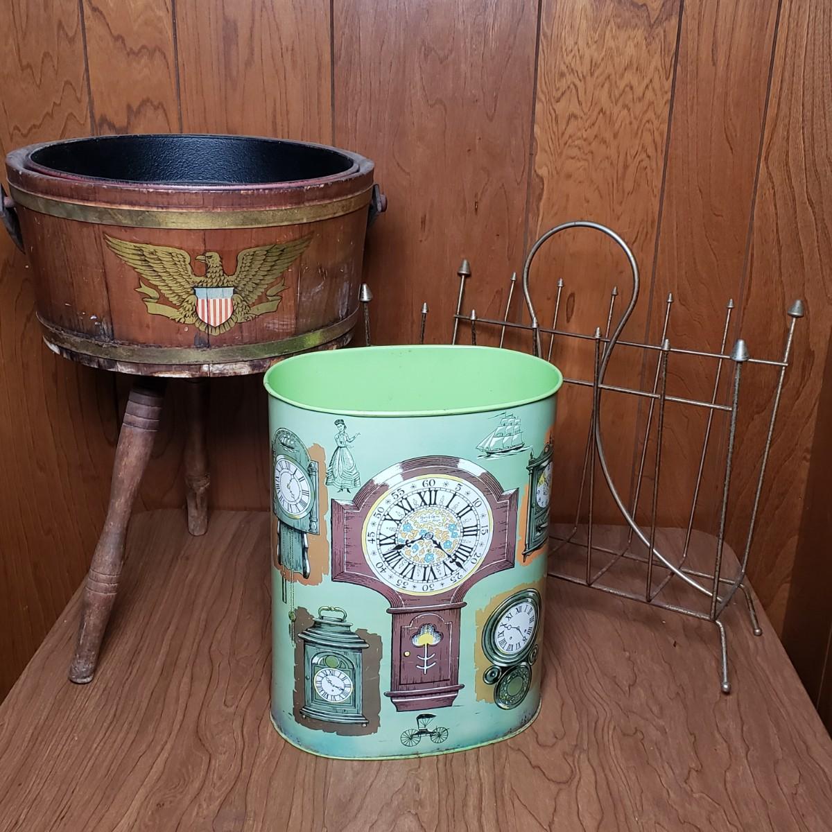 LOT 129L: MCM Decor; Magazine Rack, Wastebasket, Americana Bucket Plantstand
