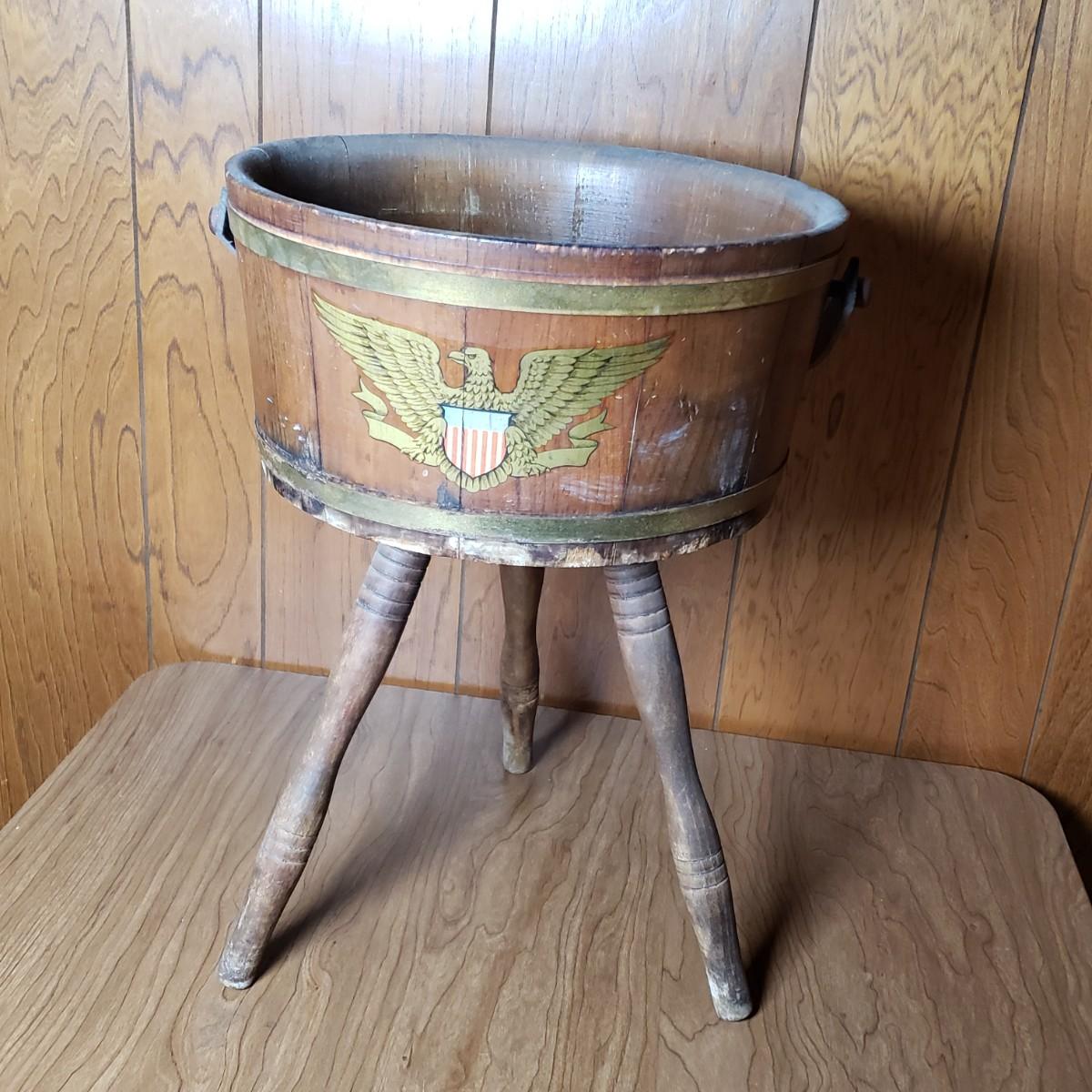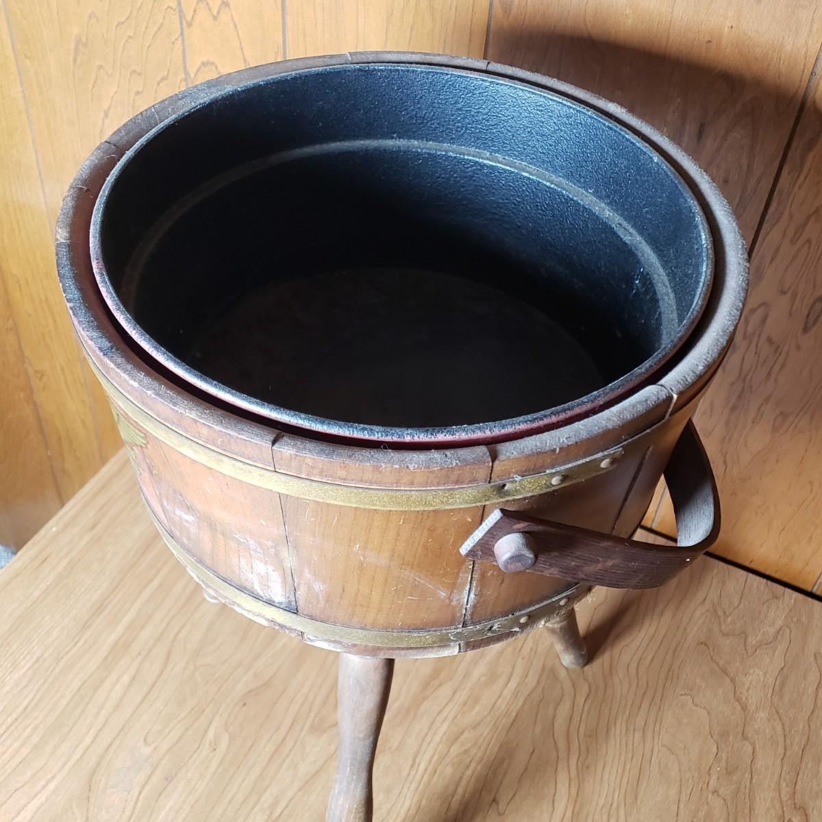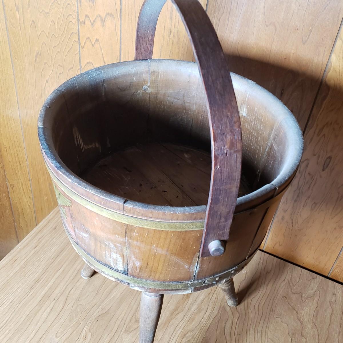 LOT 129L: MCM Decor; Magazine Rack, Wastebasket, Americana Bucket Plantstand