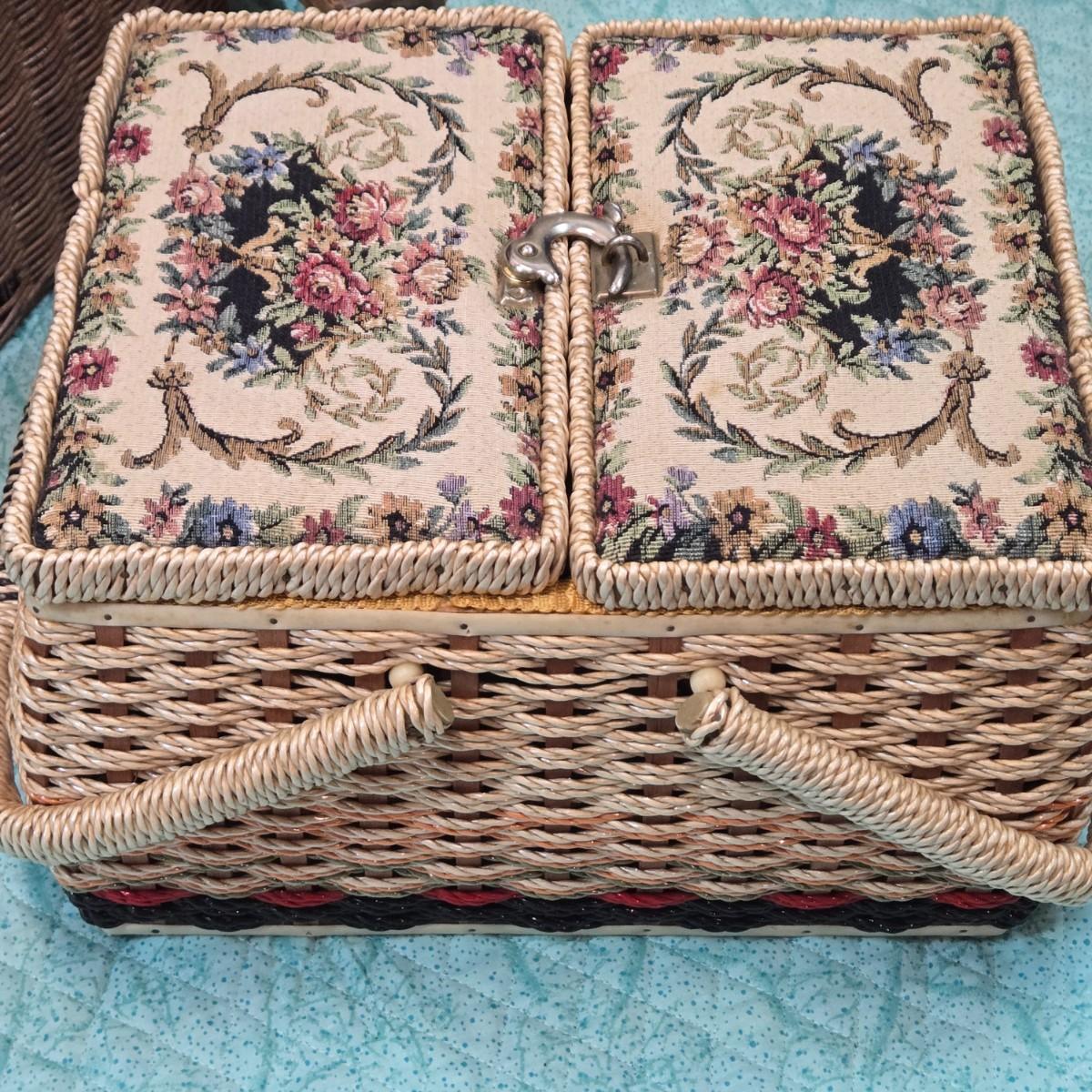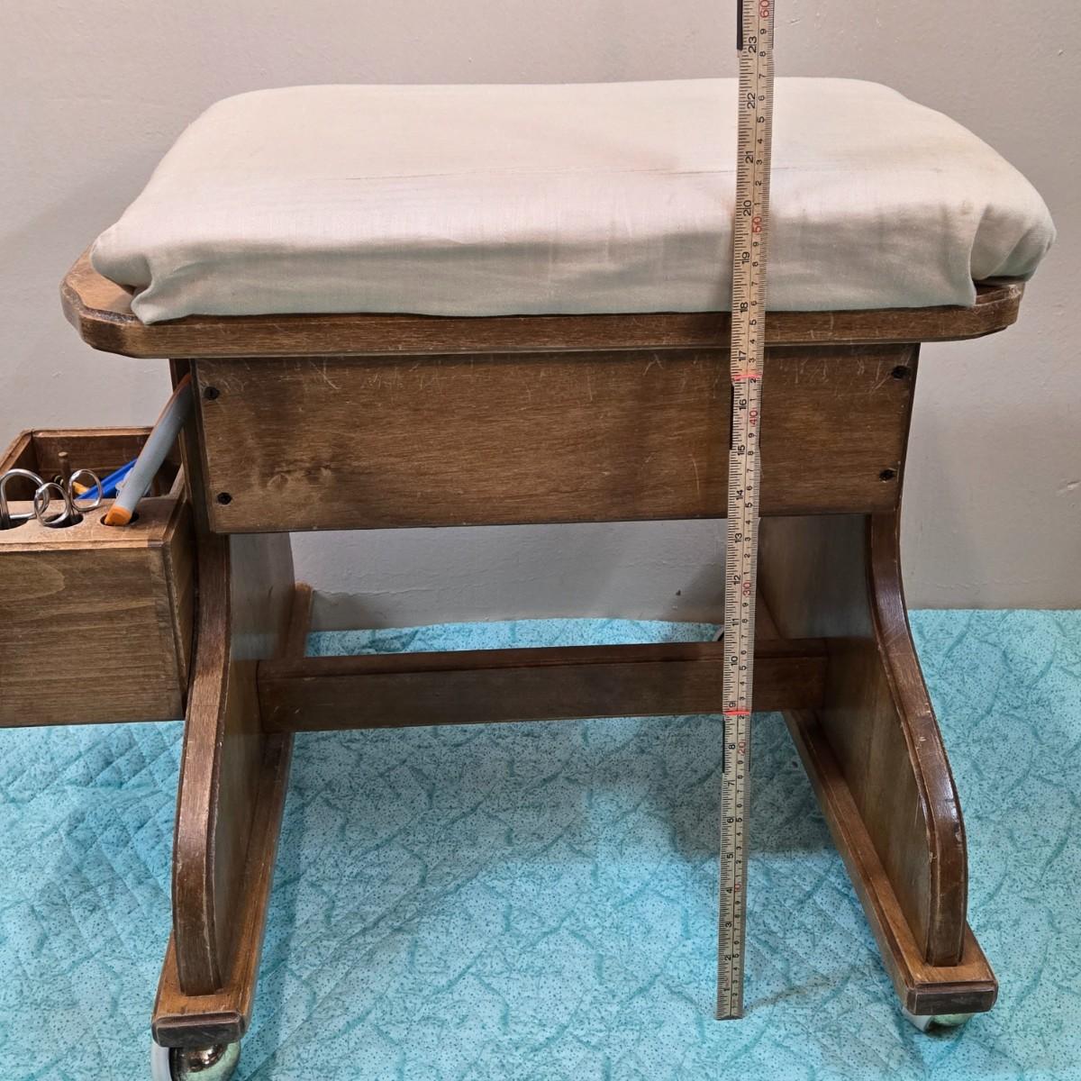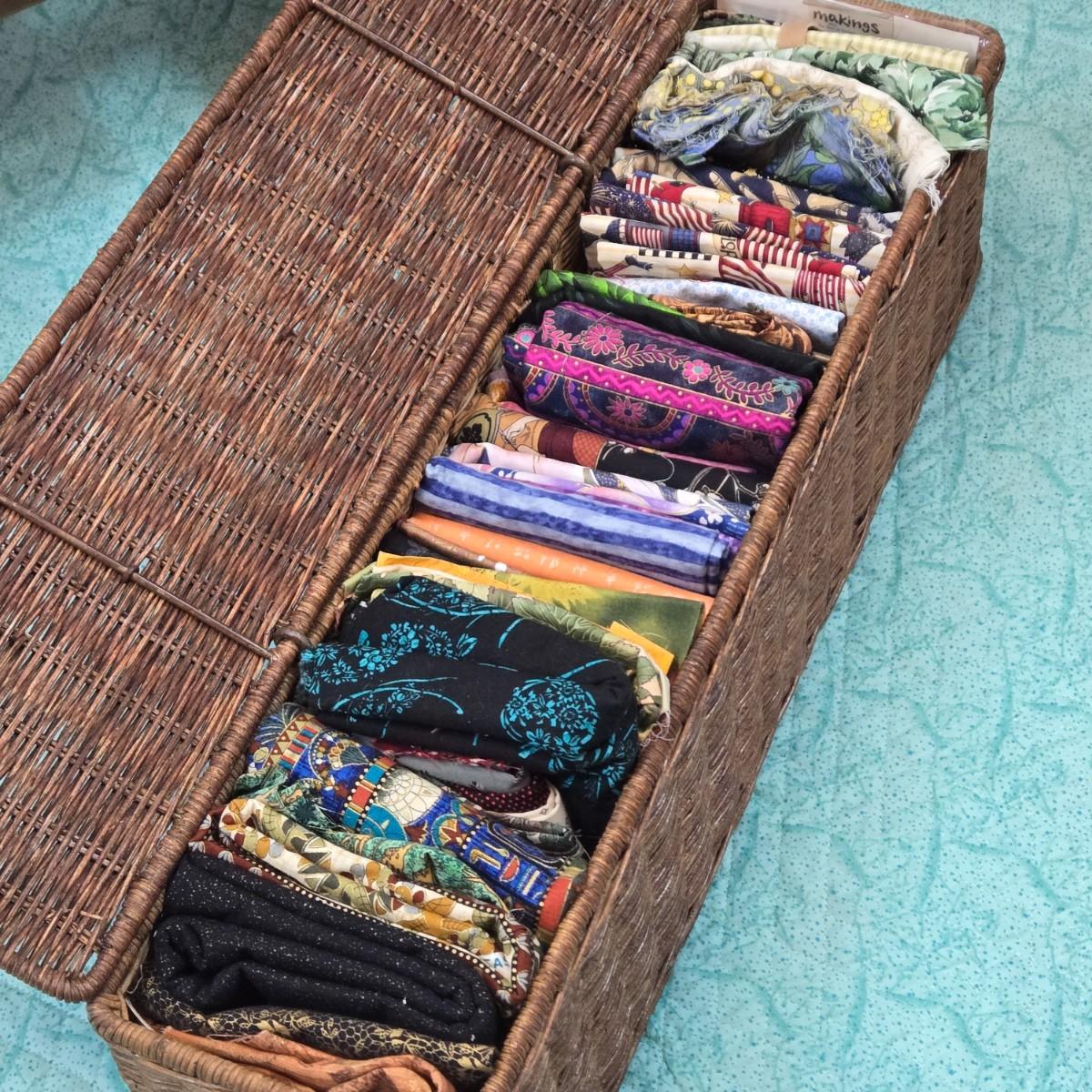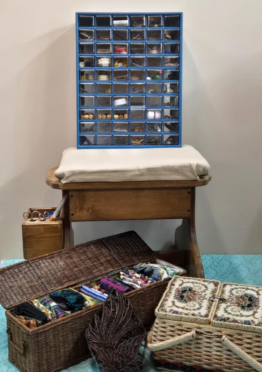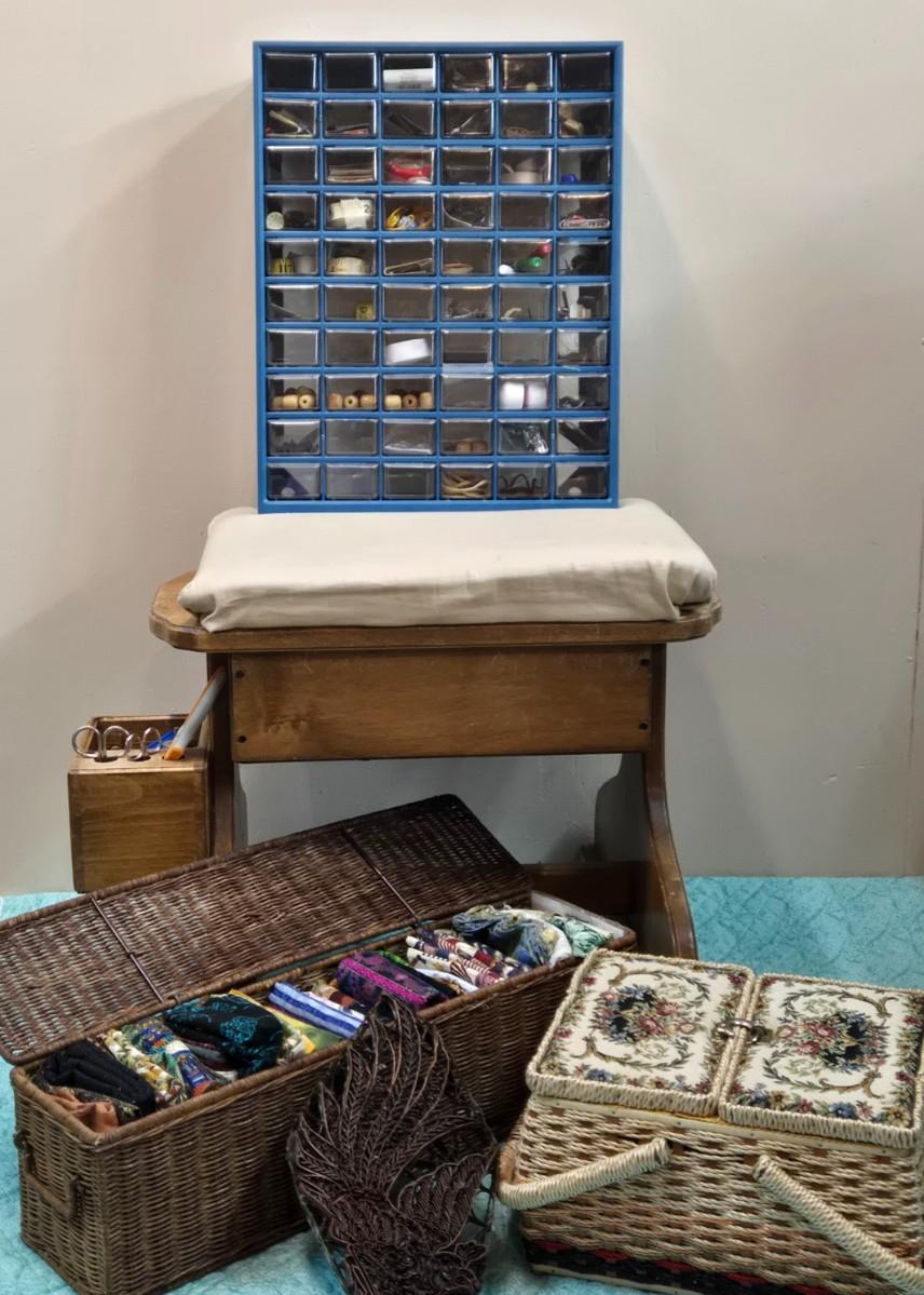 LOT 42A: Sewing Stool with Storage, Plastic Organizer with Sewing Supplies, Basket with Quilting Fabric, Sewing Basket, and Copper Batik Stamp