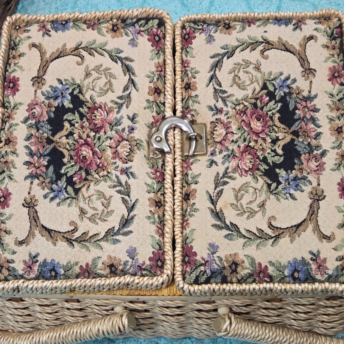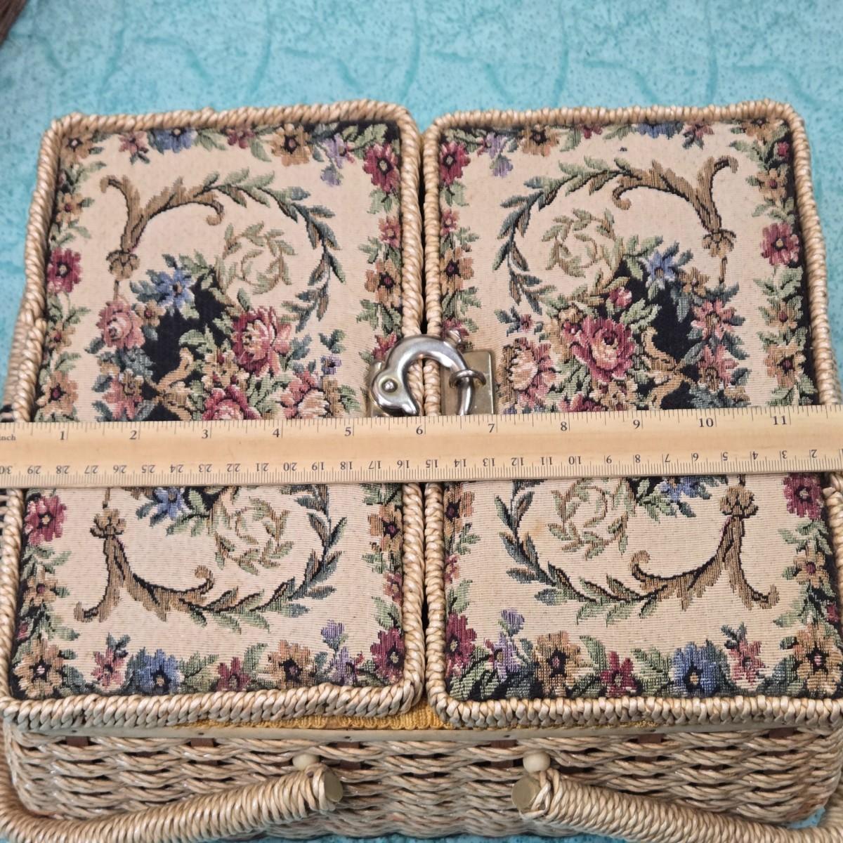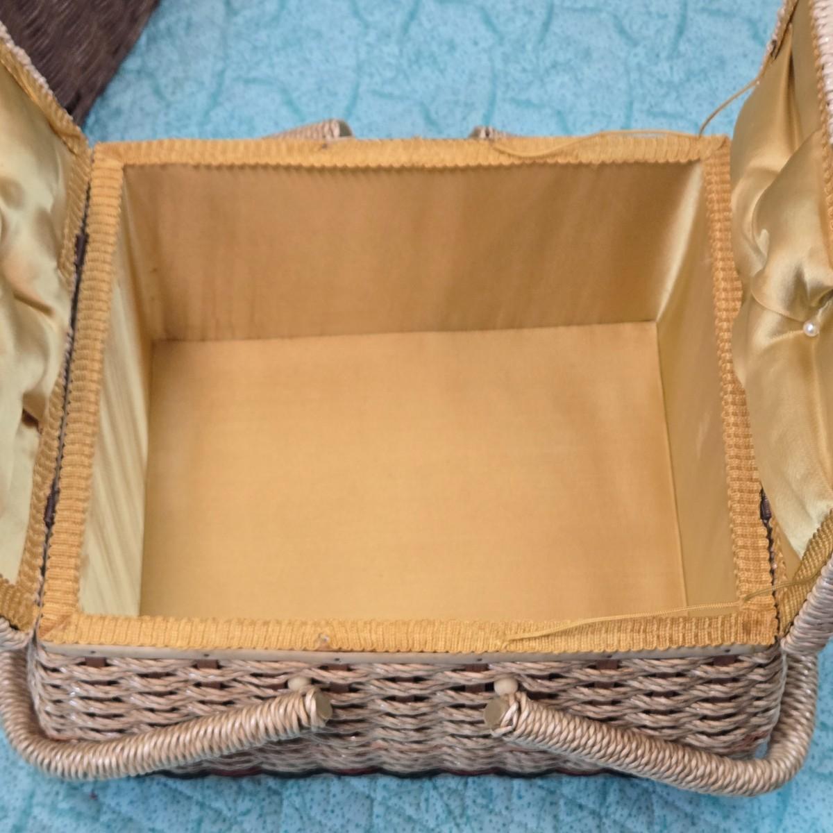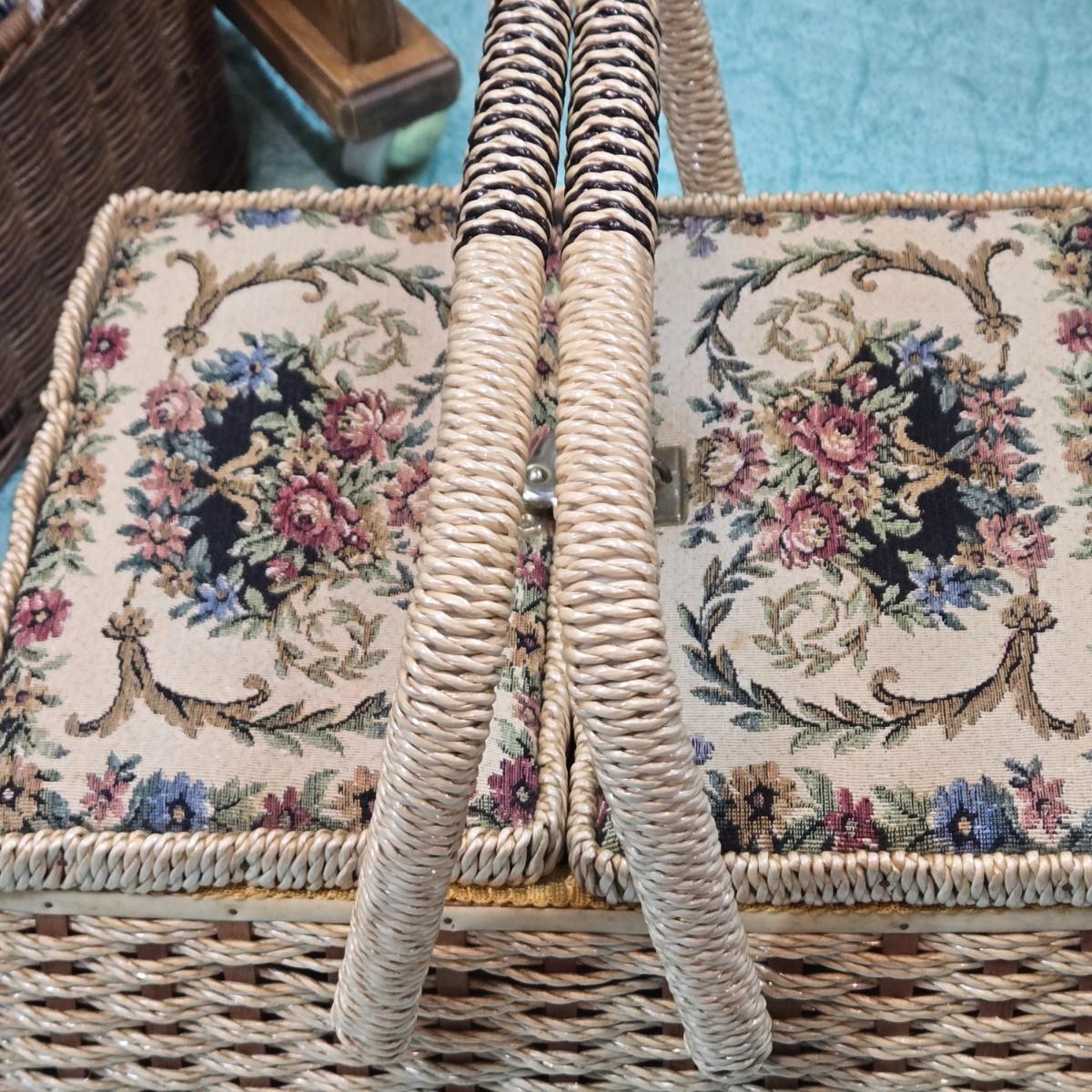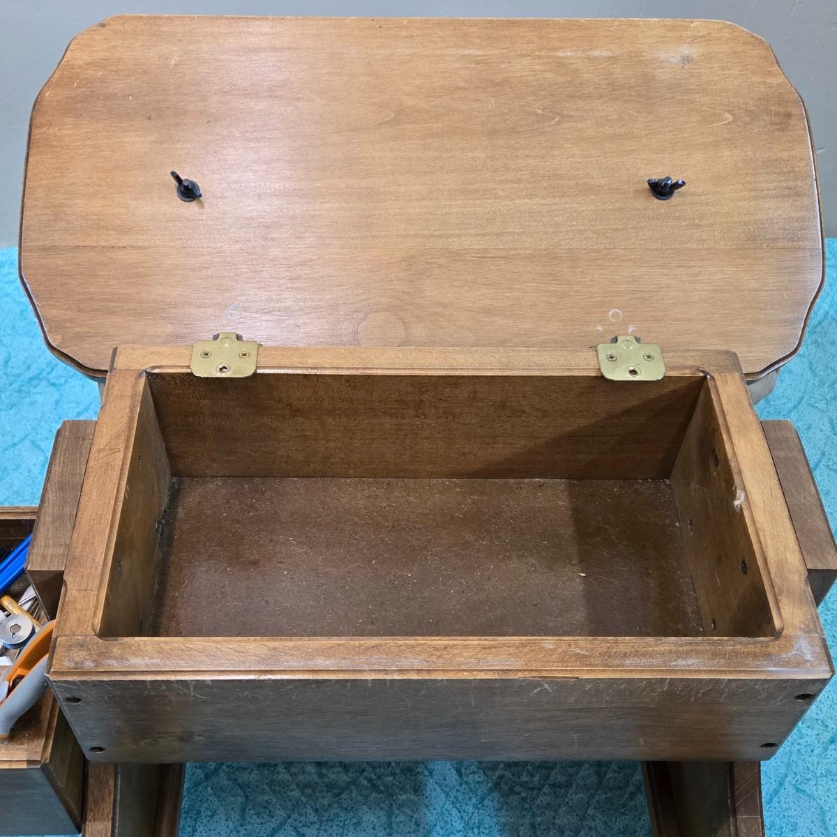 LOT 42A: Sewing Stool with Storage, Plastic Organizer with Sewing Supplies, Basket with Quilting Fabric, Sewing Basket, and Copper Batik Stamp