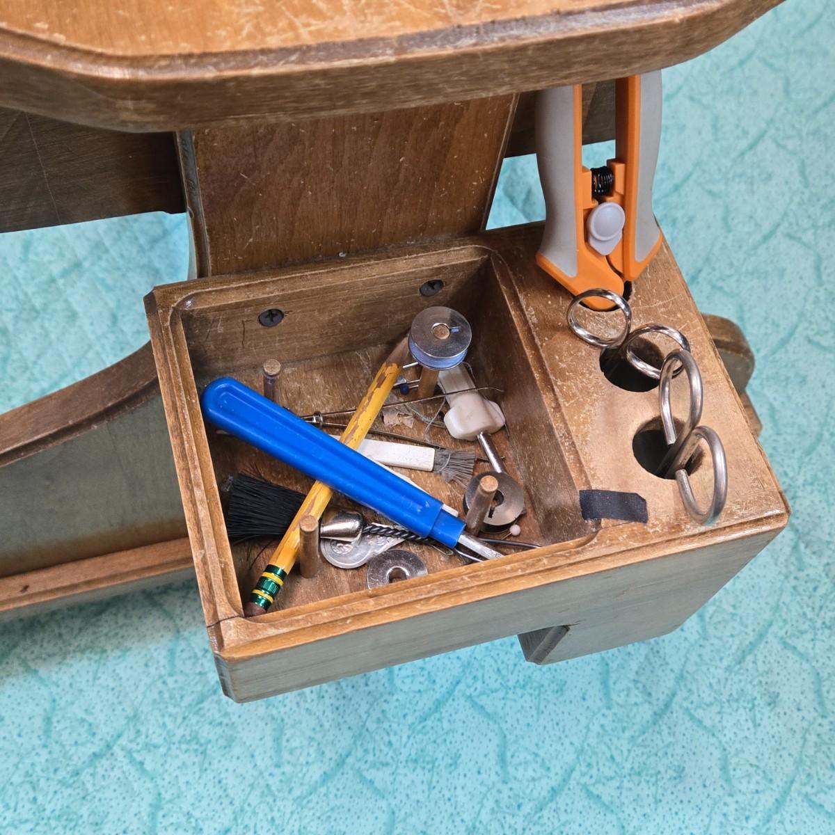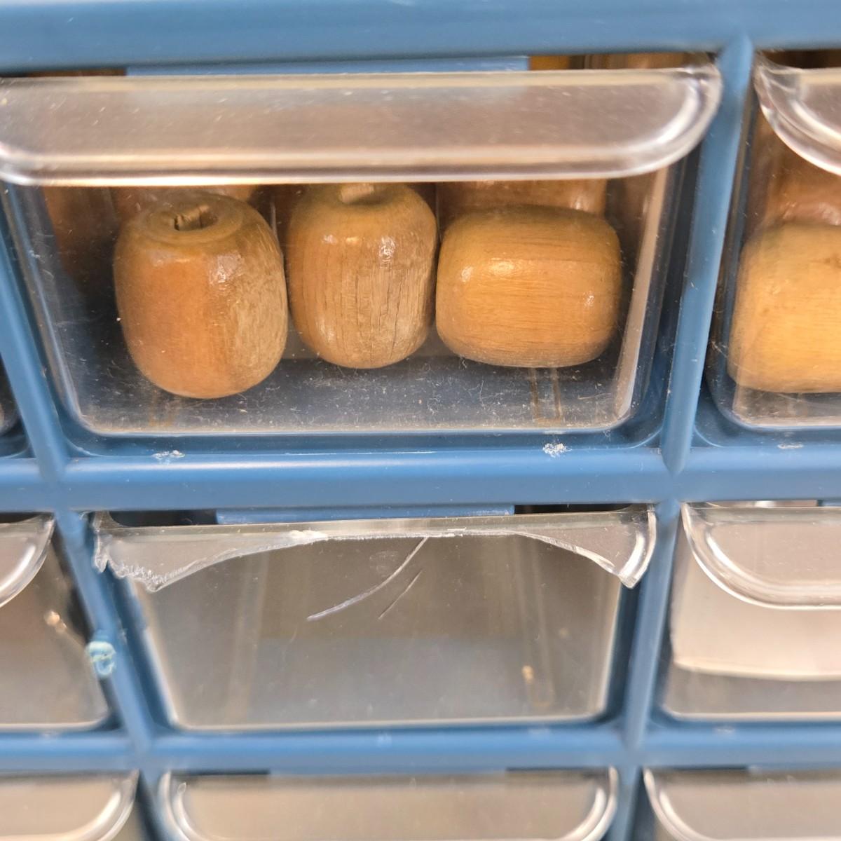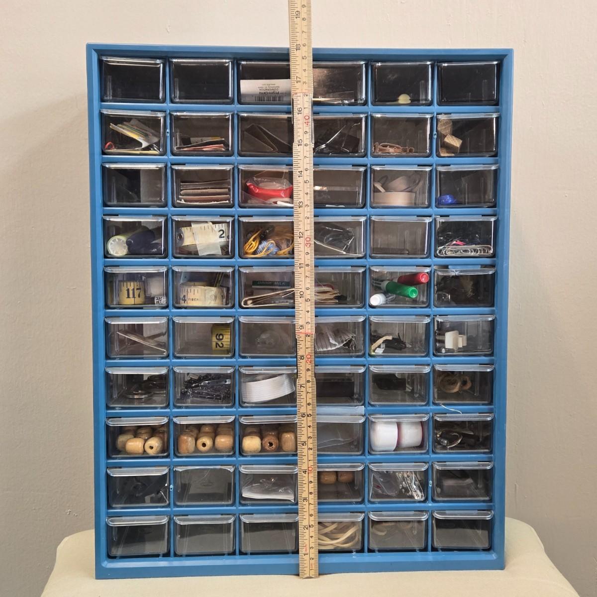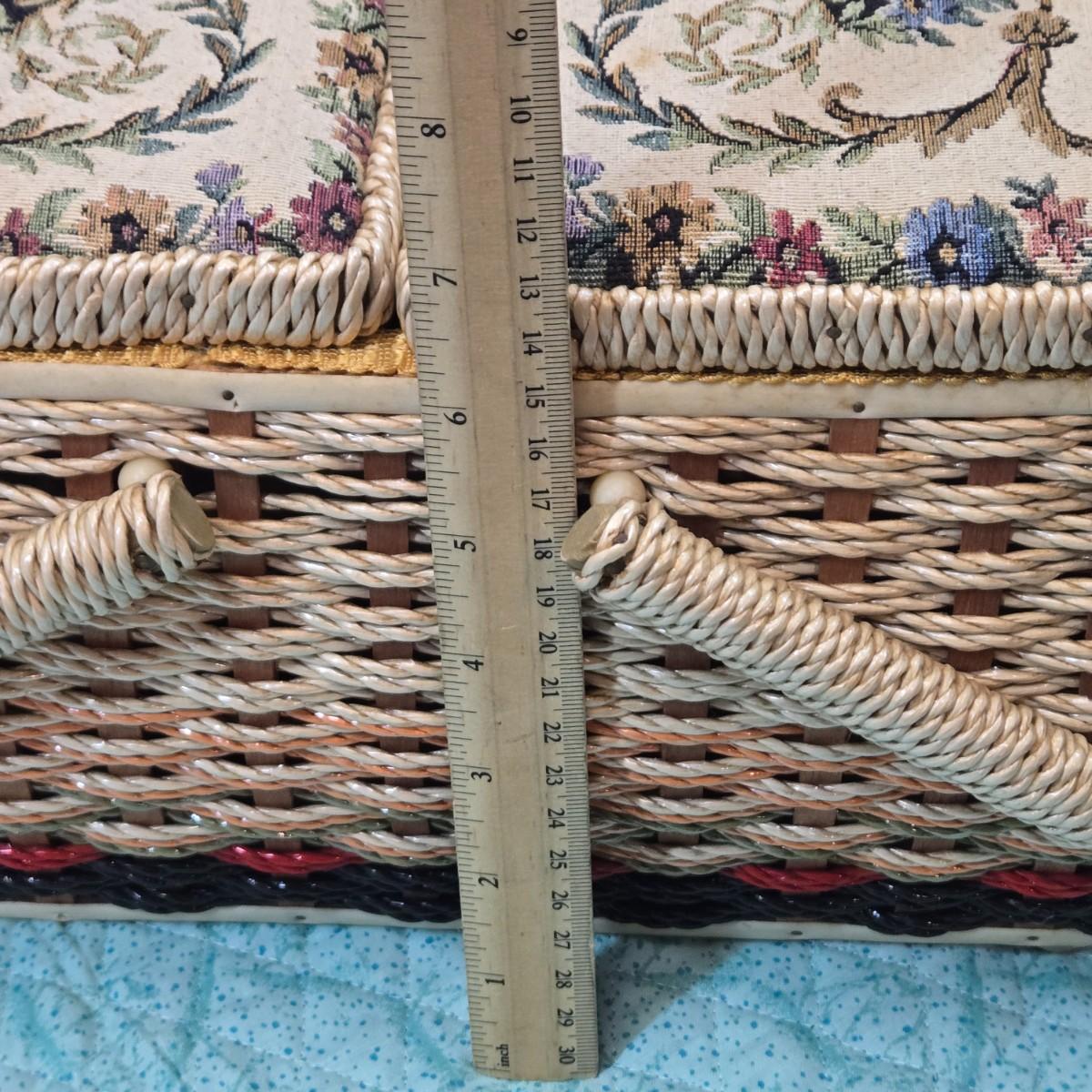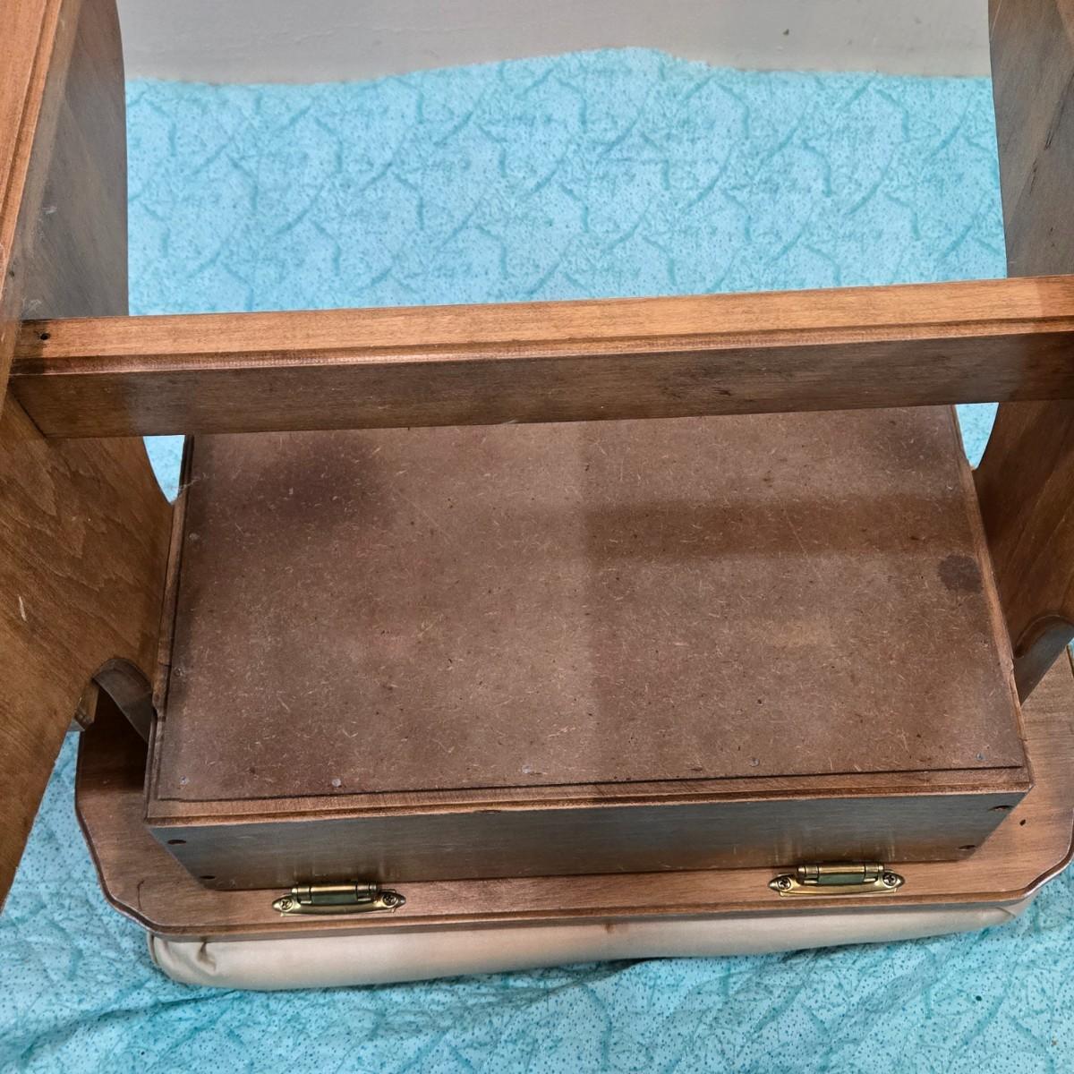 LOT 42A: Sewing Stool with Storage, Plastic Organizer with Sewing Supplies, Basket with Quilting Fabric, Sewing Basket, and Copper Batik Stamp