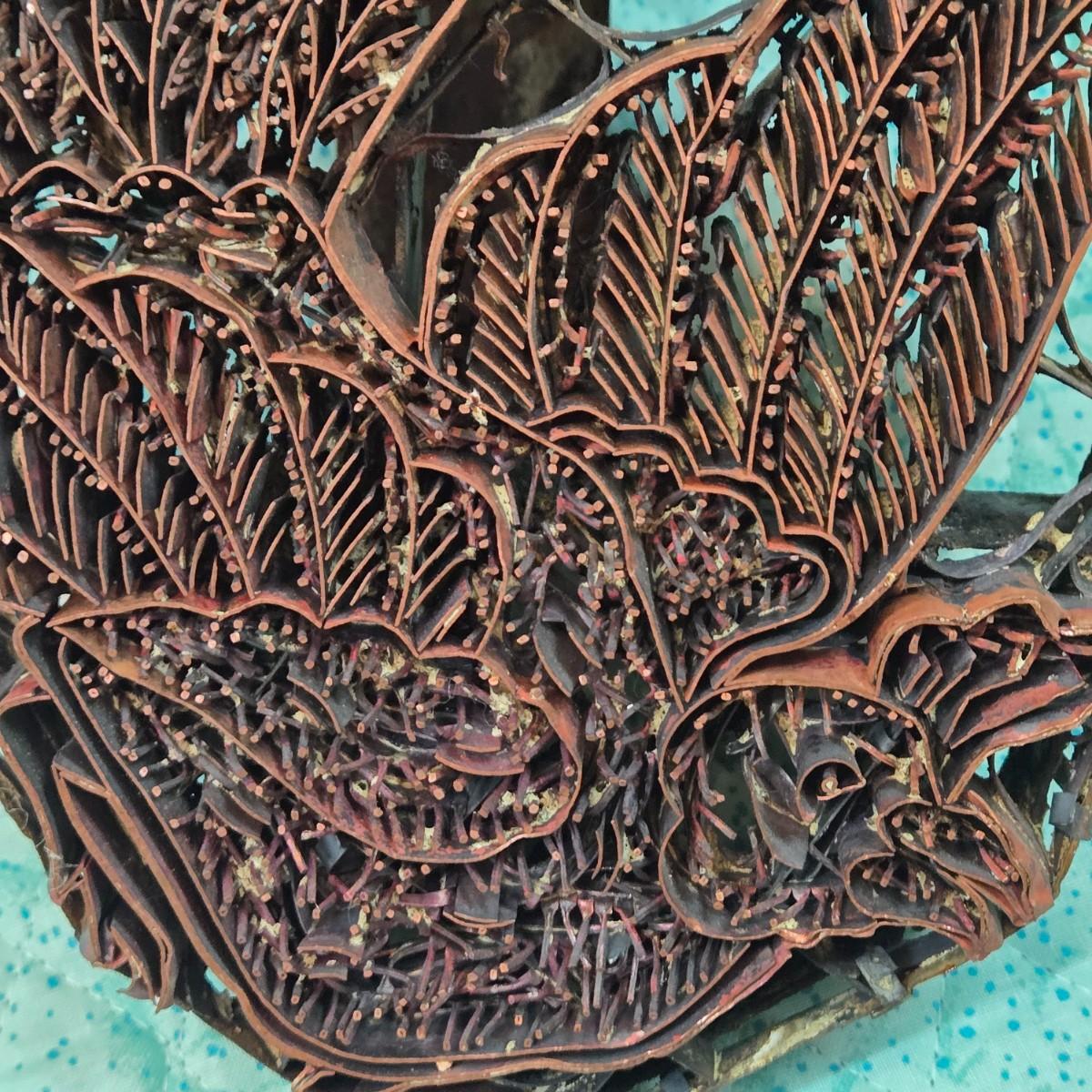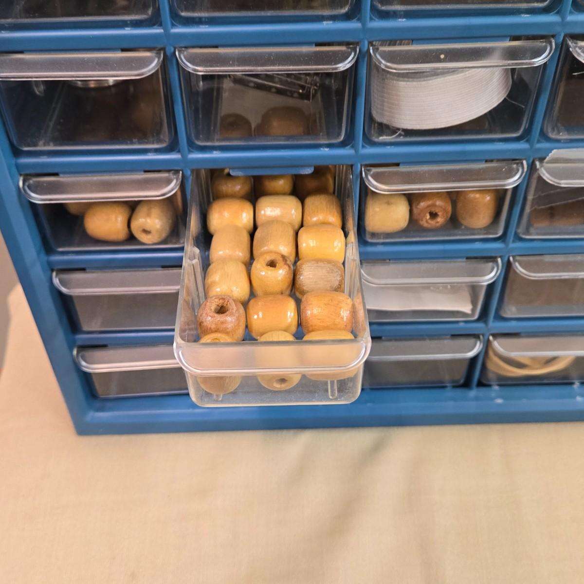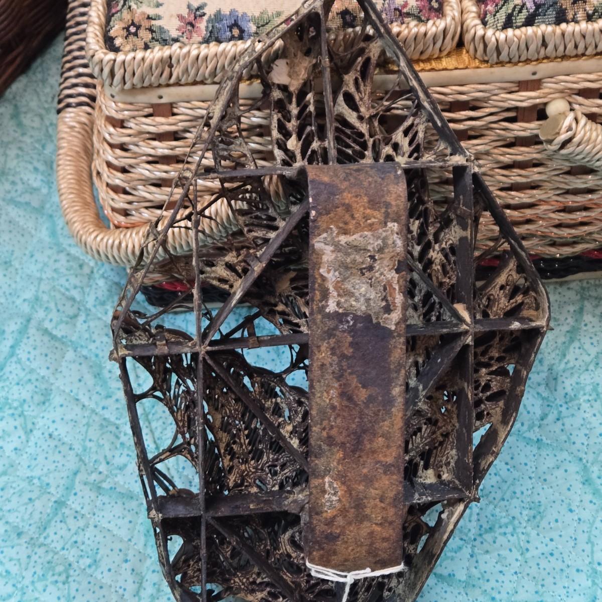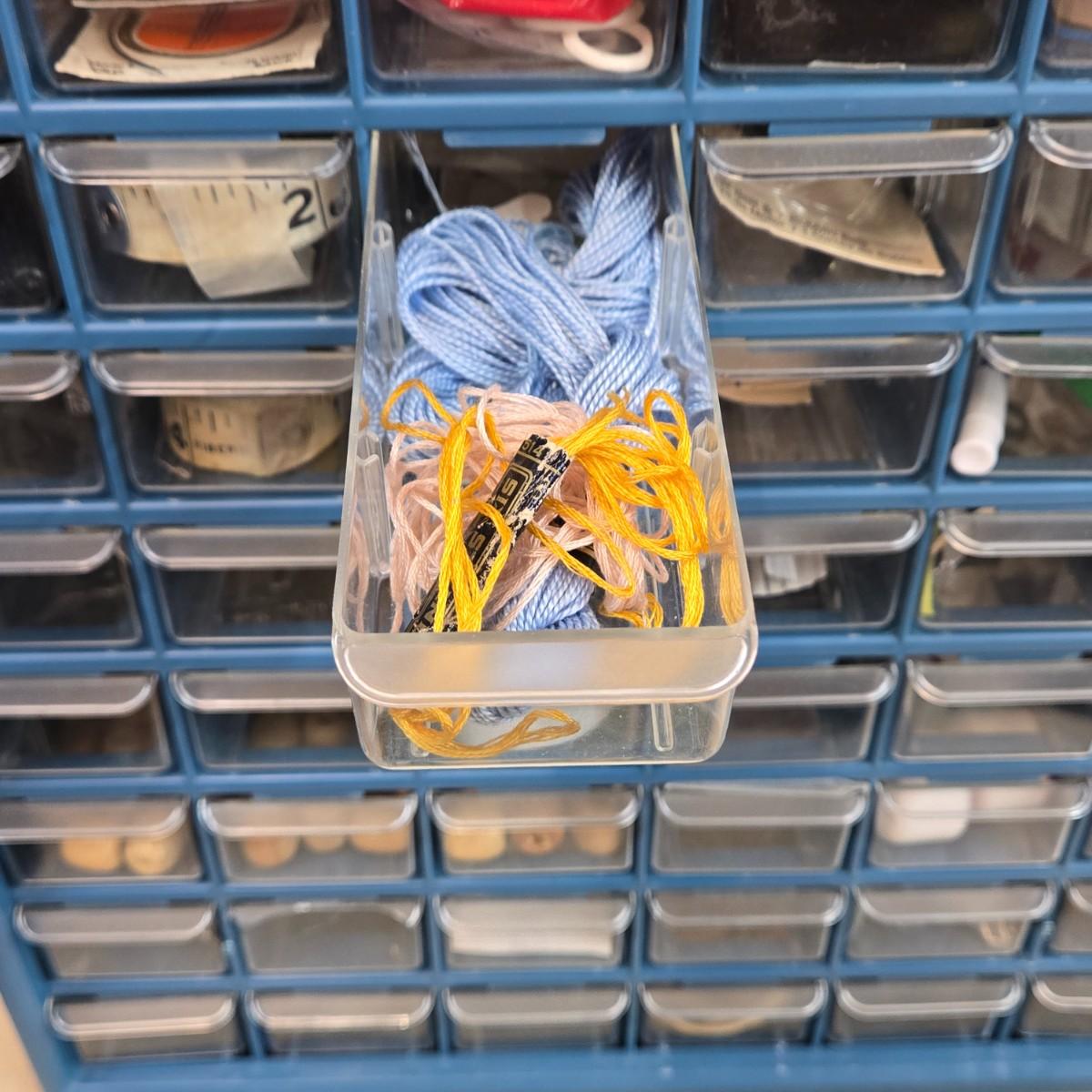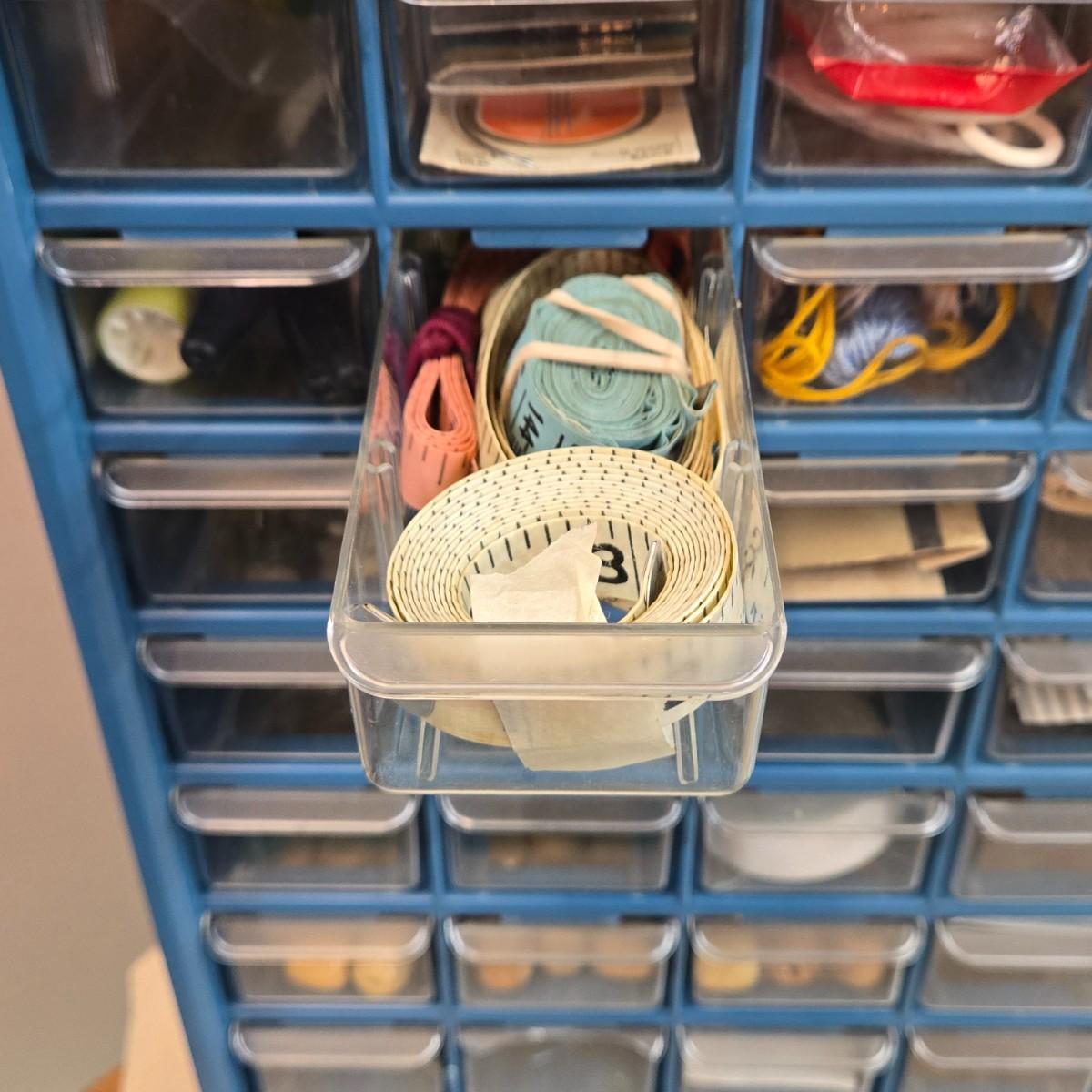 LOT 42A: Sewing Stool with Storage, Plastic Organizer with Sewing Supplies, Basket with Quilting Fabric, Sewing Basket, and Copper Batik Stamp